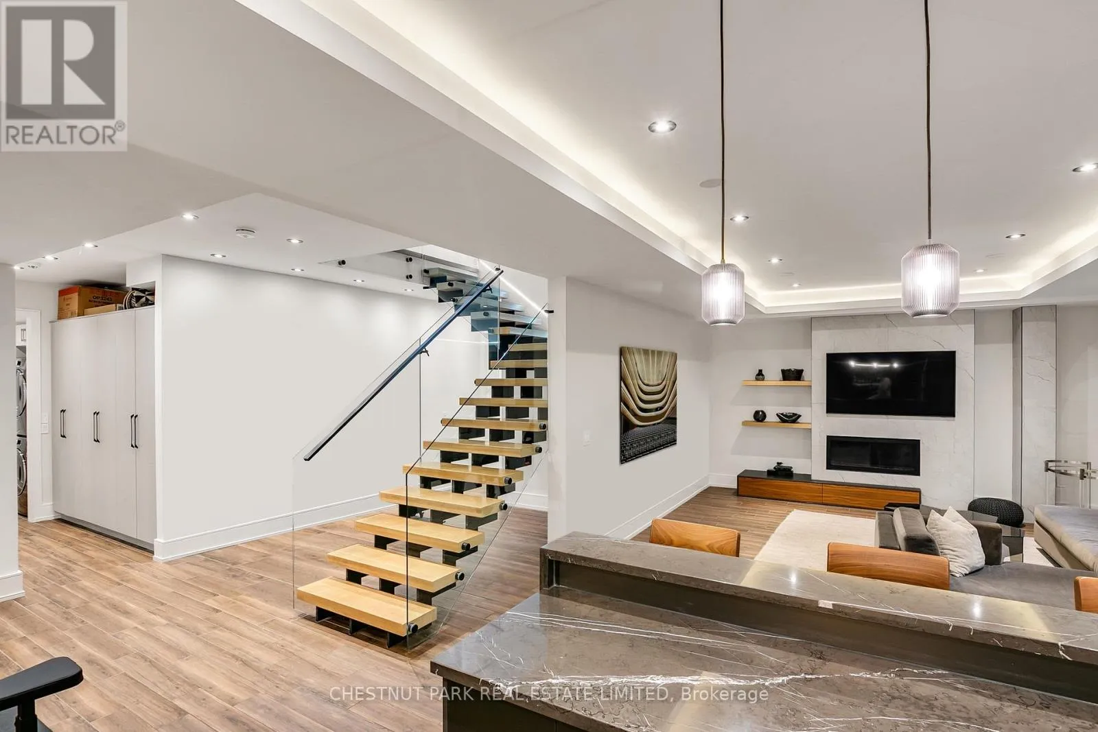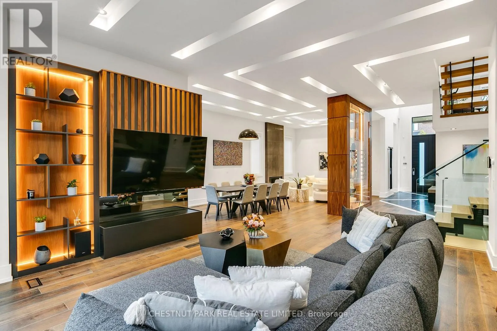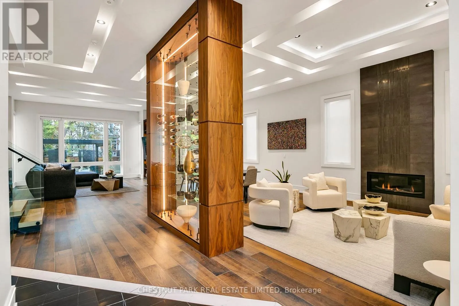 Outfitted with dual islands, a pantry, custom solid wood cabinetry with full-size porcelain slab doors, quartz countertops, matching backsplash & top-tier Wolf & Sub-Zero appliances, it is a showstopper. An architectural staircase with laser-cut, no-joint metal stringers, 3" solid white oak risers & glass railings is a central design feature. The home includes an elevator, a lit-up custom glass wine & art display & 2 laundry rooms. The primary suite is a private retreat, complete with two walk-in closets & a spa-inspired ensuite featuring a soaker tub & a skylit shower. A stunning mezzanine office (or den) overlooks the main floor, creating a dramatic, yet functional workspace. All Bedrooms have their own ensuite bathrooms. The lower level is well thought out, with over 9 ft ceilings, radiant heated floors, a bar, custom built-ins, a rec room with walkout to the yard, 2nd laundry room, gym, a powder room & a guest bedroom with an ensuite bath. The heated tile floors in the foyer & primary ensuite, professional landscaping, 11 skylights, 3 fireplaces, smart home system with features allowing you to monitor & manage the home even if you are halfway across the world, state-of-the-art alarm system, heated driveway, generator & a 2-car garage with EV charger round out the homes extensive list of luxuries.Set on a rare 50 ft lot, with professional landscaping (& room for a pool) this 4+1 bed, 7 bath home has architectural details at every turn, showcasing the perfect blend of modern innovation, sleek design & everyday comfort (id:27476)