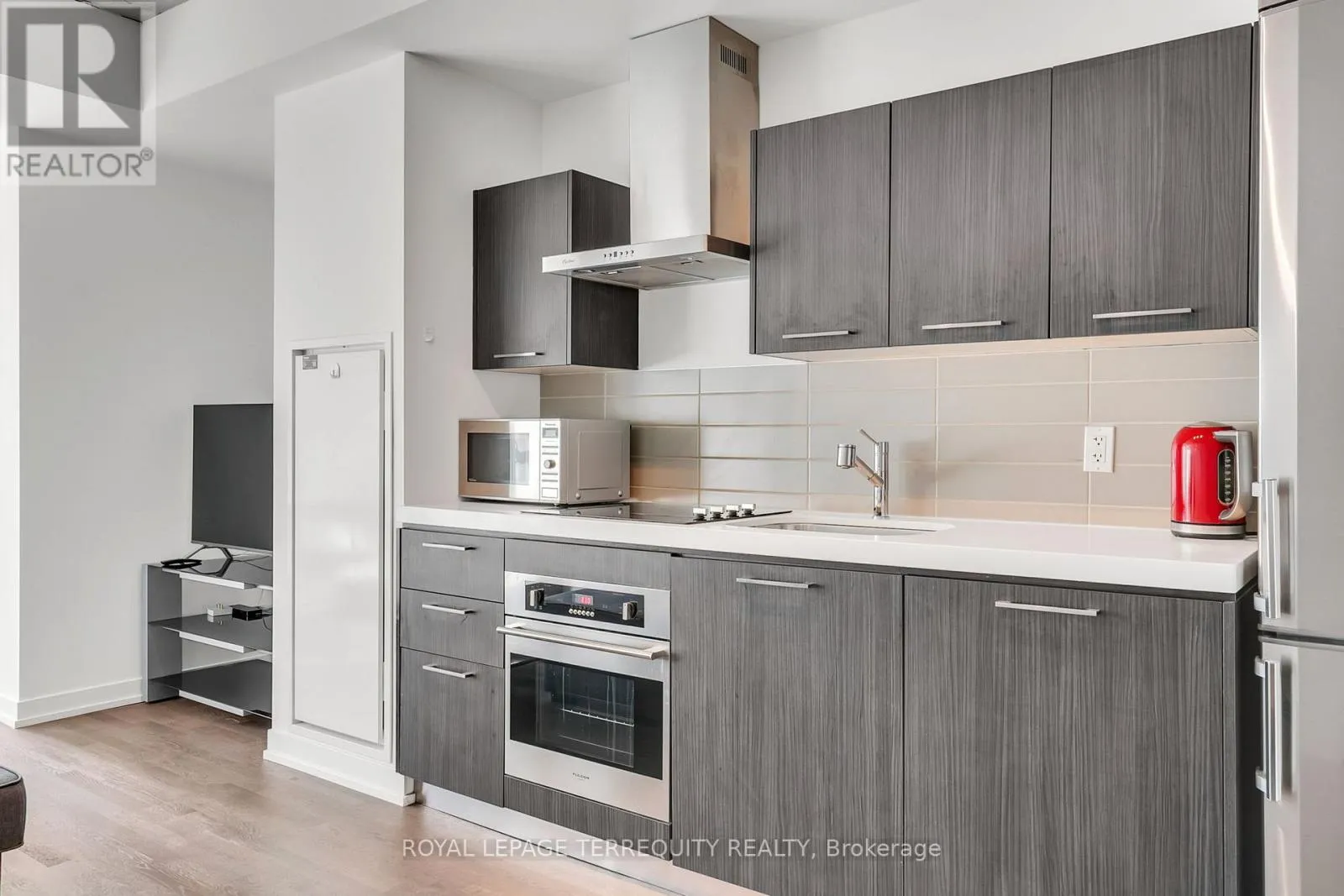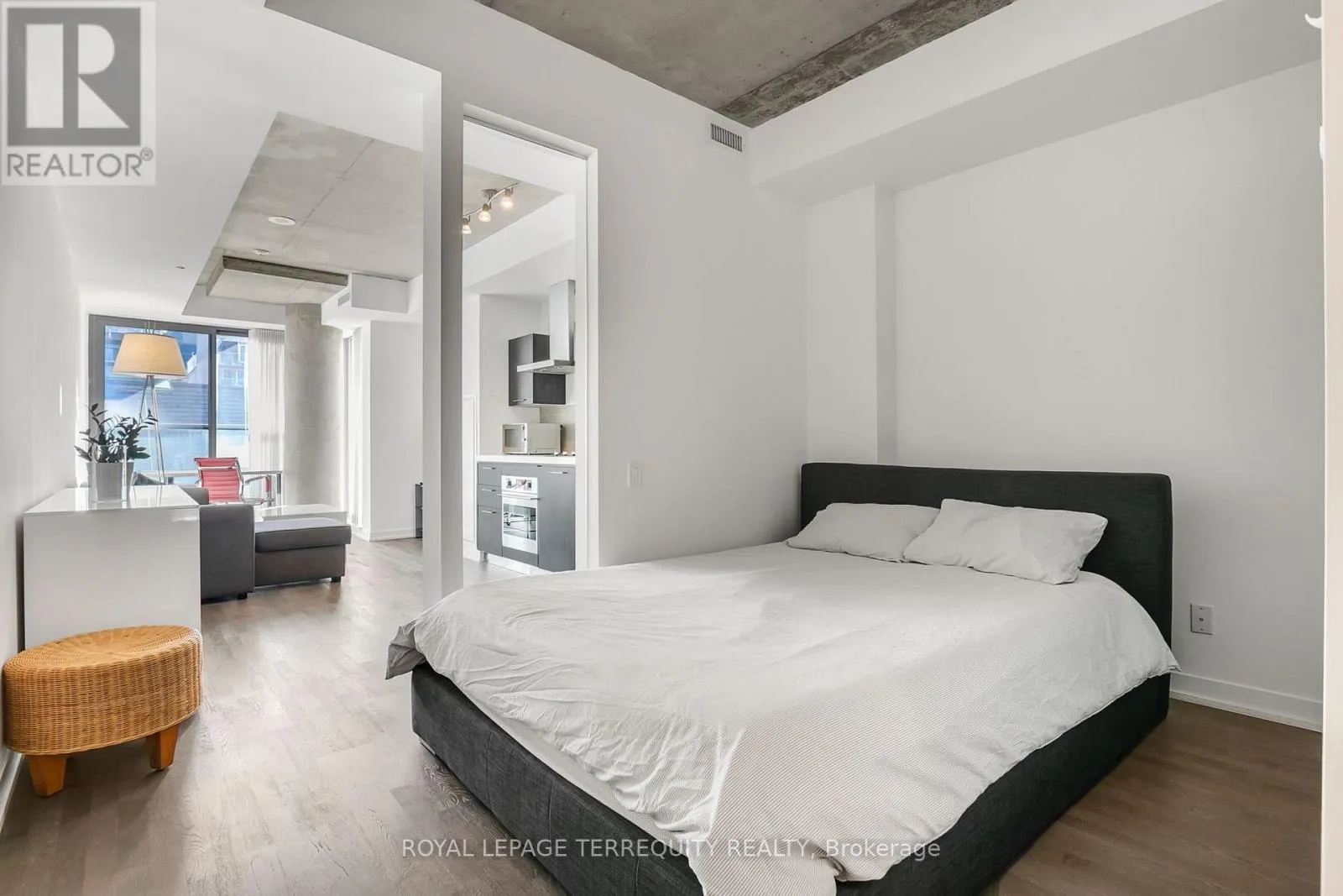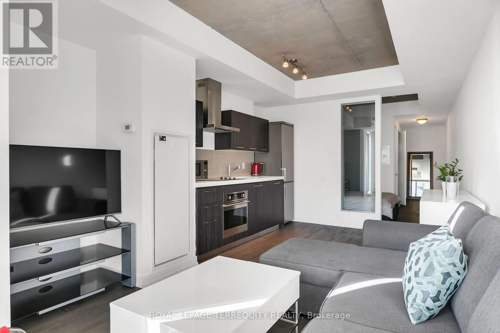 Cross Streets: King & Spadina. ** Directions: King west of Spadina. Welcome to FASHION HOUSE, a much coveted boutique building located in prime King West, just west of Spadina. Fabulous 573 sq ft well designed studio suite with defined bedroom area, with room for entertaining and work-from-home space. This loft style suite has high concrete ceilings, with luxury finishes throughout. Quality engineered hardwood floor run through all principal rooms, the kitchen is open concept with built-in appliances,.