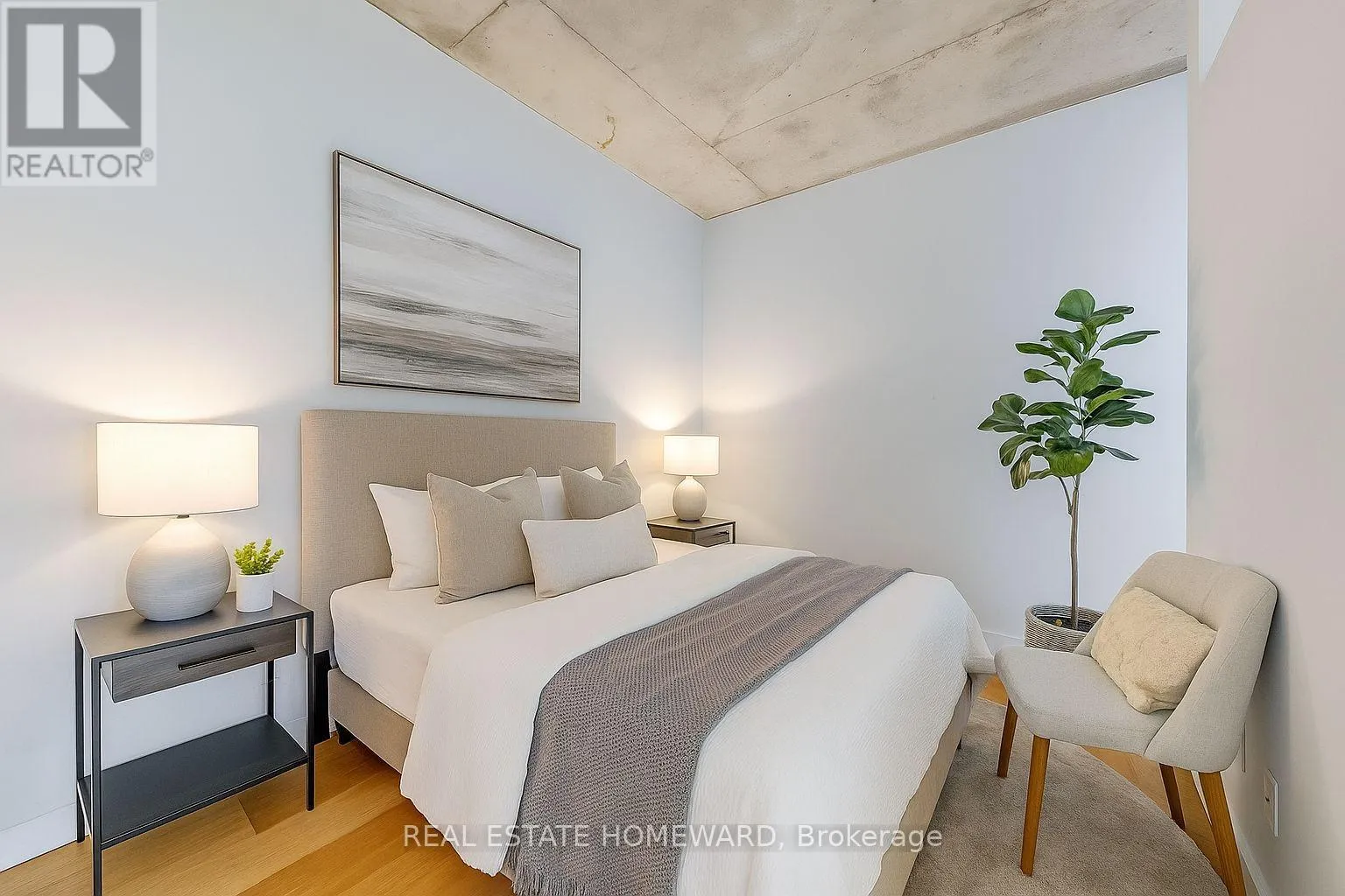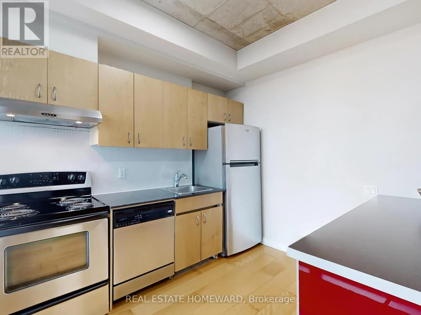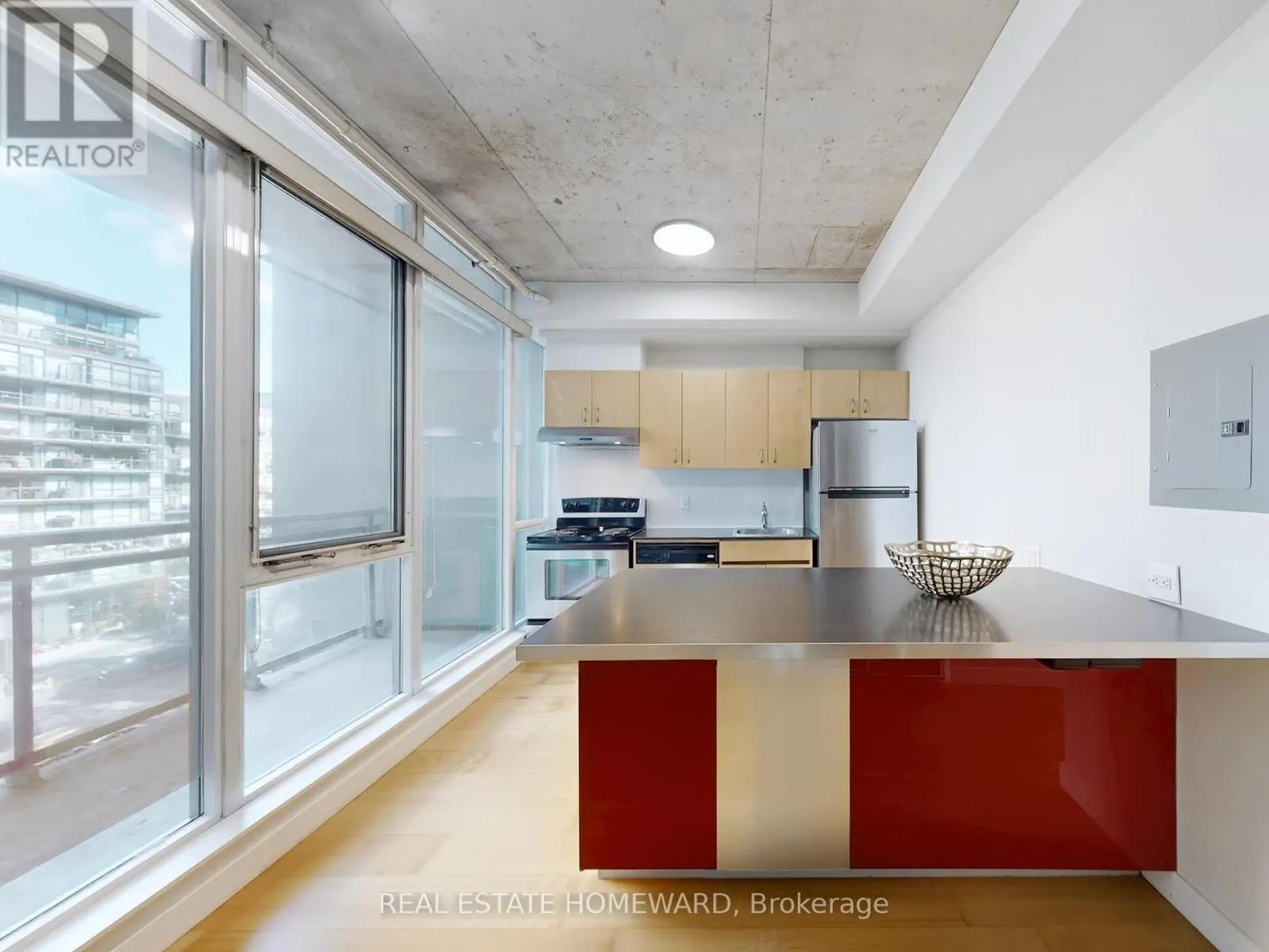 King & Bathurst Live Boldly in the Heart of King West! Stylish 1-bedroom loft in a boutique, well-managed building. Soaring 9 ft exposed concrete ceilings, floor-to-ceiling windows, and an open-concept layout create a bright, airy space full of character. Walk out to your private balcony perfect for morning coffee or evening relaxation.Modern kitchen with large peninsula island, breakfast bar, granite countertop, stainless steel appliances, and new LED lighting.