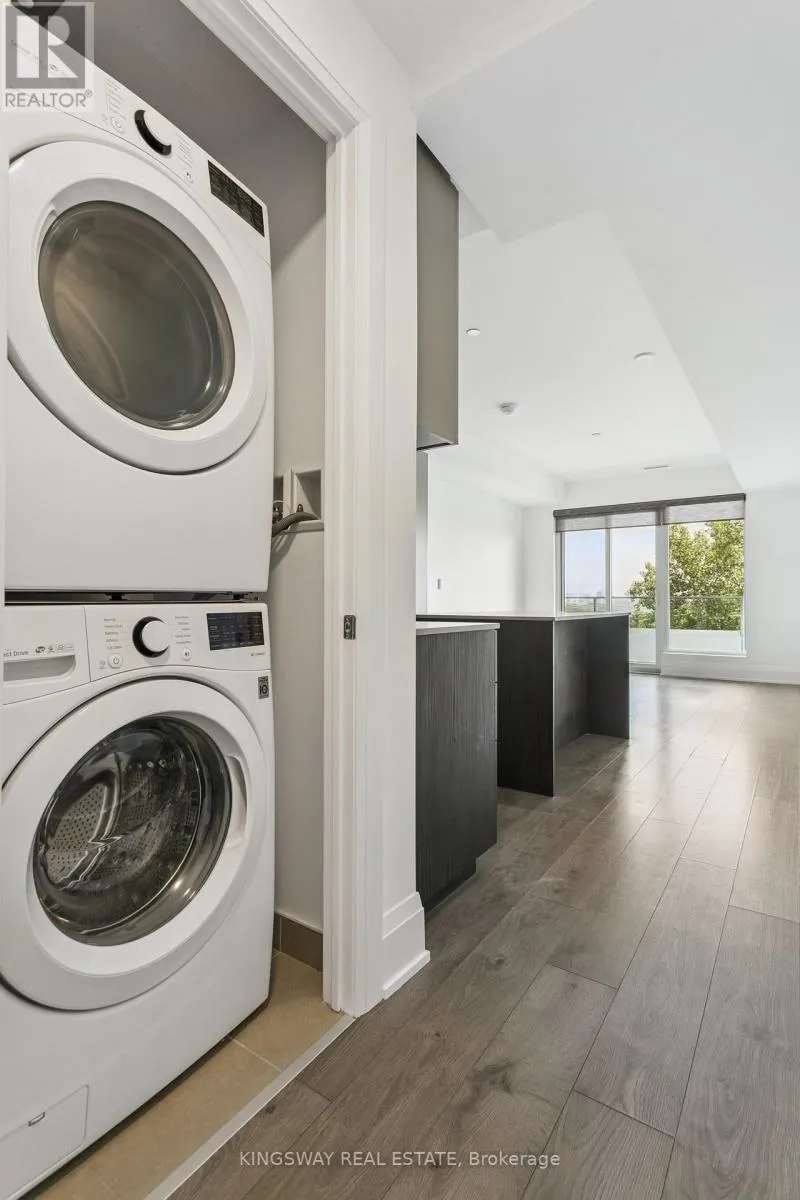 Humber River Park is just steps away, offering year-round hiking, snowshoeing, recreational trails, and salmon spotting in the fall. This 831 sq. ft. suite showcases a thoughtful layout with high-quality finishes throughout. The spacious L-shaped kitchen offers abundant cabinetry, complemented by a custom floor-to-ceiling shelved pantry for exceptional storage. A large custom island includes two double electrical outlets and an overhang for seating - ideal for entertaining or casual dining. The open-concept living and dining areas flow seamlessly onto the balcony through glass walkouts, also accessible from the second bedroom. The primary bedroom features breathtaking views through floor-to-ceiling windows and a generous walk-in double closet. The welcoming foyer includes a double closet and an enclosed laundry area with upgraded front-loading washer and dryer. Custom roller blinds throughout the suite add both elegance and privacy. (id:27476)