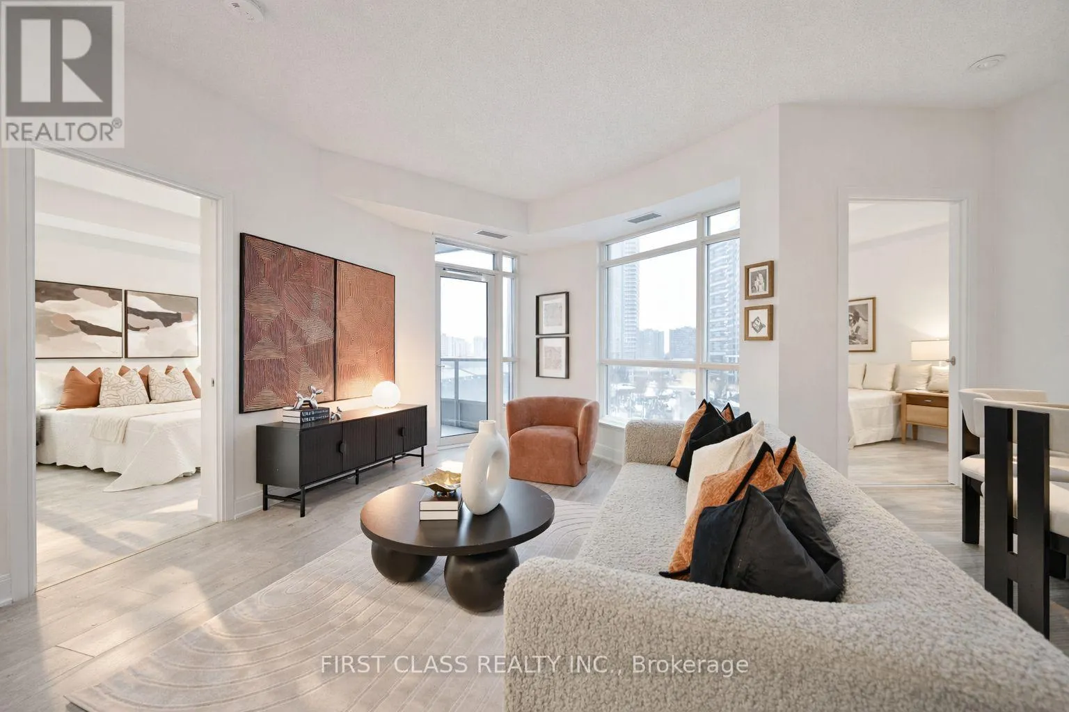 Hwy 401 And Kennedy Luxurious Tridel-Built 2+Den Suite | 903 Sq Ft + Balcony Rarely offered and exceptionally functional, this sun-filled and quiet 2-bedroom + den suite features a highly desirable layout, with the den large enough to be used as a third bedroom or a private home office. Offering 903 sq ft of interior living space plus an outdoor balcony, the suite showcases 9-ft ceilings, laminate flooring throughout, and upgraded designer light fixtures that enhance its modern, refined feel.