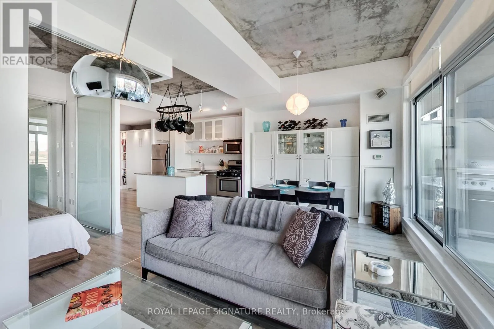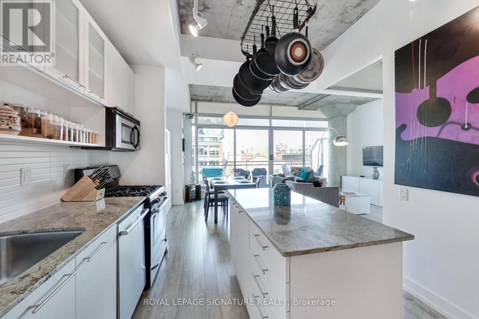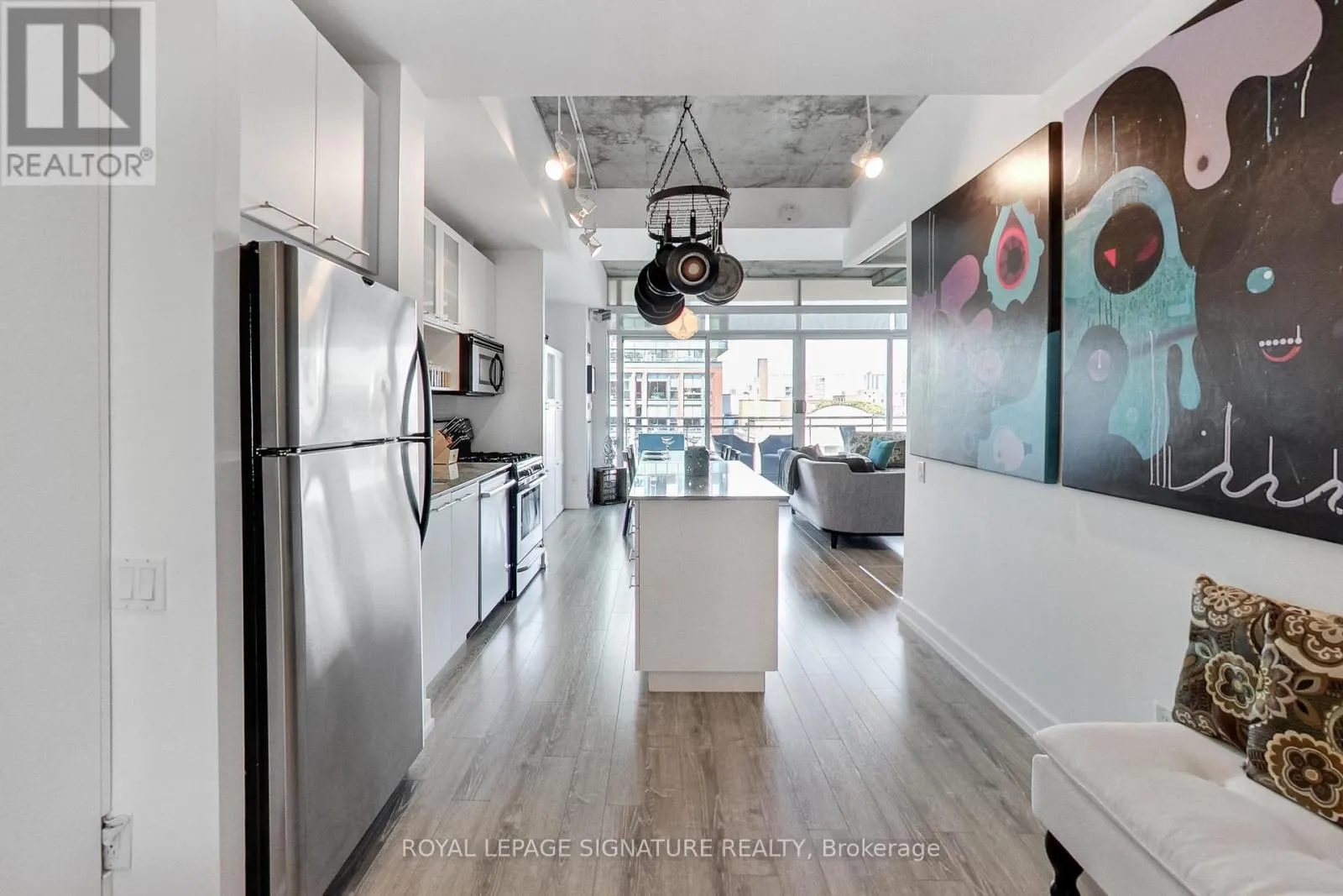 Cross Streets: King St W / Portland St. ** Directions: King StW / Portland St. Live in one of the best boutique soft lofts among all the action of King West! This bright and spacious urban loft has a very efficient, open concept 1 bedroom + den layout with a generous entertainment space. Includes 1 underground parking spot & 1 locker. 10' exposed concrete ceiling. Modern white kitchen with an island and gas cooking! Brand new flooring throughout.
