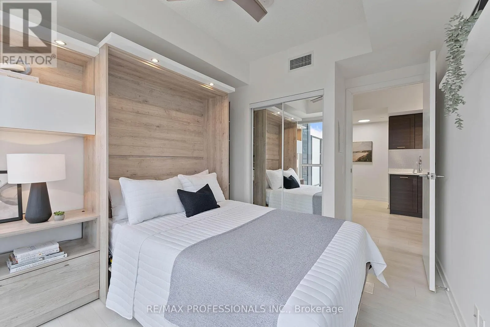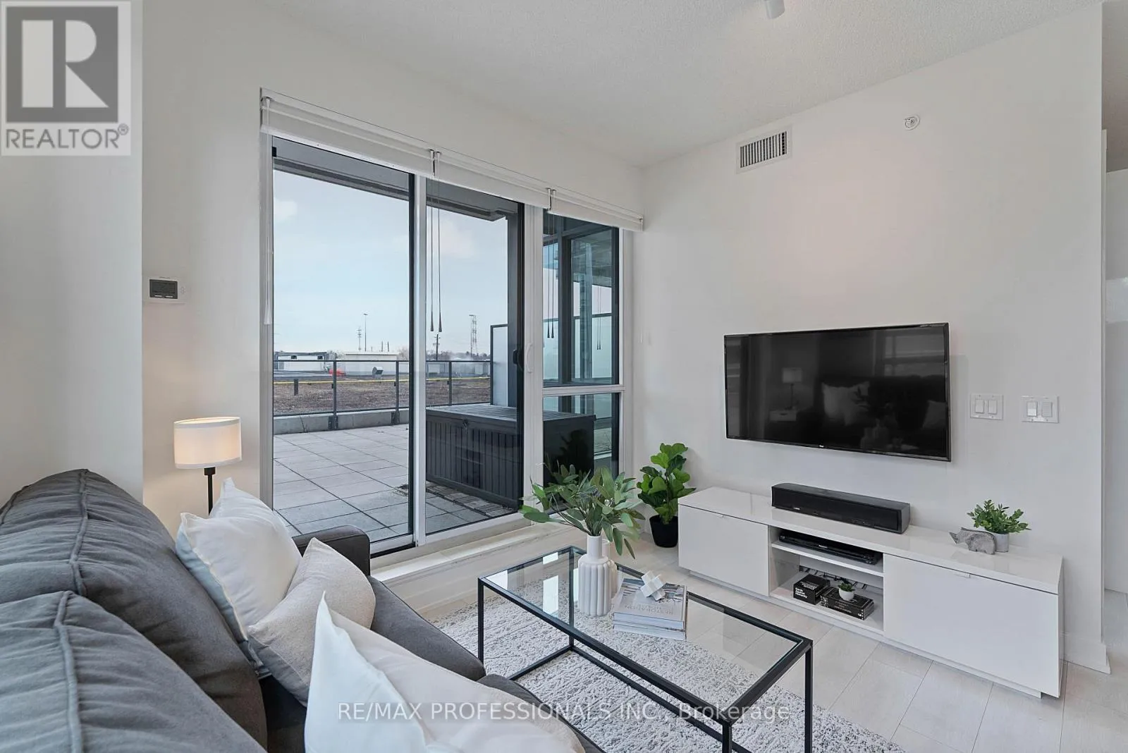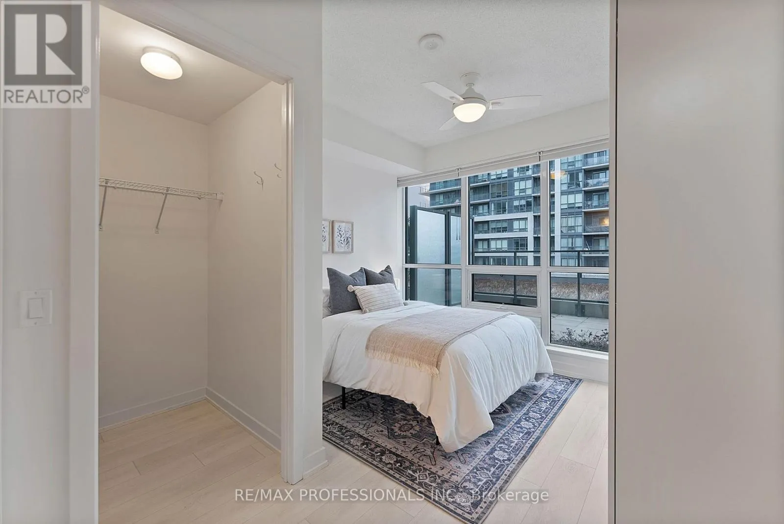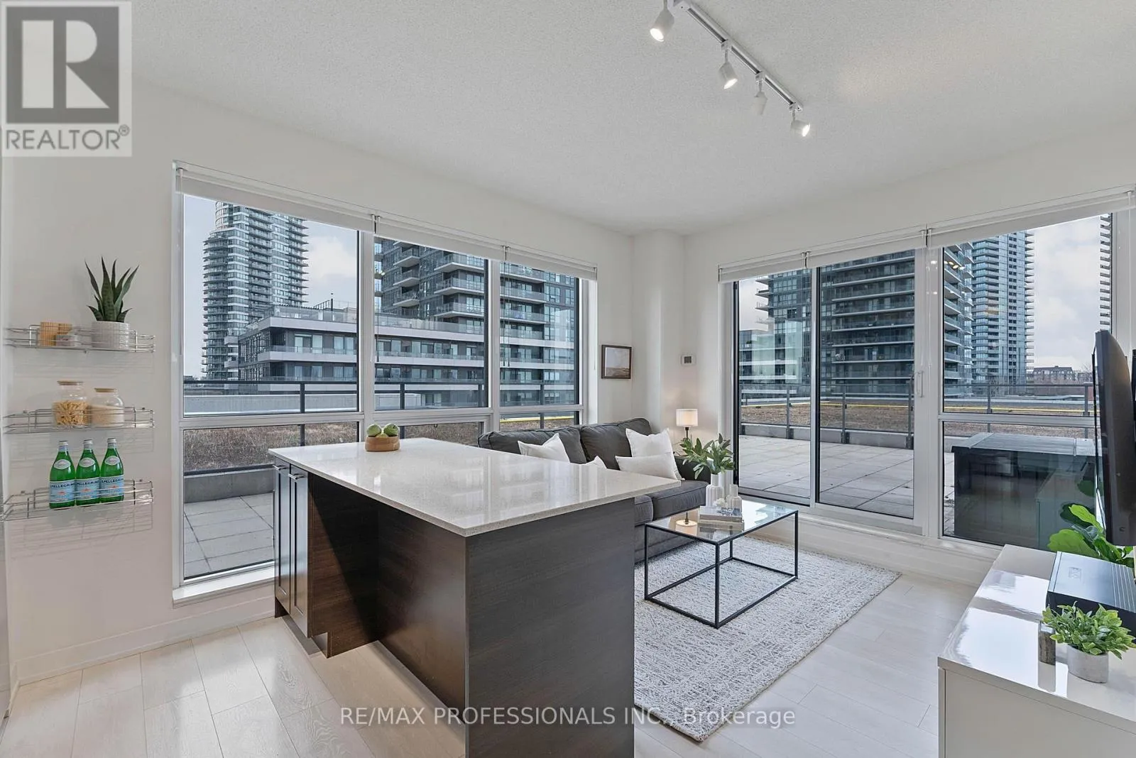The functional open-concept layout is filled with natural light from expansive windows, features 9' ceilings and laminate flooring throughout and includes an stylish, upgraded kitchen with rich dark cabinetry, quartz countertops, stainless steel appliances, a tile backsplash and a centre island with breakfast bar that flows seamlessly into the living area with walk-out to the terrace for effortless indoor-outdoor living, a well-appointed primary bedroom with a large walk-in closet, additional built-in wardrobe, a 4-piece ensuite and a large windows, a versatile second bedroom with a custom Murphy bed with a built-in desk and shelves ideal for guests or as flexible use space, a separate den perfect for a dedicated home office, convenient ensuite laundry and a 3-piece bathroom. Additional upgrades include Hunter Douglas Ultraglide Duette blinds (sheer and blackout), custom closet organizers, added storage solutions and a refurbished HVAC fan coil unit (2023). Parking and locker included. Residents enjoy access to Club W amenities including an indoor pool, hot tub, fitness centre, yoga studio, sauna and steam room, theatre, party room, outdoor terrace with BBQs, guest suites and 24-hour concierge. Westlake Village offers over 60,000 sq ft of retail at your doorstep including Metro, LCBO, Starbucks & more. Steps to the Martin Goodman Trail, waterfront parks, marina and beaches, with easy access to TTC, Mimico GO and the Gardiner Expressway. A rare opportunity to own a bright corner suite with exceptional outdoor space in a true waterfront community! (id:27476)
