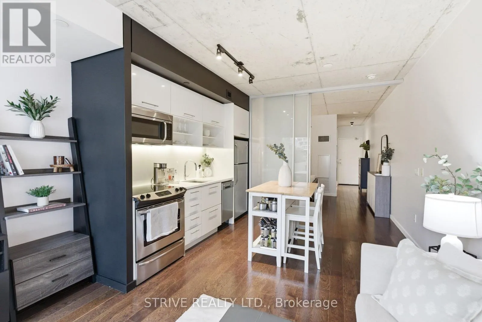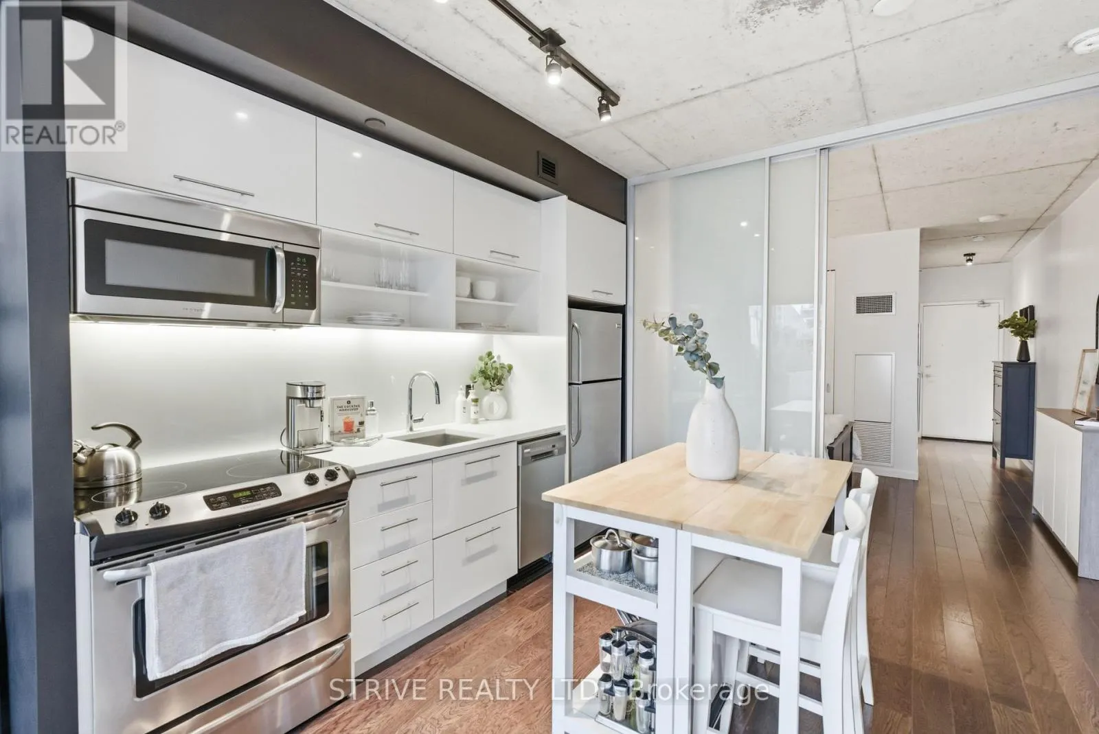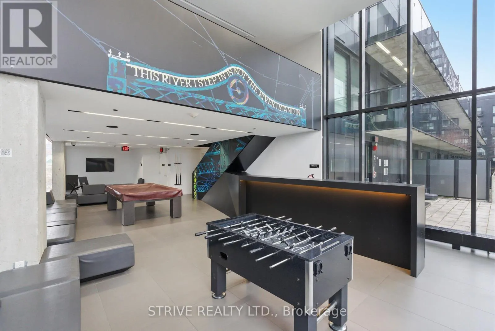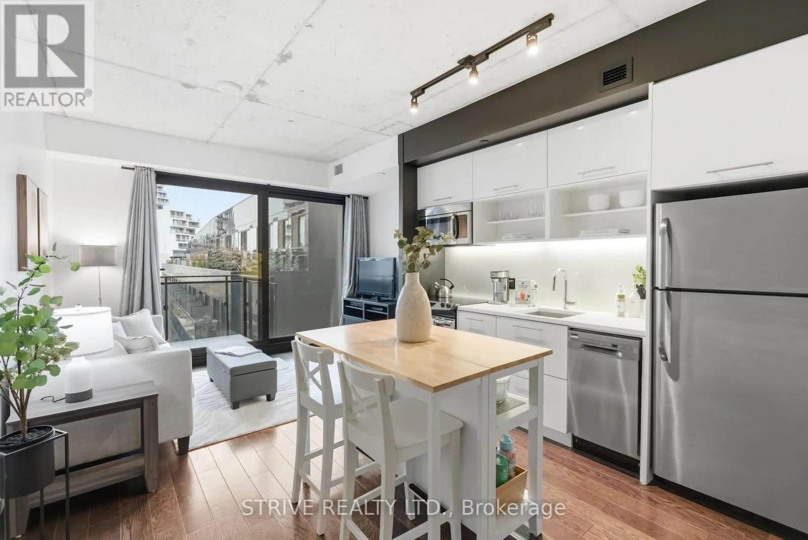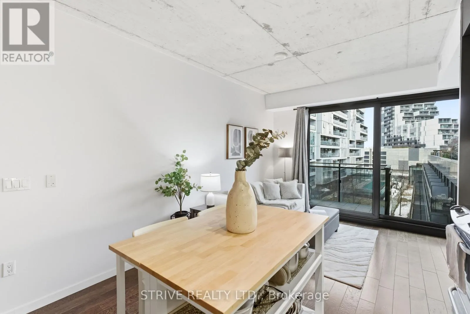 Lawrence Market, Corktown Commons, the Don River Valley, Toronto's Waterfront Trail, and the DVP. The TTC 504 King streetcar is right at your doorstep with routes 503 and 501. This modern loft-style suite offers approximately 550 sq ft of functional living space, plus a 55 sq ft balcony with composite decking panels. Located on the 6th floor, the unit provides direct access to the interior walkway connecting to the adjoining building and outdoor courtyard and pool. It boasts a superior south-facing exposure overlooking the pool area, flooding the space with natural light. Features include 9-foot exposed concrete ceilings and stylish walnut hardwood flooring throughout. The contemporary white kitchen is equipped with stainless steel appliances, new dishwasher, and grey quartz countertops. The spa-inspired, fully tiled bathroom features a soaker tub, updated vanity and toilet, mirrored cabinet, and convenient ensuite laundry. Outstanding building amenities include 24-hour concierge, outdoor courtyard and swimming pool with community BBQ areas, fully equipped fitness centre, two spacious party rooms with lounge, bar, kitchen, dining area and billiards table, guest suite, and sun deck. Come make the celebrated River City development your home and enjoy the perfect blend of modern living, convenience, and style. (id:27476)