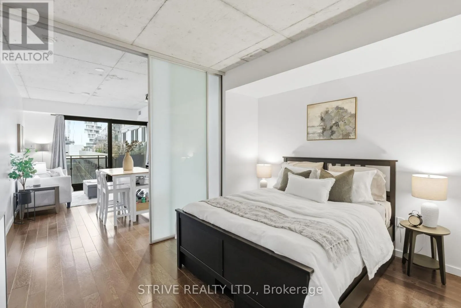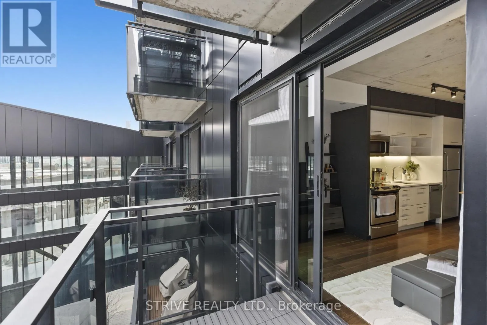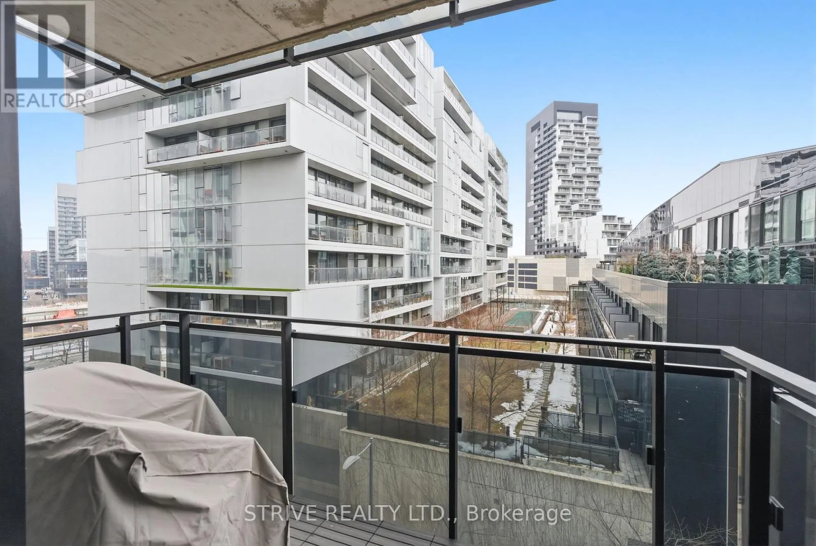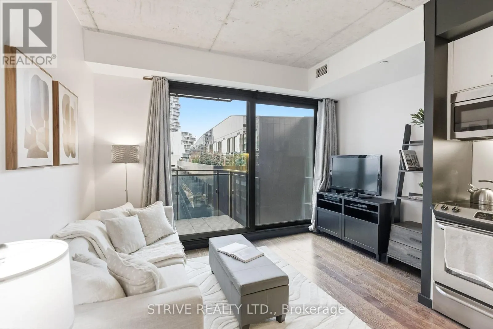 Lawrence Market, Corktown Commons, the Don River Valley, Toronto's Waterfront Trail, and the DVP. The TTC 504 King streetcar is right at your doorstep with routes 503 and 501. This modern loft-style suite offers approximately 550 sq ft of functional living space, plus a 55 sq ft balcony with composite decking panels. Located on the 6th floor, the unit provides direct access to the interior walkway connecting to the adjoining building and outdoor courtyard and pool. It boasts a superior south-facing exposure overlooking the pool area, flooding the space with natural light. Features include 9-foot exposed concrete ceilings and stylish walnut hardwood flooring throughout. The contemporary white kitchen is equipped with stainless steel appliances, new dishwasher, and grey quartz countertops. The spa-inspired, fully tiled bathroom features a soaker tub, updated vanity and toilet, mirrored cabinet, and convenient ensuite laundry. Outstanding building amenities include 24-hour concierge, outdoor courtyard and swimming pool with community BBQ areas, fully equipped fitness centre, two spacious party rooms with lounge, bar, kitchen, dining area and billiards table, guest suite, and sun deck. Come make the celebrated River City development your home and enjoy the perfect blend of modern living, convenience, and style. (id:27476)