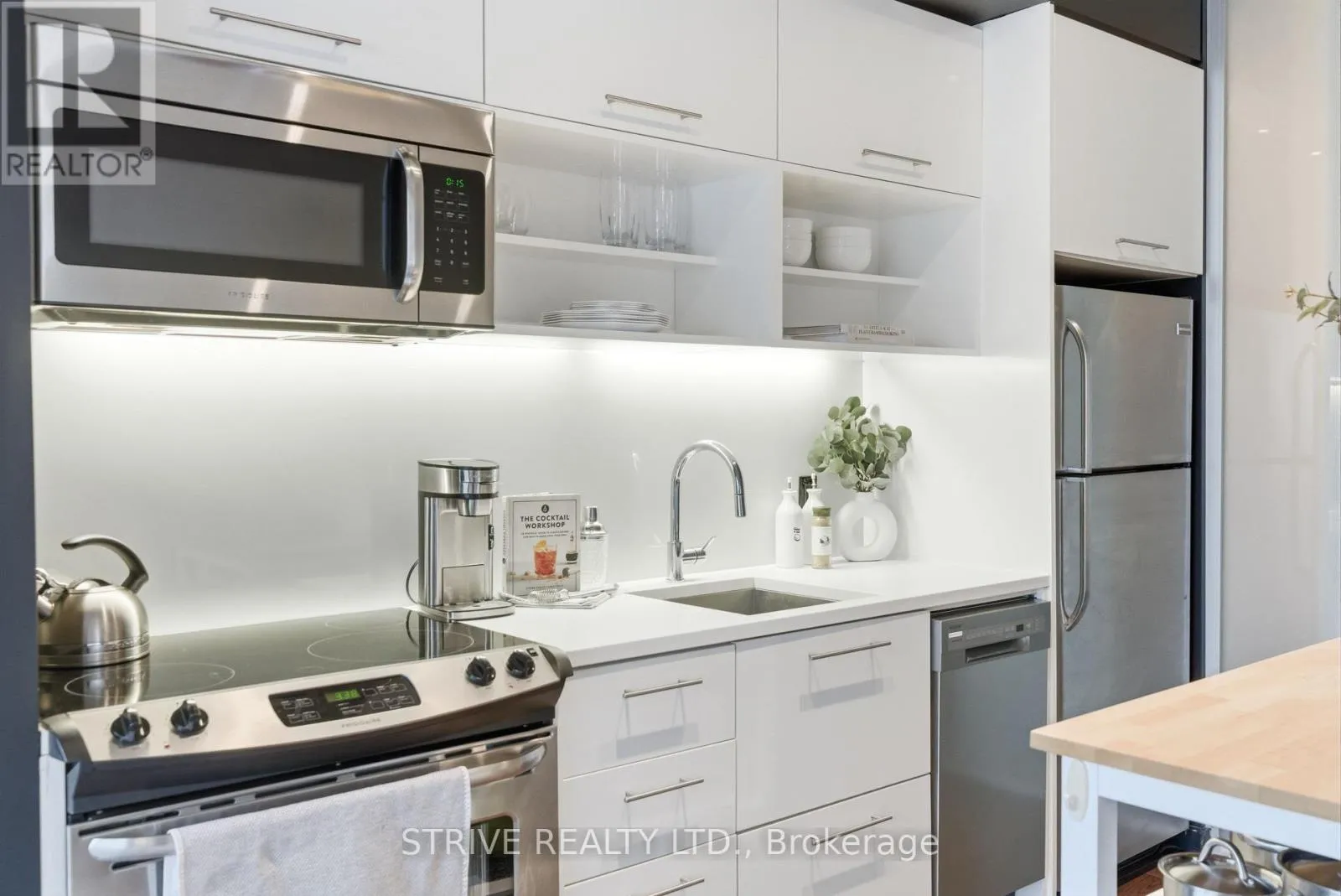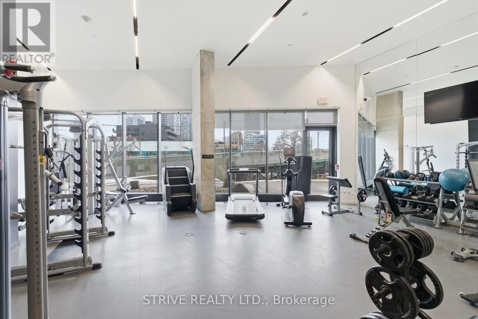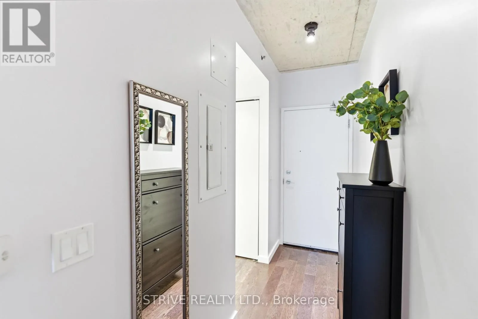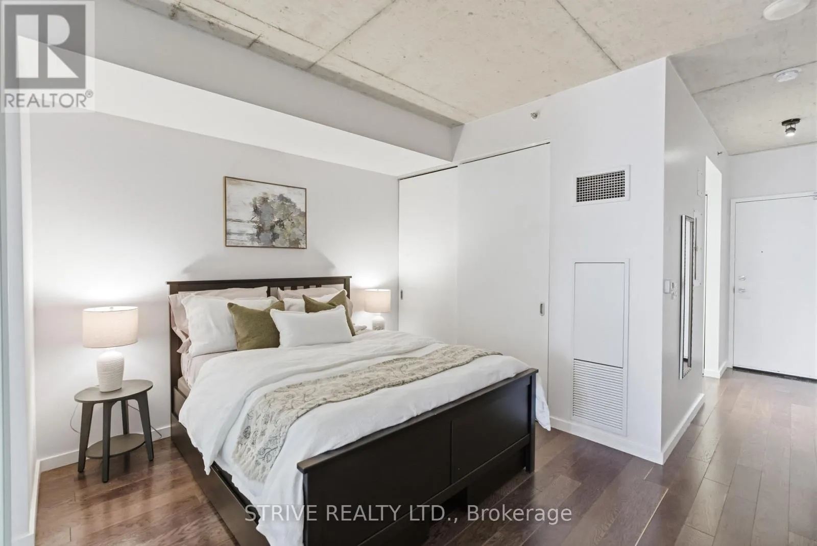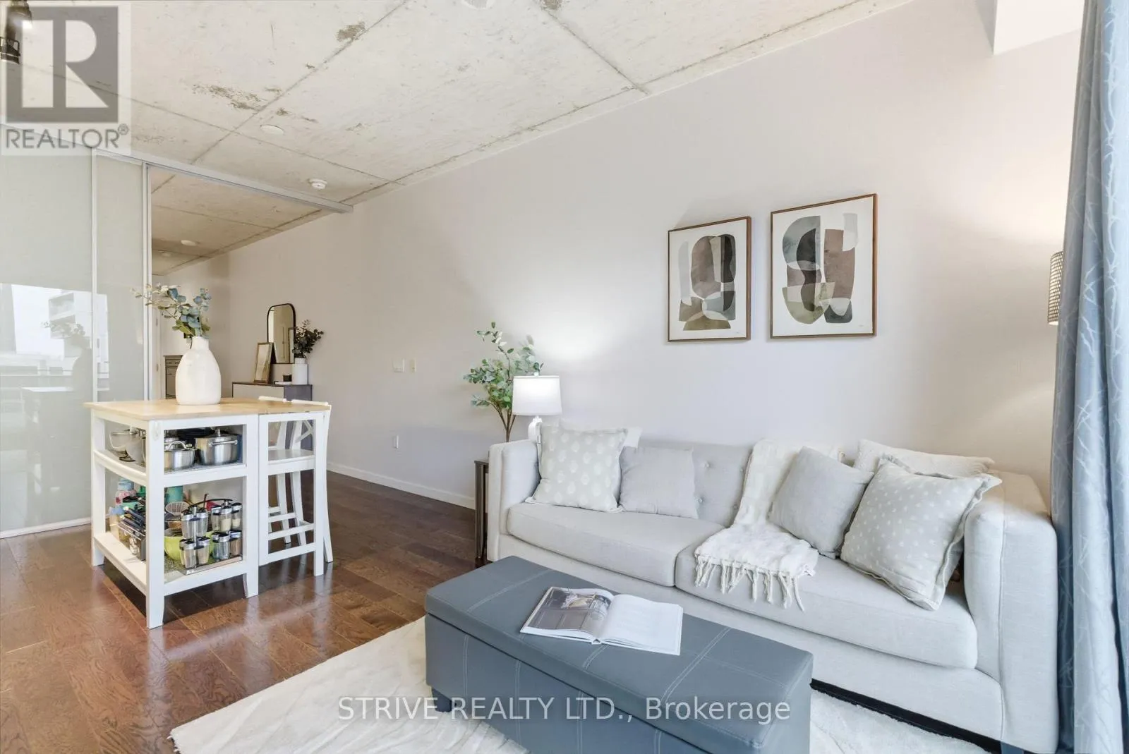 Lawrence Market, Corktown Commons, the Don River Valley, Toronto's Waterfront Trail, and the DVP. The TTC 504 King streetcar is right at your doorstep with routes 503 and 501. This modern loft-style suite offers approximately 550 sq ft of functional living space, plus a 55 sq ft balcony with composite decking panels. Located on the 6th floor, the unit provides direct access to the interior walkway connecting to the adjoining building and outdoor courtyard and pool. It boasts a superior south-facing exposure overlooking the pool area, flooding the space with natural light. Features include 9-foot exposed concrete ceilings and stylish walnut hardwood flooring throughout. The contemporary white kitchen is equipped with stainless steel appliances, new dishwasher, and grey quartz countertops. The spa-inspired, fully tiled bathroom features a soaker tub, updated vanity and toilet, mirrored cabinet, and convenient ensuite laundry. Outstanding building amenities include 24-hour concierge, outdoor courtyard and swimming pool with community BBQ areas, fully equipped fitness centre, two spacious party rooms with lounge, bar, kitchen, dining area and billiards table, guest suite, and sun deck. Come make the celebrated River City development your home and enjoy the perfect blend of modern living, convenience, and style. (id:27476)
