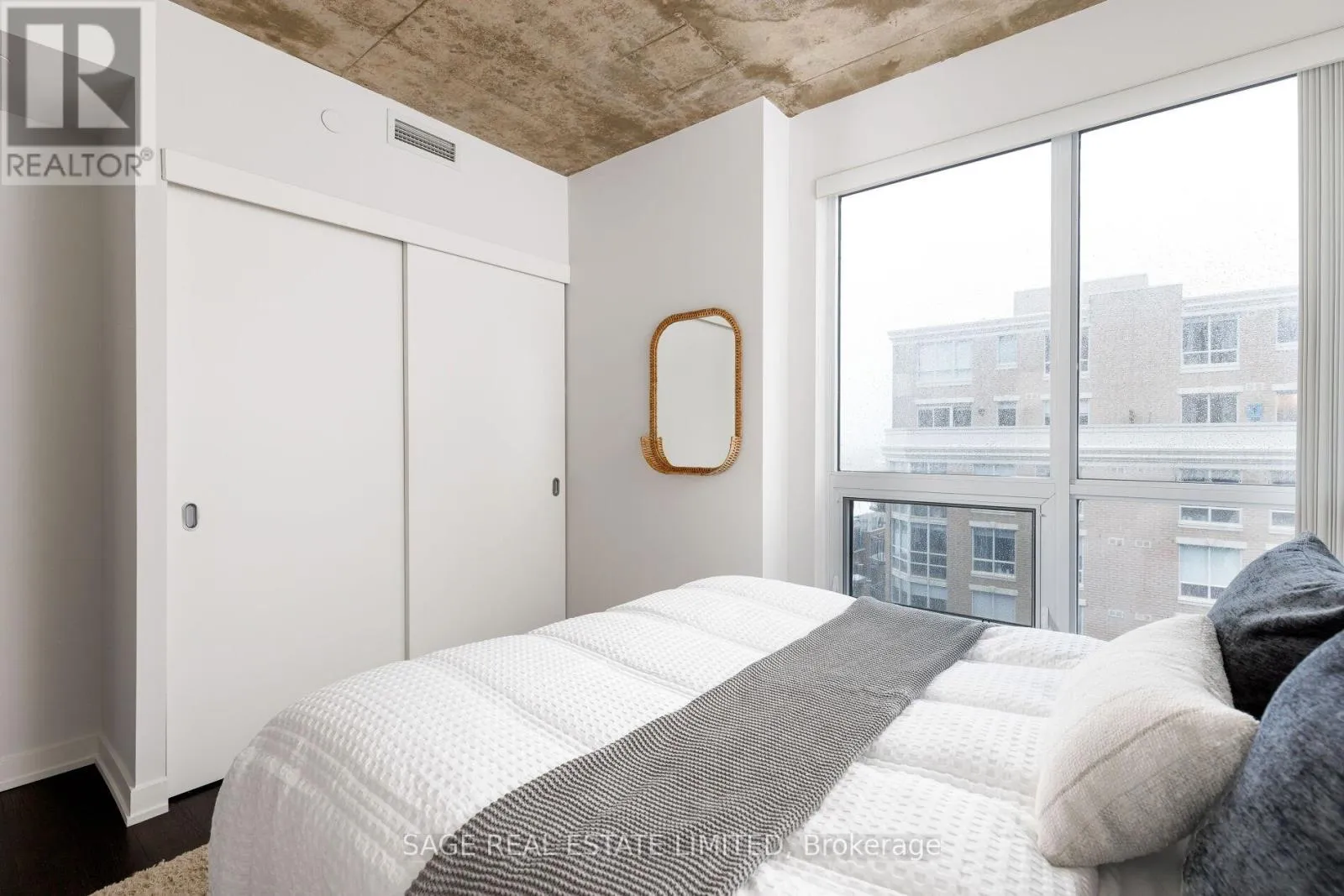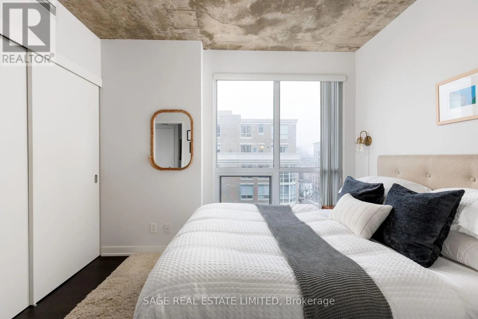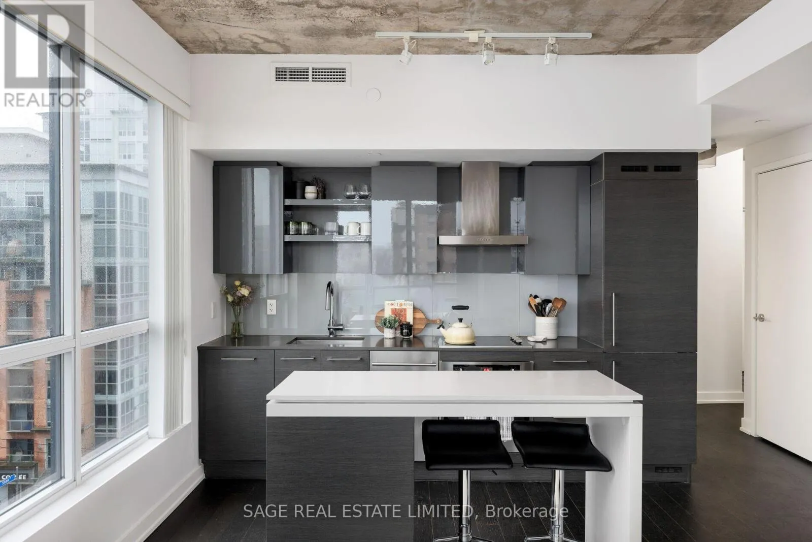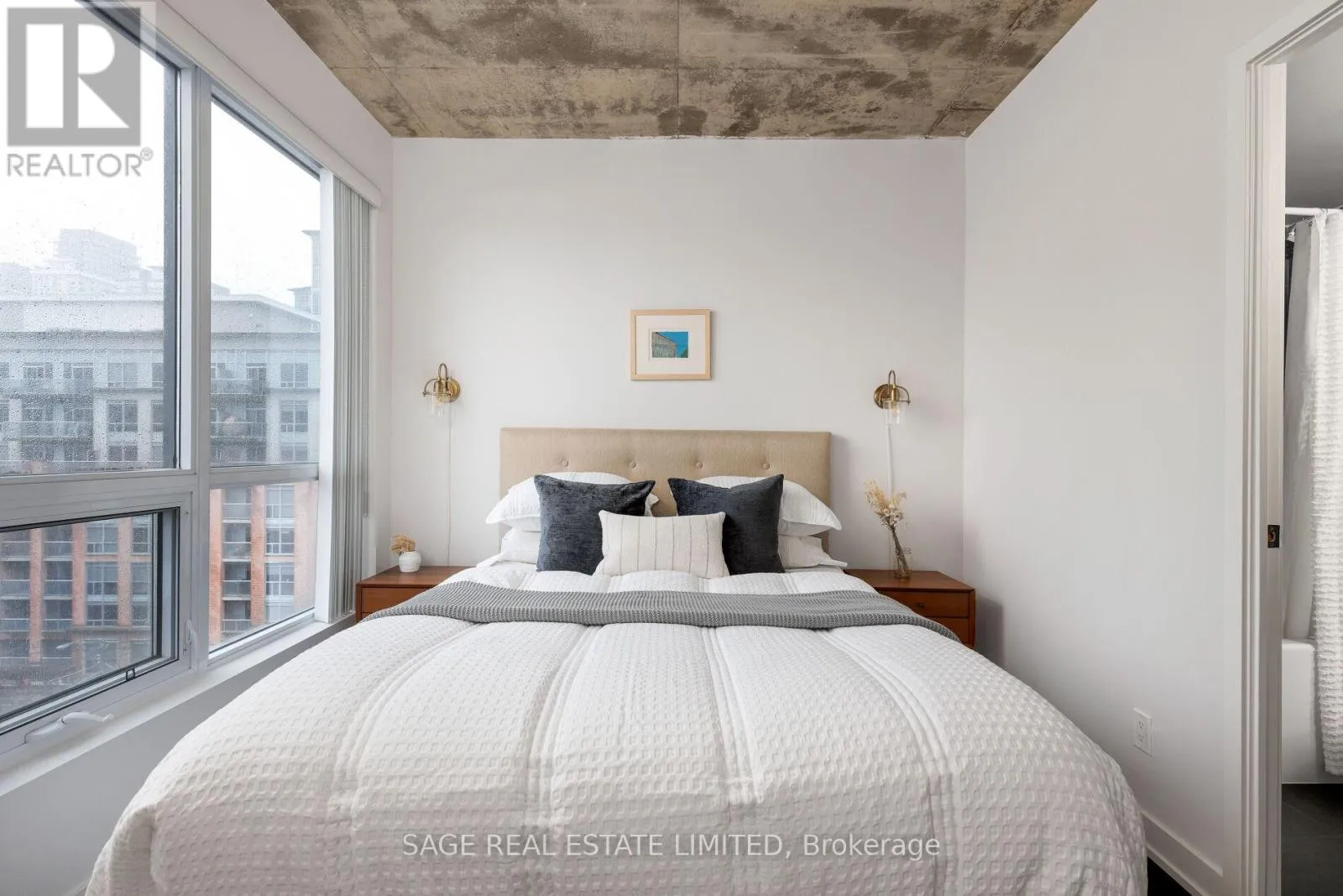King & Shaw Bright. Airy. Effortlessly cool. This north east corner 2 bedroom, 2 bathroom suite blends modern design with a distinct loft aesthetic and exceptional everyday livability. Featuring 9 foot ceilings, exposed concrete, and expansive windows, the space is flooded with natural light and framed by leafy residential views over Queen West, lush and green in the summer, with a subtle skyline in the distance.