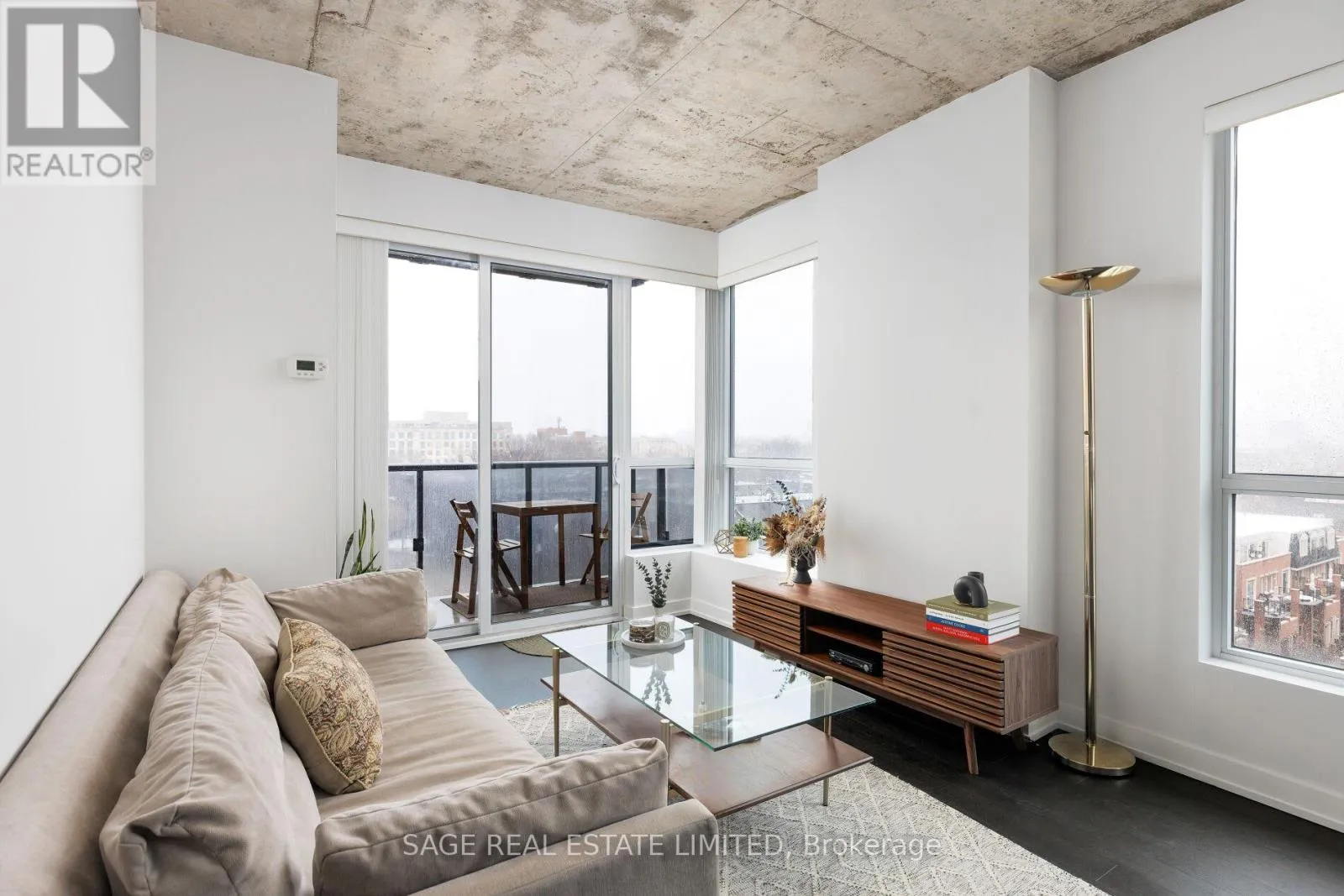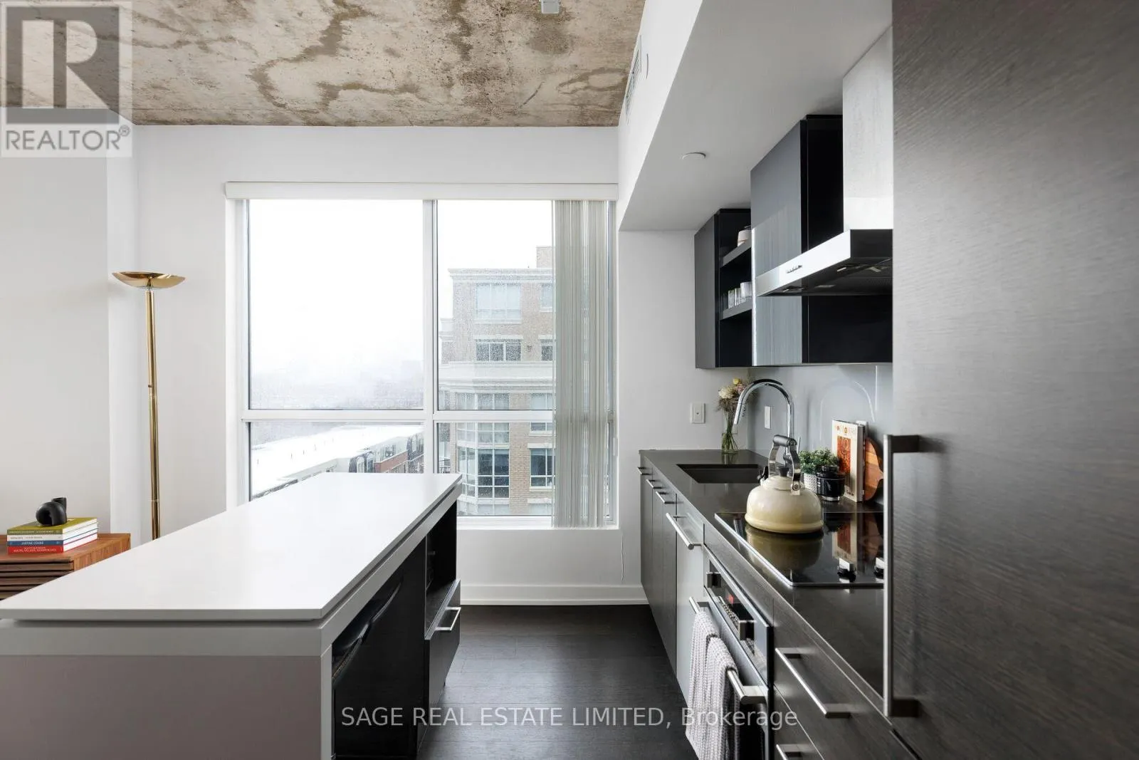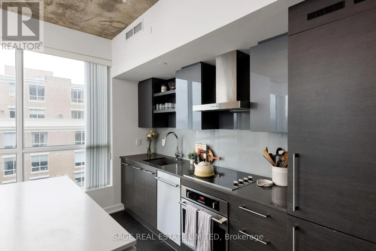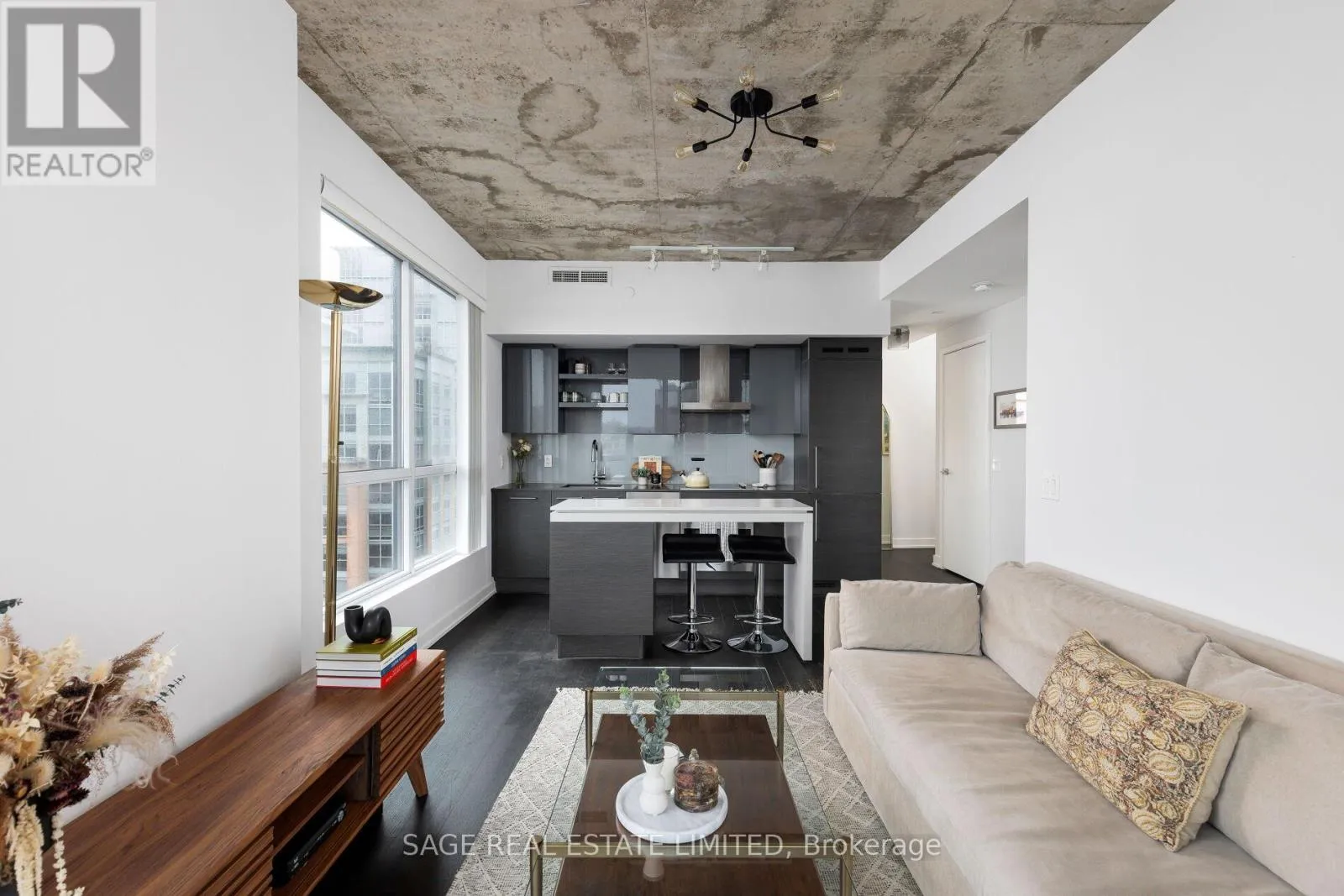 King & Shaw Bright. Airy. Effortlessly cool. This north east corner 2 bedroom, 2 bathroom suite blends modern design with a distinct loft aesthetic and exceptional everyday livability. Featuring 9 foot ceilings, exposed concrete, and expansive windows, the space is flooded with natural light and framed by leafy residential views over Queen West, lush and green in the summer, with a subtle skyline in the distance.