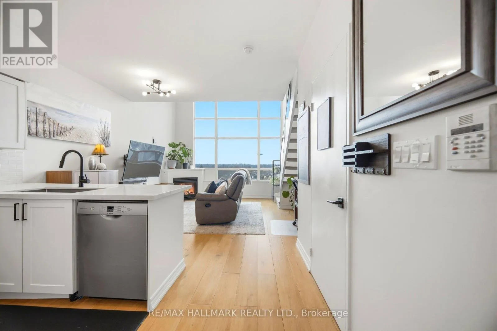 Cross Streets: Lake Shore/Parklawn/Royal York. ** Directions: Park Lawn to Legion. Set in Skylofts II at Mystic Pointe, this stunning two-level loft delivers sunlight and style, near the shores of Lake Ontario. The space features a 17-foot window wall that offers incredible natural light. The main floor is open and functional with an updated kitchen complete with quartz counters, stainless steel appliances, and new cabinetry.