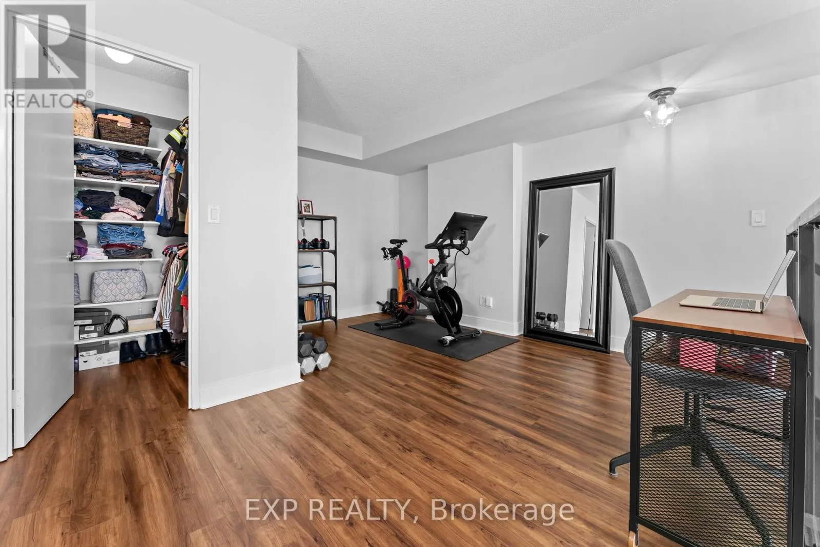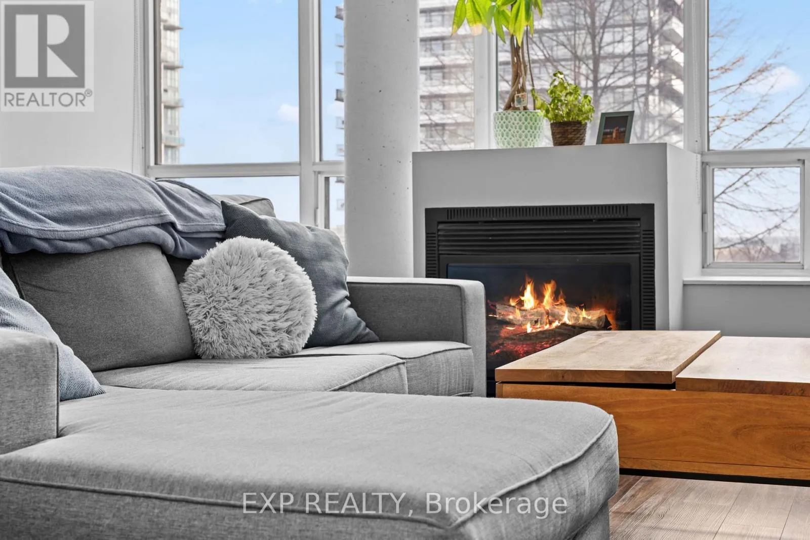 The main level is thoughtfully designed for both everyday living and entertaining, featuring a custom chef's kitchen with sleek finishes, stainless steel appliances, a built-in bar with wine fridge and storage, and a clever slide-out table from the island, while the expansive living area is anchored by a gas fireplace and bathed in natural light with lake views. Practical comforts include stacked laundry, a powder room, and a smart thermostat. Upstairs, the spacious primary bedroom easily accommodates a king-size bed and offers a walk-in closet alongside an oversized den ideal for a home office, nursery, or fitness space, complemented by a sun-filled bathroom with a Jacuzzi tub that invites rest and relaxation. Set in Mimico's vibrant Humber Bay waterfront community, this location places you steps from the lake, parks, trails, cafés, restaurants, grocery stores, transit, and GO access, with quick connections to the Gardiner Expressway, Highway 427, and downtown Toronto. Residents enjoy exceptional amenities, including a gym, sauna, squash court, party room, and a spectacular rooftop garden terrace with common BBQs and gazebo, in a pet-friendly building with free visitor parking and EV charging available in the building. This suite also includes a premium parking space with an extra-large private locker conveniently located directly behind the spot, completing an offering that defines refined loft living at its best. (id:27476)
