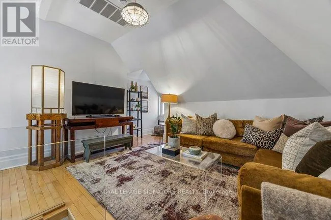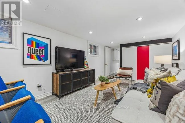 Unique dual-bathroom layout features powder room with toilet and pedestal sink, adjacent to full bath with soaker tub, glass rain shower, vanity, and family-size front-load washer/dryer. Multiple bedrooms served by both main and back stairs. Spacious primary bedroom with wood-burning fireplace and walk-in dressing room. Standout third-floor loft with walk-out to expansive terrace (covered seating + open area, fully wired with electrical) - currently a family room but easily converts to bedroom or office. Finished basement with bedroom, recreation room, bathroom rough-in and expansive storage. Perfect blend of heritage charm and modern function on one of Leslieville's most desirable streets! Quiet, walkable, friendly - steps to Queen St. East amenities, transit and a new Ontario Line station mere blocks away. (id:27476)