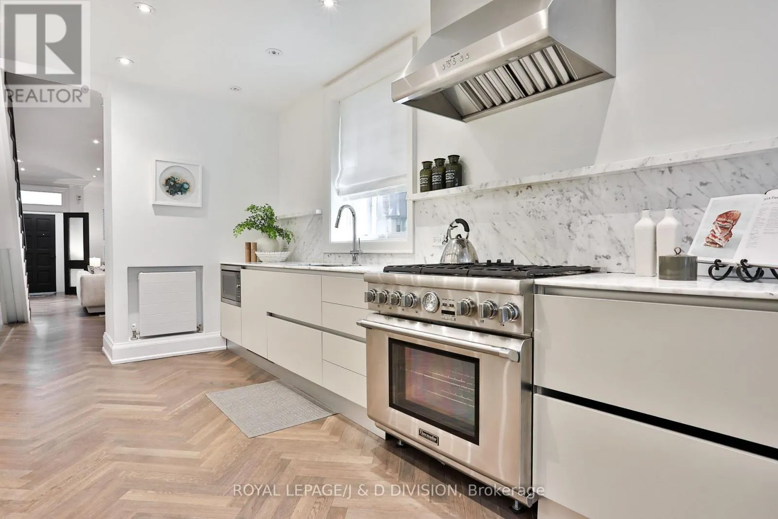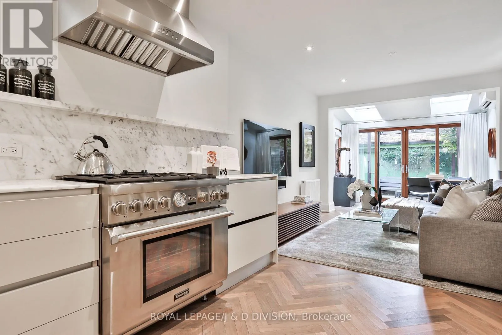 The Scavolini kitchen features Calacatta marble counters, professional-grade gas range, premium appliances and oversized pantry. Open-concept family and breakfast areas offer flexible living beneath 2 skylights, with double sliding doors to a tranquil city garden with Ipe/teak deck and garage access. The 2nd floor offers 2 spacious bedrooms, open study adaptable as a 4th bedroom, renovated marble bath with heated floors and soaker tub, and serene treetop deck with CN Tower views. The 3rd floor primary retreat includes a 5-piece ensuite, Italian Poliform walk-in closet and dressing area, custom full-height privacy door, built-in cabinetry and Juliette balcony. The finished lower level adds a media room with window seat, additional bedroom, office or fitness space, 3-piece bath, laundry and abundant storage. 6 integrated flat-screen TVs with Sonos are included. Live in luxury or lease strategically - generating over $550,000 in rental income over the past 6 years. Steps from Queen West, Kensington Market, AGO, Grange Park, TTC and the Financial and Entertainment Districts. An exceptional offering for buyers valuing architectural distinction, cultural vibrancy and understated privacy. (id:27476)
