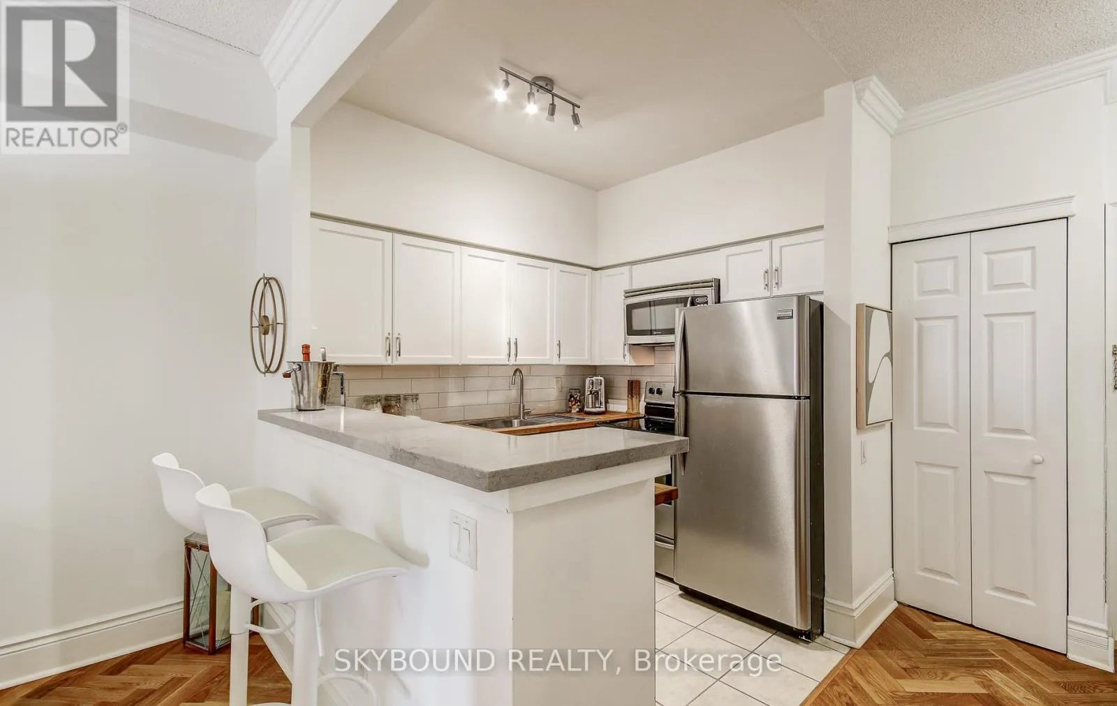 Did you see that classic clawfoot tub in the bathroom? How about those incredible blonde oak herringbone hardwood floors? And the custom crown molding? Add to that, two South-facing Juliette balconies (with custom retractable screens), a new full-size LG WashTower laundry set, and plenty of storage throughout. **And your own parking spot!** Boutique living in this quiet, 71 unit building spread over just 10 floors, means almost no waiting for an elevator. Plus a great gym, large roof deck with BBQs, party room, and visitor parking. A super quick stroll to St Lawrence Market just down the street, a block from St James Park, walking distance to the Financial District, Eaton Centre, King and Queen streetcars right around the corner, and very easy access to the DVP and Gardiner for when you want to get away. Oh, and Mystic Muffin is literally across the street (if you know, you know), and Fahrenheit Coffee is right downstairs. **Hydro/heat/water all included!** --> Fun fact: The French Quarter is the first condo in Canada to perform a sustainable heating/cooling technology retrofit by replacing its chiller and gas boiler with air-to-water heat pumps, reducing its carbon emissions by approximately 60%, with an Energy Star rating of 94/100! (id:27476)