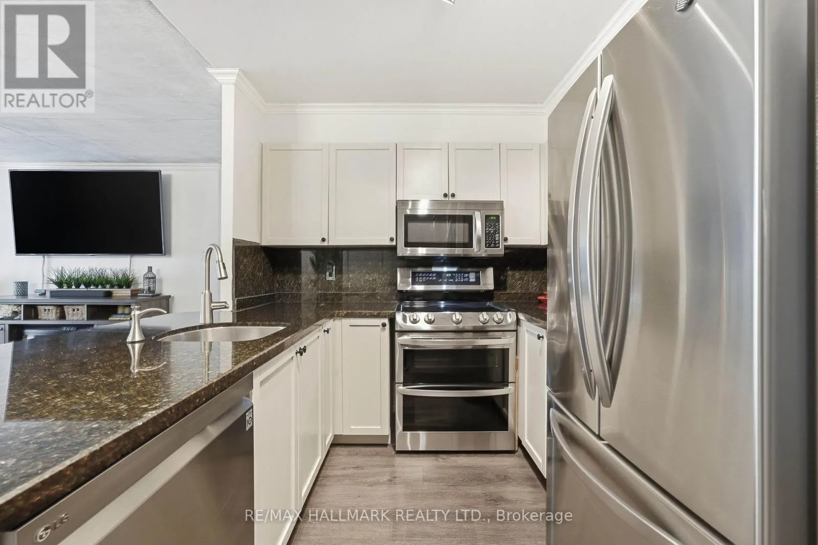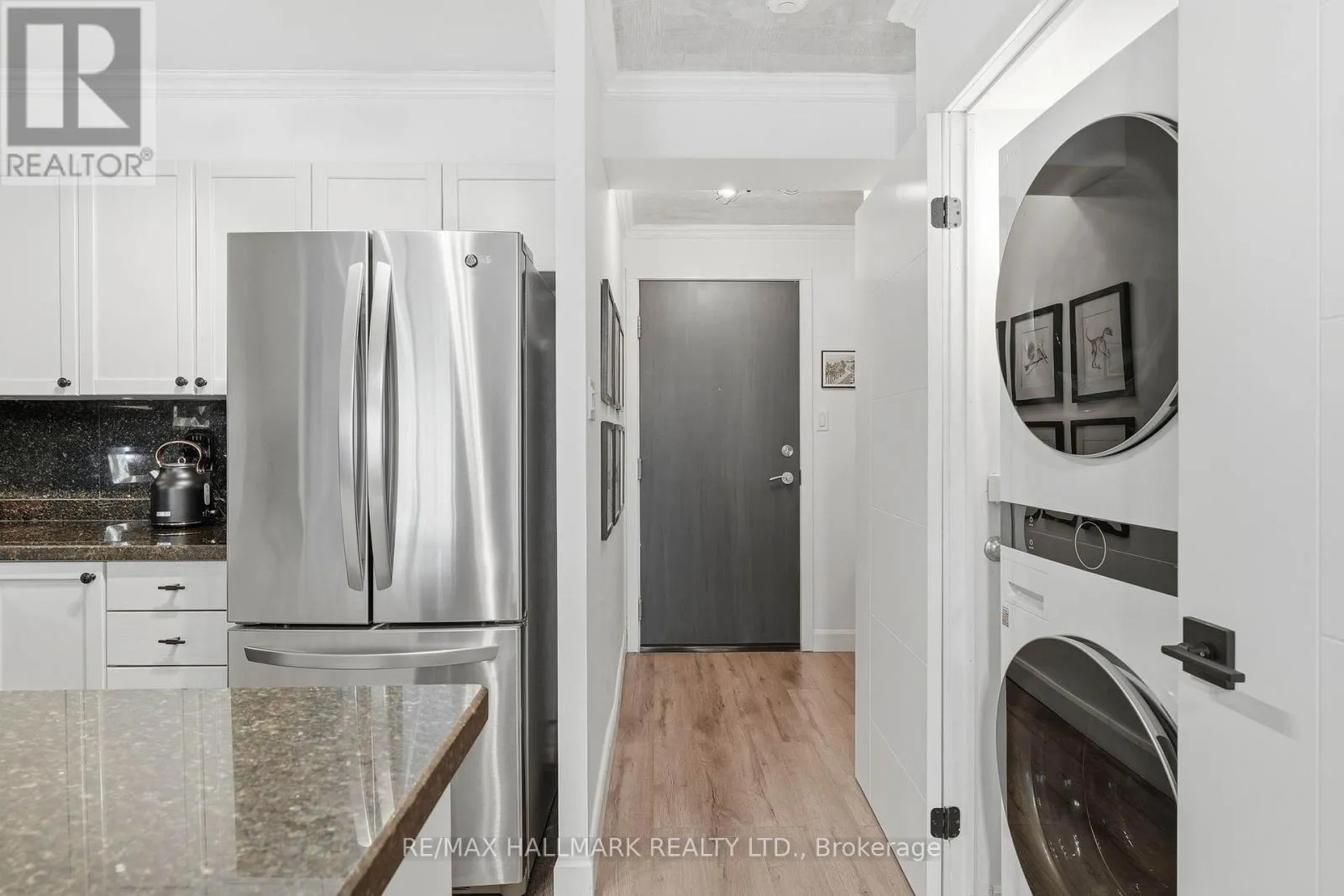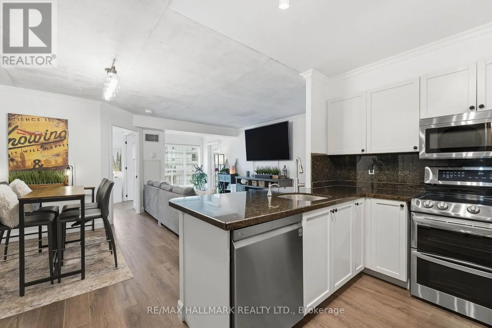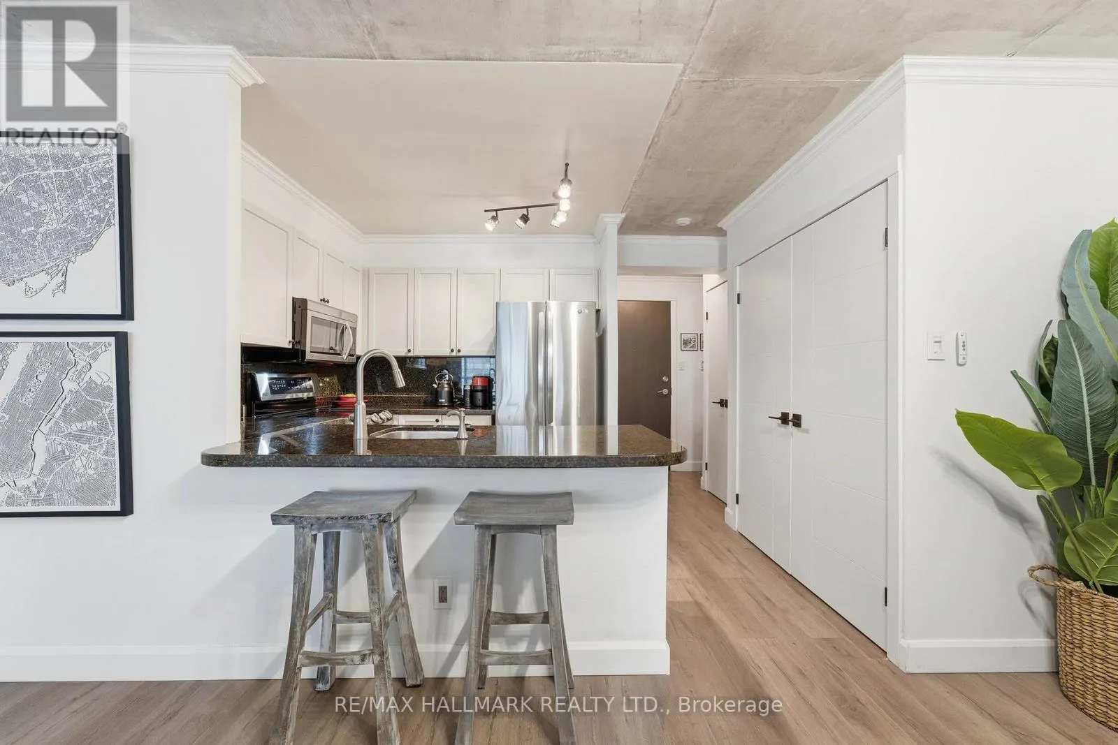 The kitchen anchors the open concept living and dining space with a custom granite peninsula, breakfast bar, matching backsplash, and LG stainless steel appliances. The primary bedroom comfortably fits a king-size setup, features a custom walk-in closet, and a clean, modern 5pc ensuite. The second bedroom, enclosed with double doors, shifts easily between a dedicated bedroom, guest room, office, or an open extension of the living space depending on the day. Daily errands are simple, with Loblaws, Farm Boy, LCBO, Shoppers Drug Mart, and more just a short 4 minute walk away, while evenings and weekends can take you to Blue Jays or Maple Leafs games, headliner concerts, or vibrant King West restaurants all within 20 minutes on foot. TTC streetcar service runs right outside the building with a direct 15-20 minute connection to Union Station transit lines. Well-managed building with all utilities included in maintenance fees - water, heat, central A/C, hydro, common elements, building insurance, one parking space and a good-sized locker. (id:27476)
