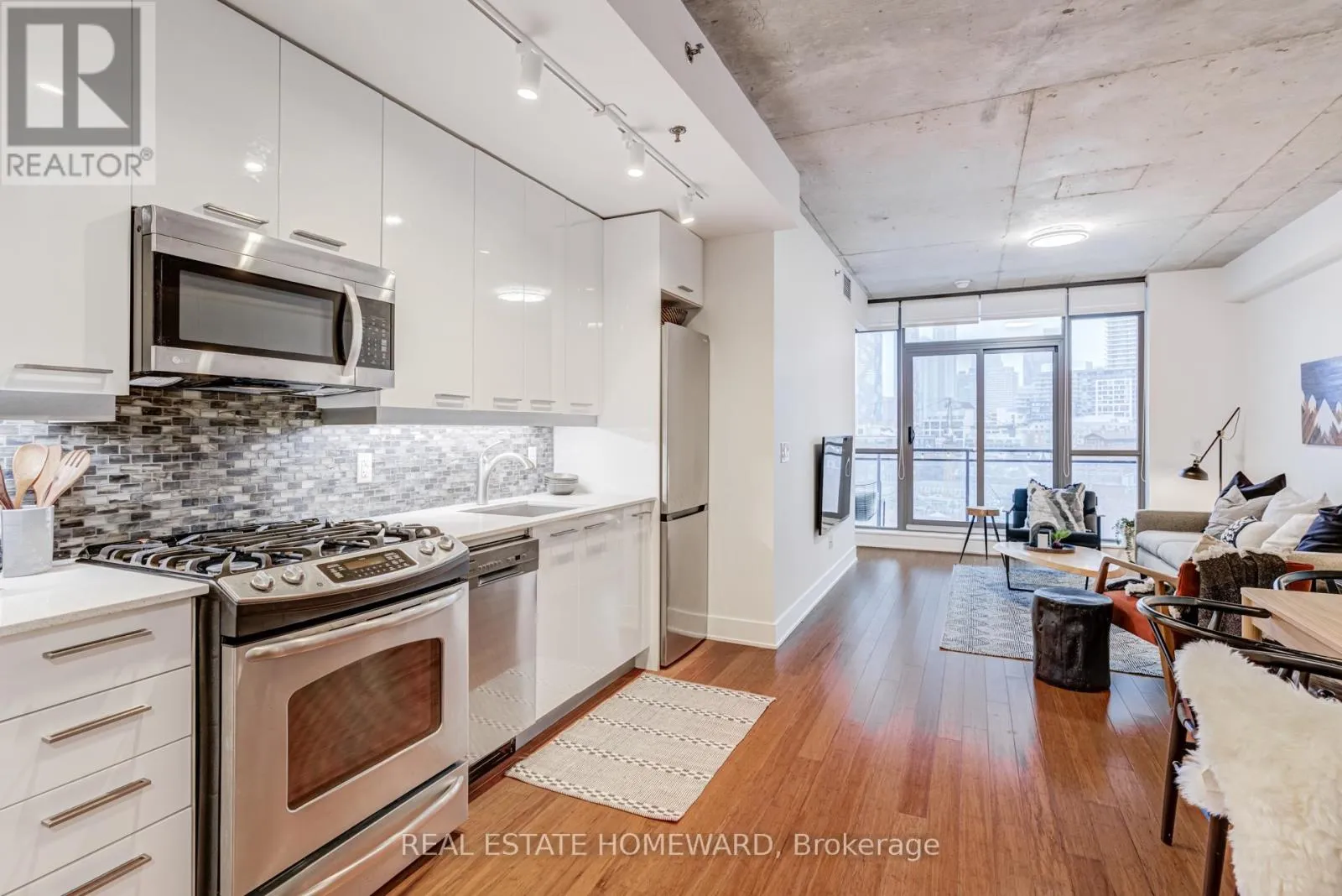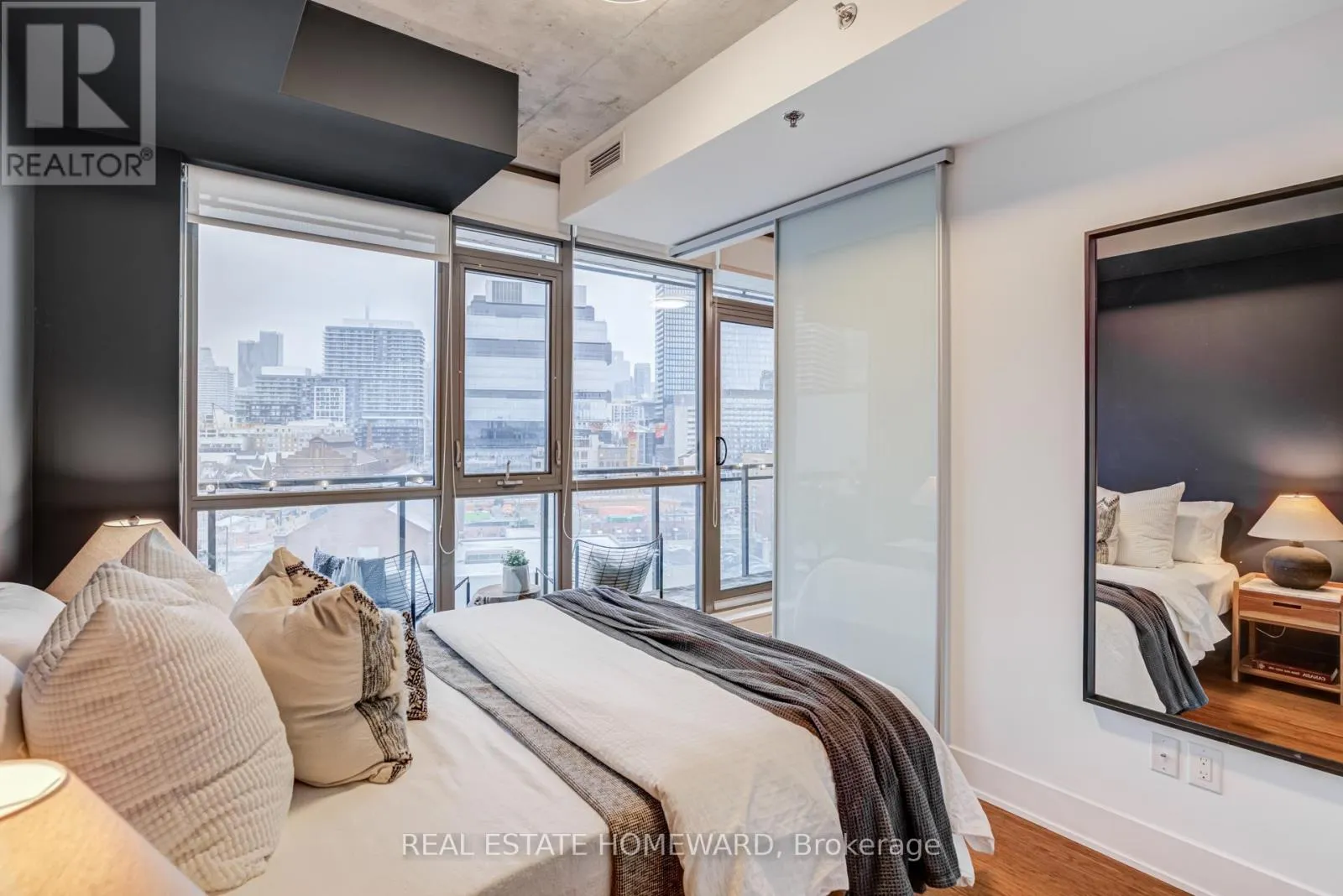 Cross Streets: Front & Parliament. ** Directions: East on Front to Eastern Avenue, north on Trinity Street. TRINITY LOFTS IN CORKTOWN / Rarely available, sun-filled suite with a highly functional open-concept layout in one of Corktown's most sought-after boutique loft buildings. Features include outfitted wardrobe closets (included), engineered hardwood floors, and 9-ft exposed concrete ceilings for a true loft feel.