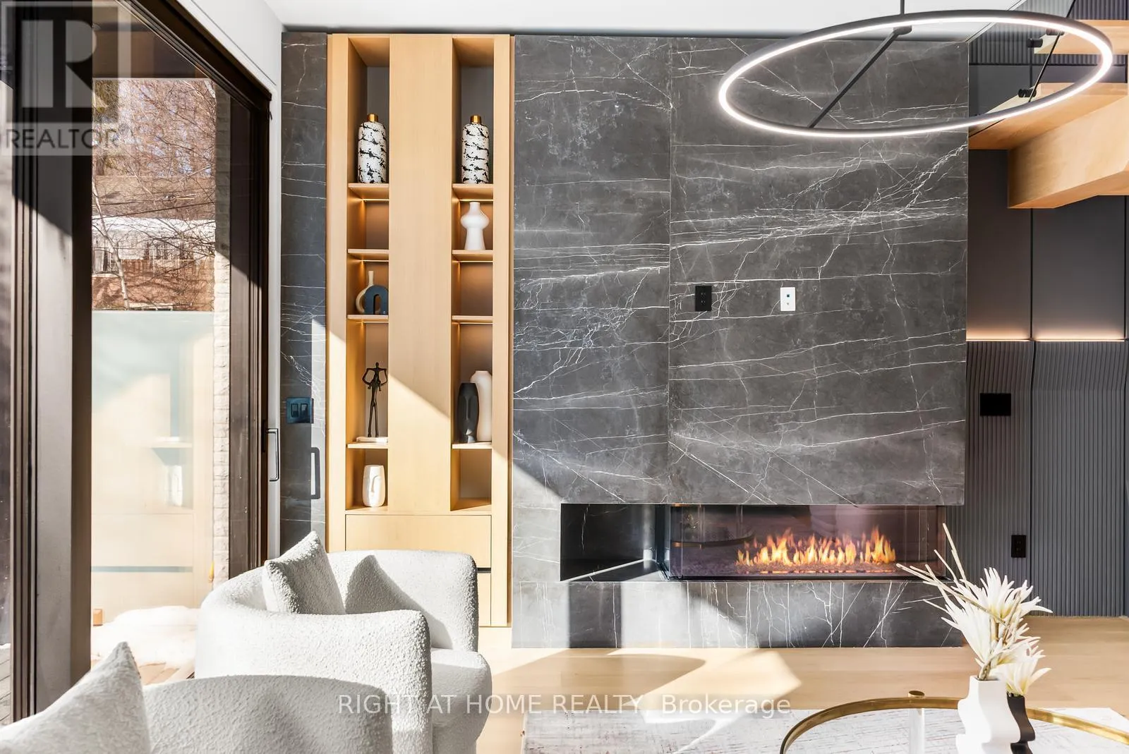 Impeccable interior detailing includes custom wall paneling and millwork, a statement mono-beam staircase, glass railings throughout, and upgraded strip lighting/fixtures.Chef's kitchen with custom-painted cabinetry, premium Sub-Zero & Wolf appliances, and natural stone countertops including Super White. Natural stone carries throughout the home (vanities, basement bar, fireplace), highlighted by a dramatic triple-sided marquee fireplace. Spa-inspired bathrooms feature CariMali Italian fixtures and wall-hung Duravit toilets, plus Italian tile and slab finishes with a strong focus on the Italian-slab basement.Enjoy a two-level, double-height heated basement with large rec room and bar area. Exterior impresses with high-quality linear brick wrapping the sides/rear/walkout, extensive interlock (including interlock driveway), and a standout snow-melt heated driveway, front porch, and rear walkout. Entertain on the composite deck and enjoy a large backyard rarely found in the area. Integrated heated garage (extremely rare in the neighbourhood), two furnaces + two A/C systems, high-efficiency spray-foam insulation, and smart security/speaker system. (id:27476)