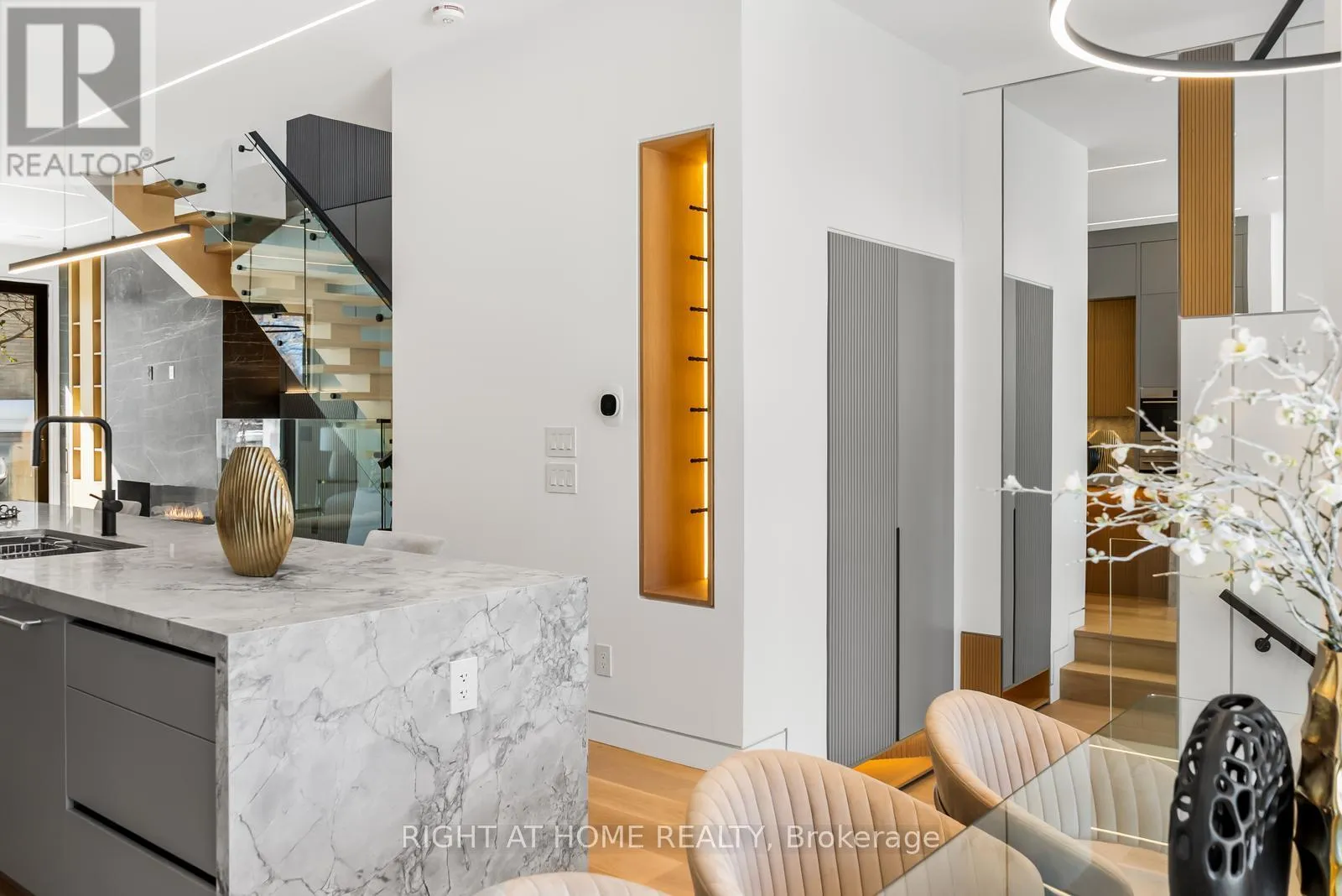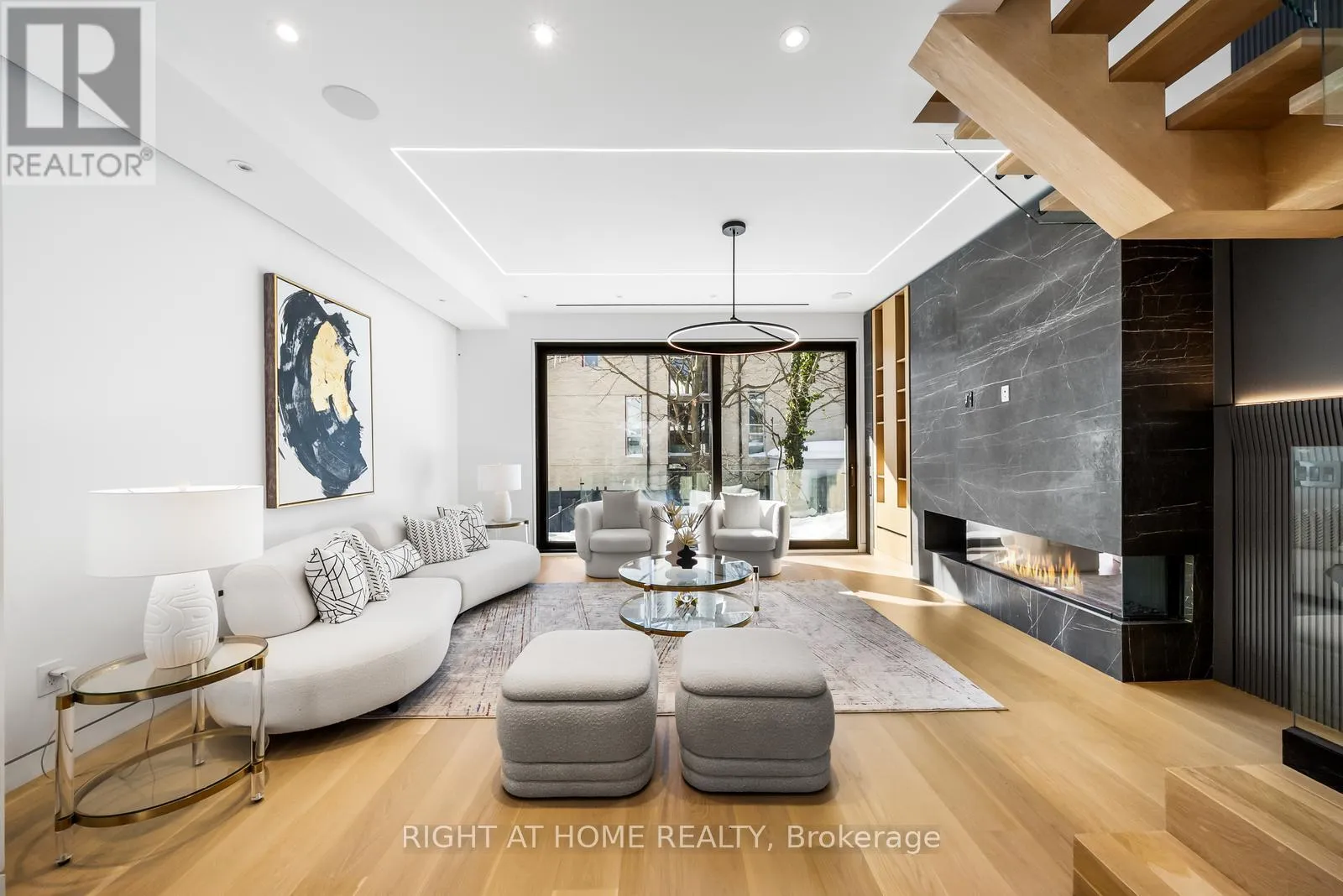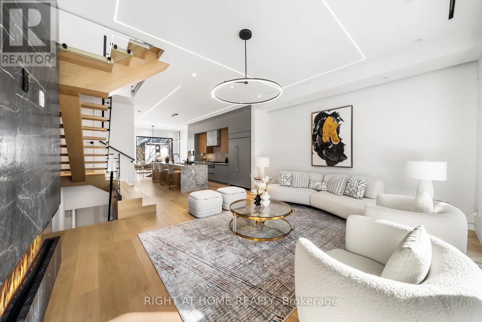 Impeccable interior detailing includes custom wall paneling and millwork, a statement mono-beam staircase, glass railings throughout, and upgraded strip lighting/fixtures. Chef's kitchen with custom-painted cabinetry, premium Sub-Zero & Wolf appliances, and natural stone countertops including Super White. Natural stone carries throughout the home (vanities, basement bar, fireplace), highlighted by a dramatic triple-sided marquee fireplace. Spa-inspired bathrooms feature CariMali Italian fixtures and wall-hung Duravit toilets, plus Italian tile and slab finishes with a strong focus on the Italian-slab basement.Enjoy a two-level, double-height heated basement with a large rec room and bar area. The exterior impresses with high-quality linear brick wrapping the sides/rear/walkout, extensive interlock (including interlock driveway), and a standout snow-melt heated system in the driveway, front porch, heated garage area, rear walkout, and even select portions of the backyard for year-round comfort. Entertain on the composite deck and enjoy a large backyard rarely found in the area, complete with composite fencing for a clean, modern finish.Integrated heated garage (extremely rare in the neighbourhood), two furnaces + two A/C systems, high-efficiency spray-foam insulation, smart security/speaker system, central vacuum, and more - a true turnkey statement home in an A+ location. (id:27476)