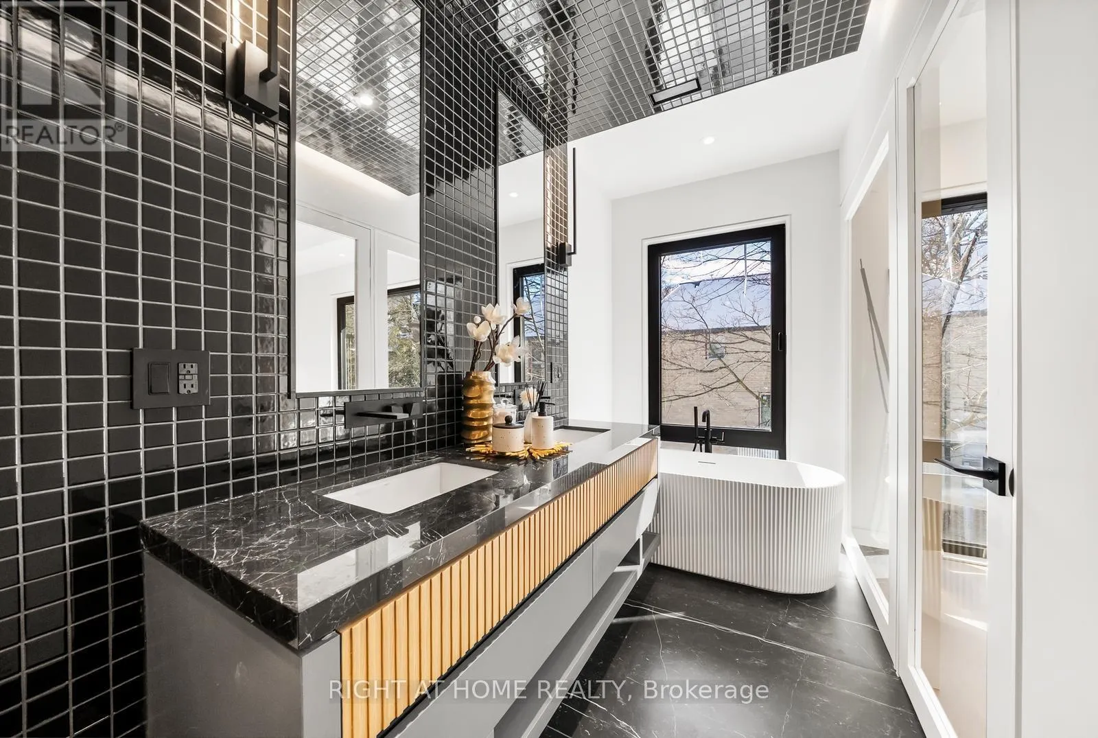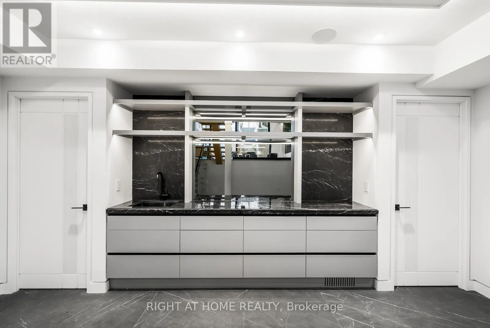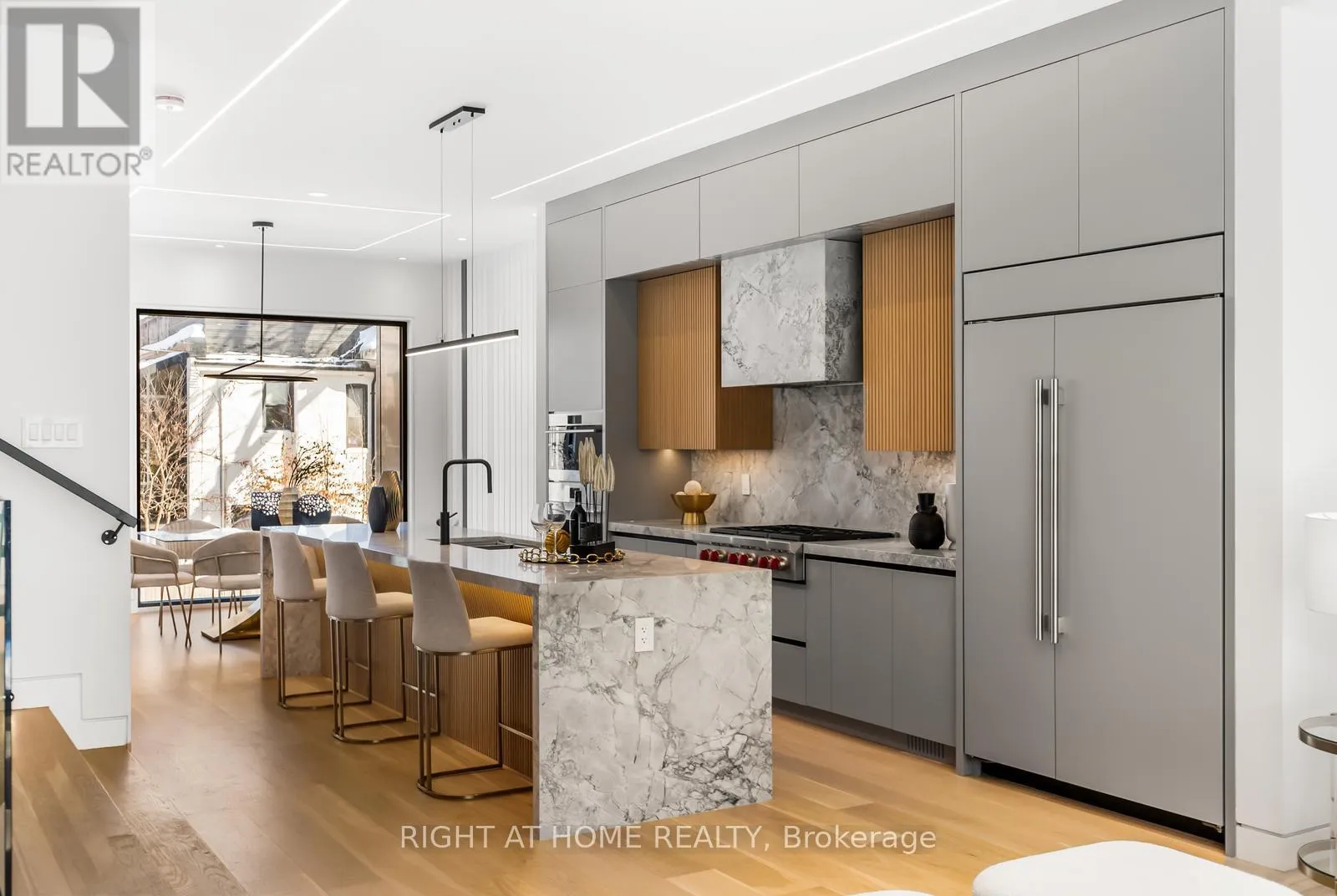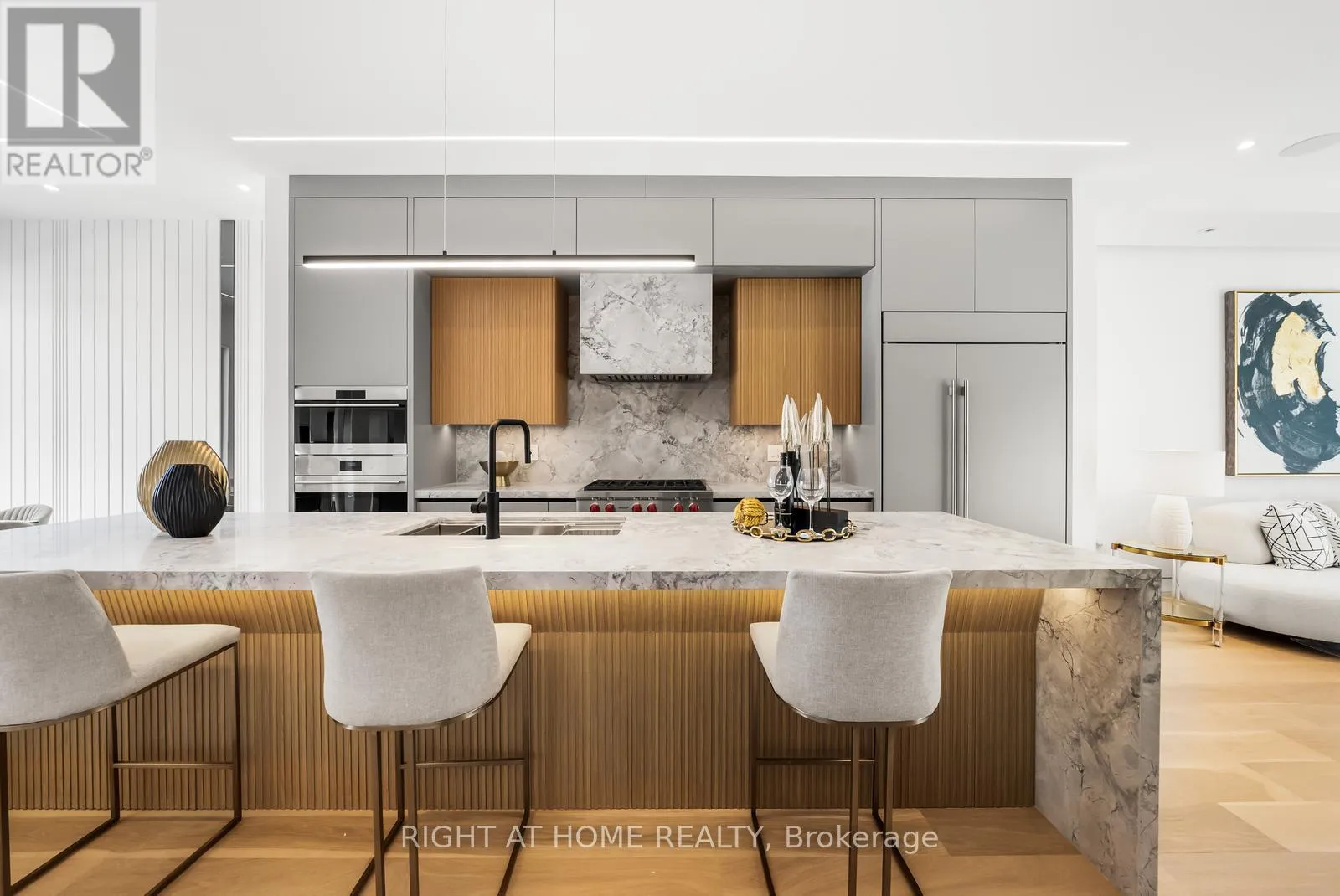 Impeccable interior detailing includes custom wall paneling and millwork, a statement mono-beam staircase, glass railings throughout, and upgraded strip lighting/fixtures. Chef's kitchen with custom-painted cabinetry, premium Sub-Zero & Wolf appliances, and natural stone countertops including Super White. Natural stone carries throughout the home (vanities, basement bar, fireplace), highlighted by a dramatic triple-sided marquee fireplace. Spa-inspired bathrooms feature CariMali Italian fixtures and wall-hung Duravit toilets, plus Italian tile and slab finishes with a strong focus on the Italian-slab basement.Enjoy a two-level, double-height heated basement with a large rec room and bar area. The exterior impresses with high-quality linear brick wrapping the sides/rear/walkout, extensive interlock (including interlock driveway), and a standout snow-melt heated system in the driveway, front porch, heated garage area, rear walkout, and even select portions of the backyard for year-round comfort. Entertain on the composite deck and enjoy a large backyard rarely found in the area, complete with composite fencing for a clean, modern finish.Integrated heated garage (extremely rare in the neighbourhood), two furnaces + two A/C systems, high-efficiency spray-foam insulation, smart security/speaker system, central vacuum, and more - a true turnkey statement home in an A+ location. (id:27476)