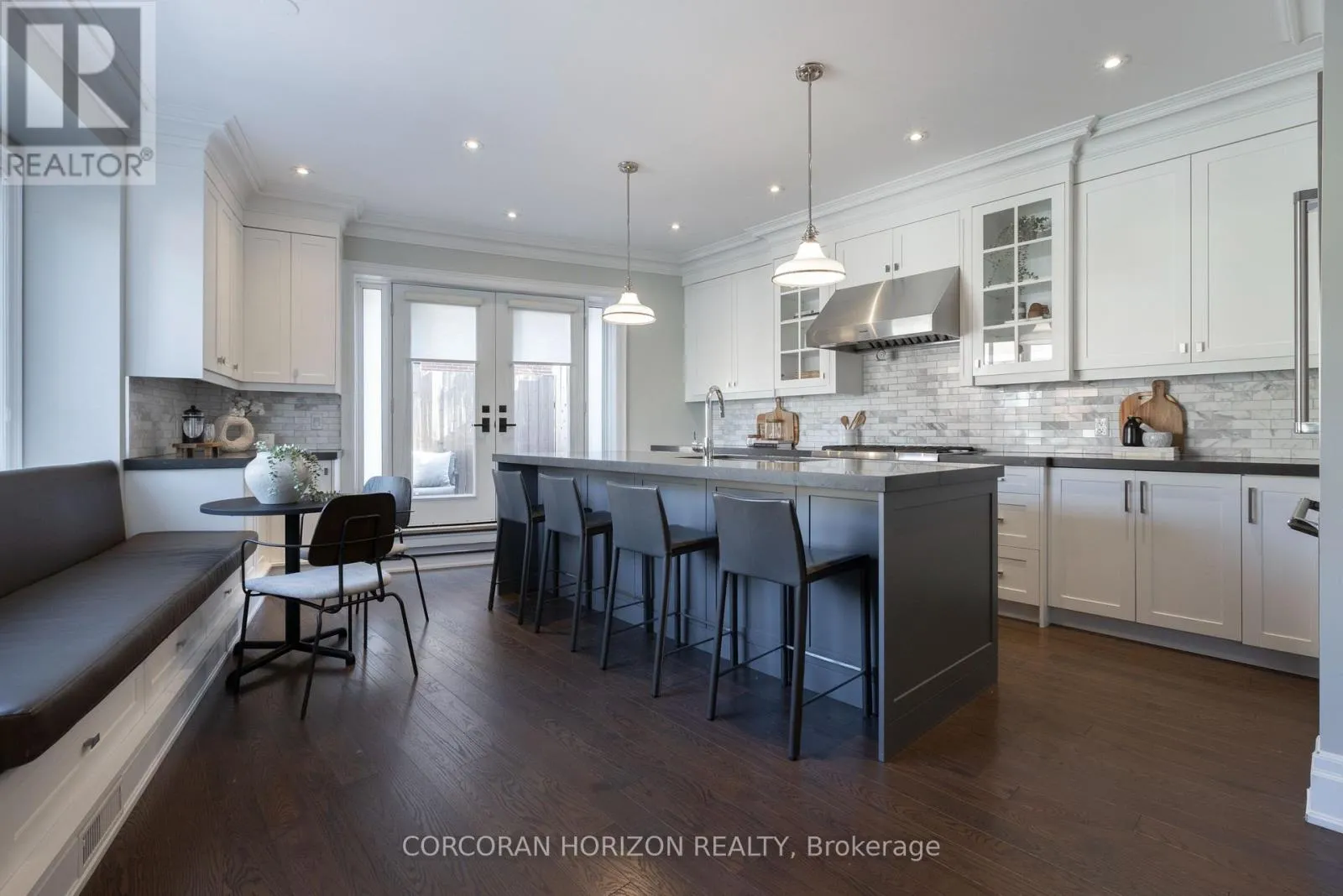 The open-concept main floor is bright, elegant, and exceptionally functional. The chef's kitchen features Thermador stainless steel appliances, a gas range, a massive granite centre island, a Parisian-style banquette for morning coffee or casual dining and French doors opening onto the deck. Thoughtfully designed custom built-ins throughout the kitchen, dining, and living areas offer abundant concealed storage while maintaining a clean, contemporary aesthetic. The marble gas fireplace anchors the main floor in warmth and charm. A chic powder room completes the main level. Upstairs, the second floor features three bright, spacious bedrooms, one with a modern 3-piece ensuite. The large family bath with double marble vanity, a full laundry room and two linen closets round out this level. The third floor is devoted to the luxurious primary suite, with two walk-in closets, a serene den or office, and a spa-inspired ensuite with two marble vanities, a glass shower and freestanding tub. Over 900sf of luxury all to yourself! The finished lower level includes a large recreation room, generous storage areas, and an immaculate 1.5-car garage equipped with a 240V EV charging outlet, built-in bicycle racks, and automatic door. No more maintenance, landscaping & snow-removal included in low monthly fee. Beautifully appointed, intelligently designed, and located in the heart of Leaside, this home truly offers it all! (id:27476)