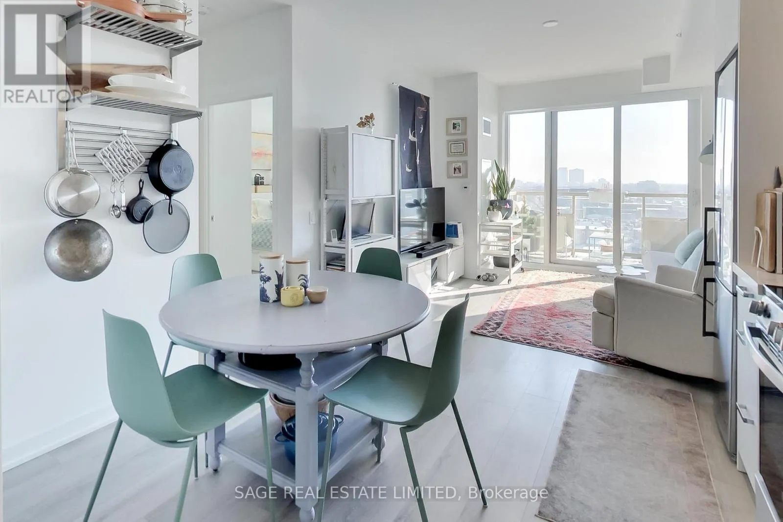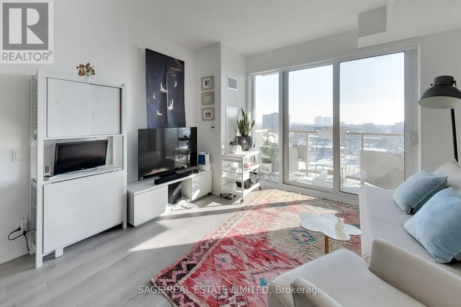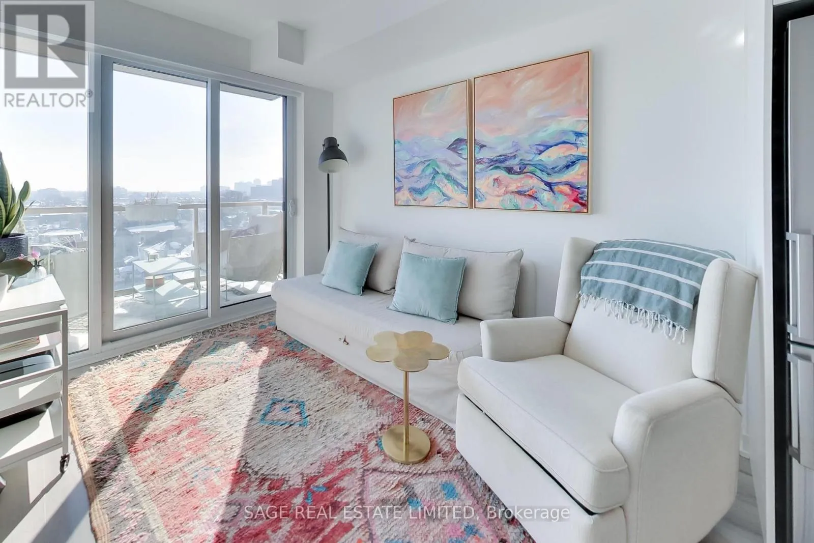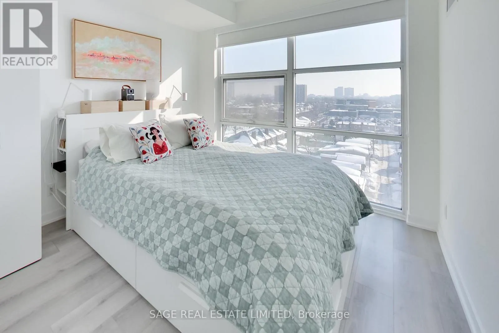 The kitchen impresses with stainless-steel appliances, a large custom pantry, quartz counters/backsplash, a marble accent backsplash, and a reverse osmosis water filter. Integrated storage and built-ins continue throughout, complemented by sleek roller shades on all the windows for a polished finish. The spacious living area opens to a balcony overlooking a tree-lined neighbourhood, with unobstructed skyline views and beautiful sunrises. The bedroom shares the same view through floor-to-ceiling windows and includes a generous walk-in closet, while the four-piece bath pairs clean, modern design with function and more built-in storage. Steps from your front door, enjoy local cafés, restaurants, and everyday conveniences along St Clair West, or head to Stockyards Village for shopping and dining. The TTC streetcar is right outside, connecting you seamlessly to the rest of the city. High Park is a short ride or scenic walk away, and nearby Earlscourt Park offers pools, rinks, sports fields, and fitness facilities. Building amenities include a concierge, gym, party room, playroom, and rooftop deck with more unobstructed skyline views. A perfect balance of style, comfort, and community - this is west-end living done right. (id:27476)