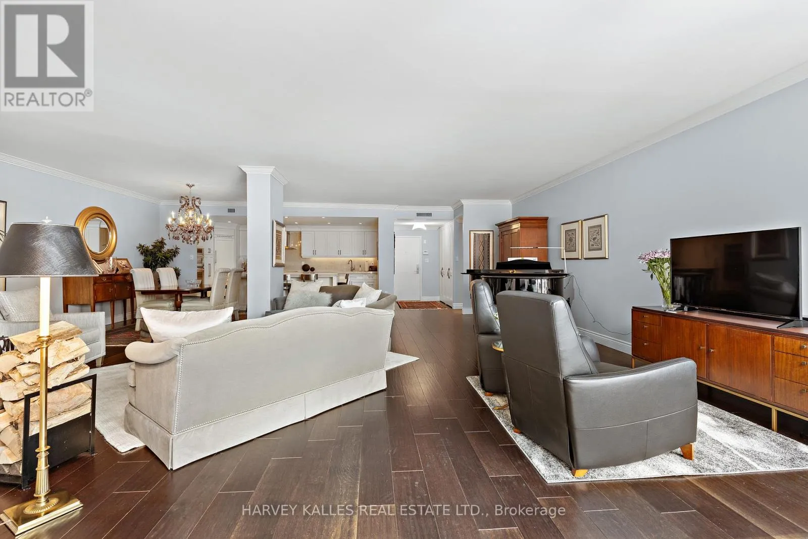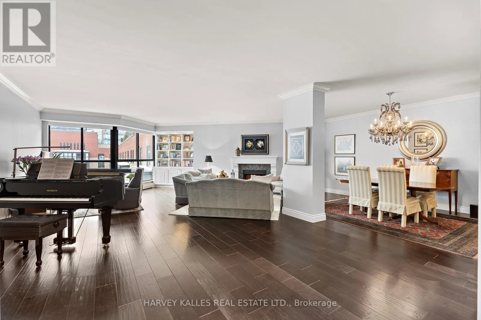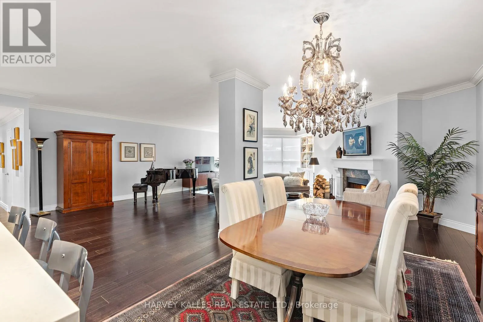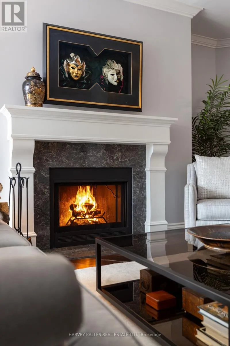 Hand-scraped engineered hardwood floors, nine-foot ceilings, and crown mouldings create a composed and welcoming backdrop. The open layout flows naturally from living to dining to kitchen, anchored by a wood-burning fireplace framed in Caesarstone quartz with a custom mantle. The kitchen features a generous Caesarstone island, matching counters and backsplash, and custom cabinetry designed for practical, everyday use.The primary suite is a serene retreat with custom floor-to-ceiling closets and a well-appointed ensuite boasting an oversized shower, stone-topped vanity, and Rubinet fixtures. The second full bath, finished in Carrara tile and marble, continues the home's timeless aesthetic.A premium double-sized parking space adjacent to the elevator ensures everyday convenience. With remarkably low maintenance fees for its size and a rooftop terrace only forty steps from the stair door, effortless indoor-outdoor living is always within reach. Market Square offers 24-hour concierge and security, indoor salt-water pool, infra-red sauna, two fitness rooms, squash court, curated lending library, workshop, landscaped courtyard, and two rooftop terraces with panoramic views and natural gas and charcoal BBQs. Elegant new lobby (2025) and refurbished corridors reflect thoughtful reinvestment. Just steps from St. Lawrence Market, this is a condominium for those seeking space, comfort, and a home-like feel without compromise. (id:27476)