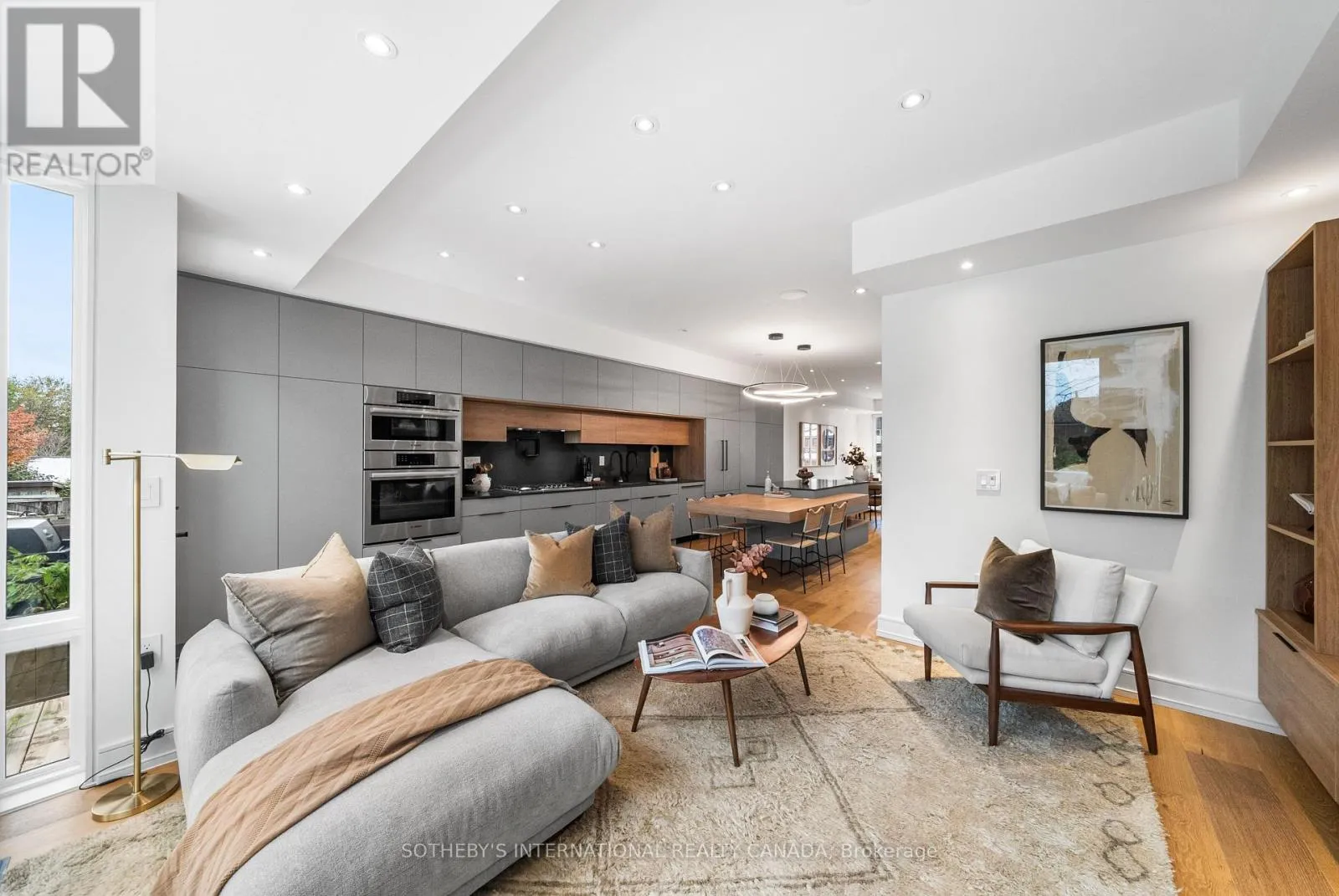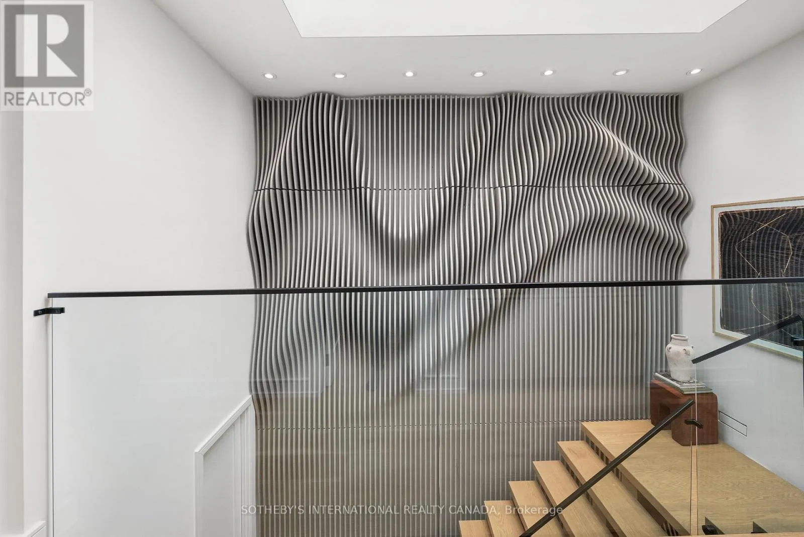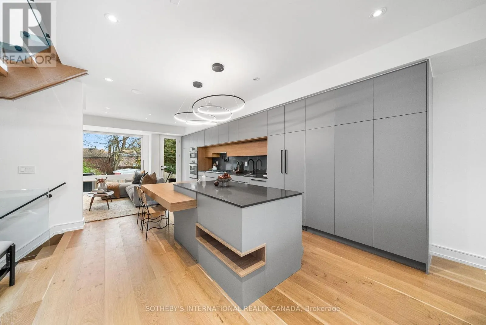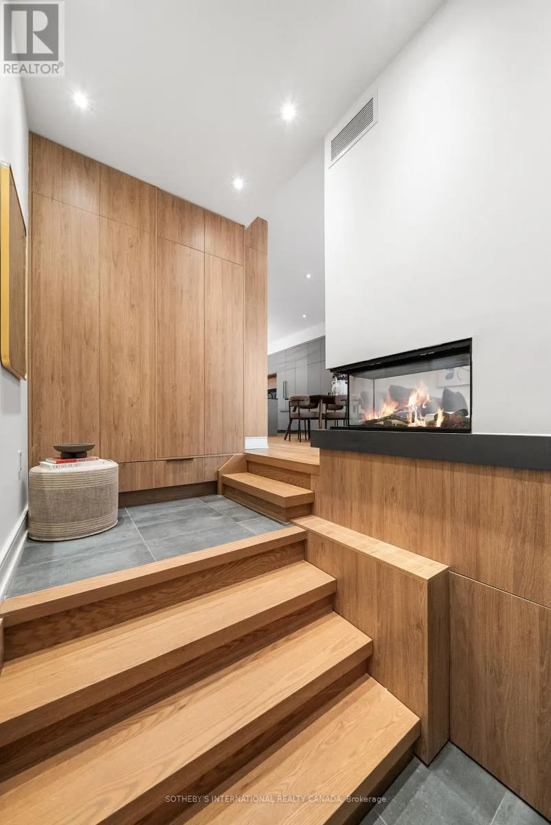 A gas fireplace adds warmth, while the custom kitchen combines quartz counters, integrated dining, and built-in cabinetry designed for everyday living. At the rear of the home, the family room features warm custom-built-ins and opens through a glass door to a lovely private garden with a beautiful garden shed. A sculptural staircase ascends beside a dramatic 27-foot feature wall crowned by a skylight, drawing natural light deep into the home. Upstairs, the primary suite offers a calm retreat with custom wall-to-wall built-in closets, floor-to-ceiling windows, and a spa-inspired ensuite with a walk-in shower and deep soaking tub. Three additional generously sized bedrooms and a well-appointed laundry room- illuminated by its own skylight- complete the second level. The lower level extends the living space with a bright recreation room featuring a wet bar, built-in storage, and a large glass door that opens directly to the backyard. A convenient side-door entry enhances functionality, and a private guest bedroom and full bath provide comfort and flexibility for visitors. A built-in garage and private drive offer parking for three vehicles. Every finish, fixture, and proportion reflects careful thought- creating a home that feels both refined and welcoming. (id:27476)