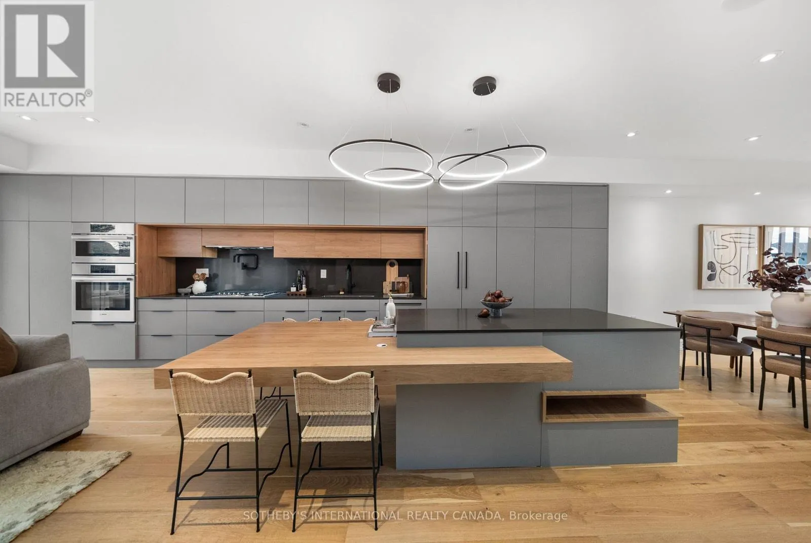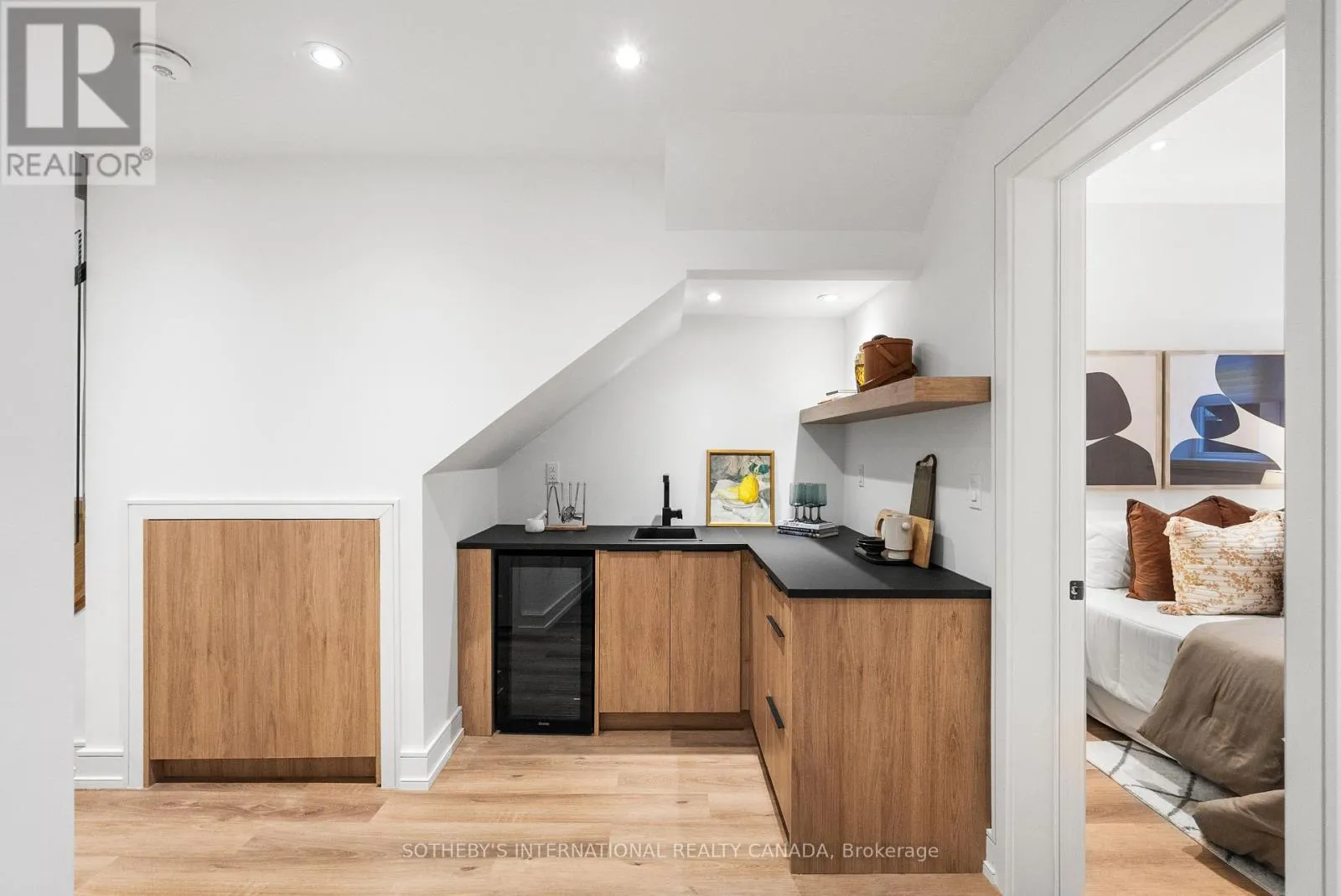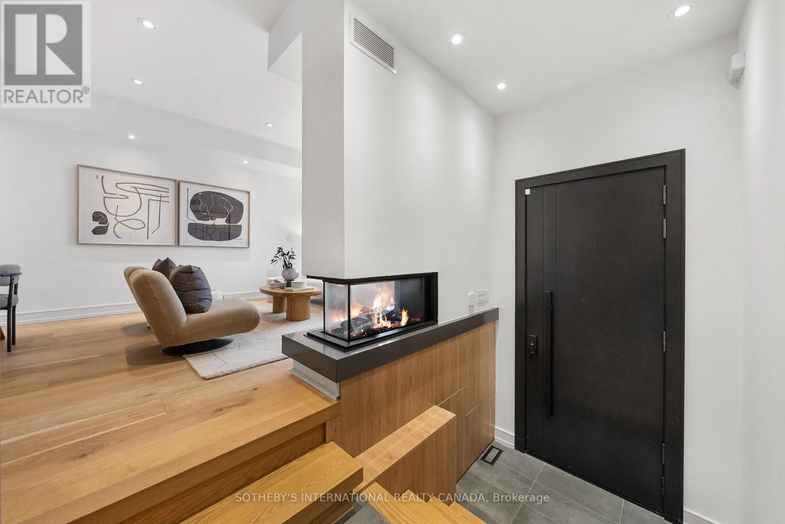 A gas fireplace adds warmth, while the custom kitchen combines quartz counters, integrated dining, and built-in cabinetry designed for everyday living. At the rear of the home, the family room features warm custom-built-ins and opens through a glass door to a lovely private garden with a beautiful garden shed. A sculptural staircase ascends beside a dramatic 27-foot feature wall crowned by a skylight, drawing natural light deep into the home. Upstairs, the primary suite offers a calm retreat with custom wall-to-wall built-in closets, floor-to-ceiling windows, and a spa-inspired ensuite with a walk-in shower and deep soaking tub. Three additional generously sized bedrooms and a well-appointed laundry room- illuminated by its own skylight- complete the second level. The lower level extends the living space with a bright recreation room featuring a wet bar, built-in storage, and a large glass door that opens directly to the backyard. A convenient side-door entry enhances functionality, and a private guest bedroom and full bath provide comfort and flexibility for visitors. A built-in garage and private drive offer parking for three vehicles. Every finish, fixture, and proportion reflects careful thought- creating a home that feels both refined and welcoming. (id:27476)