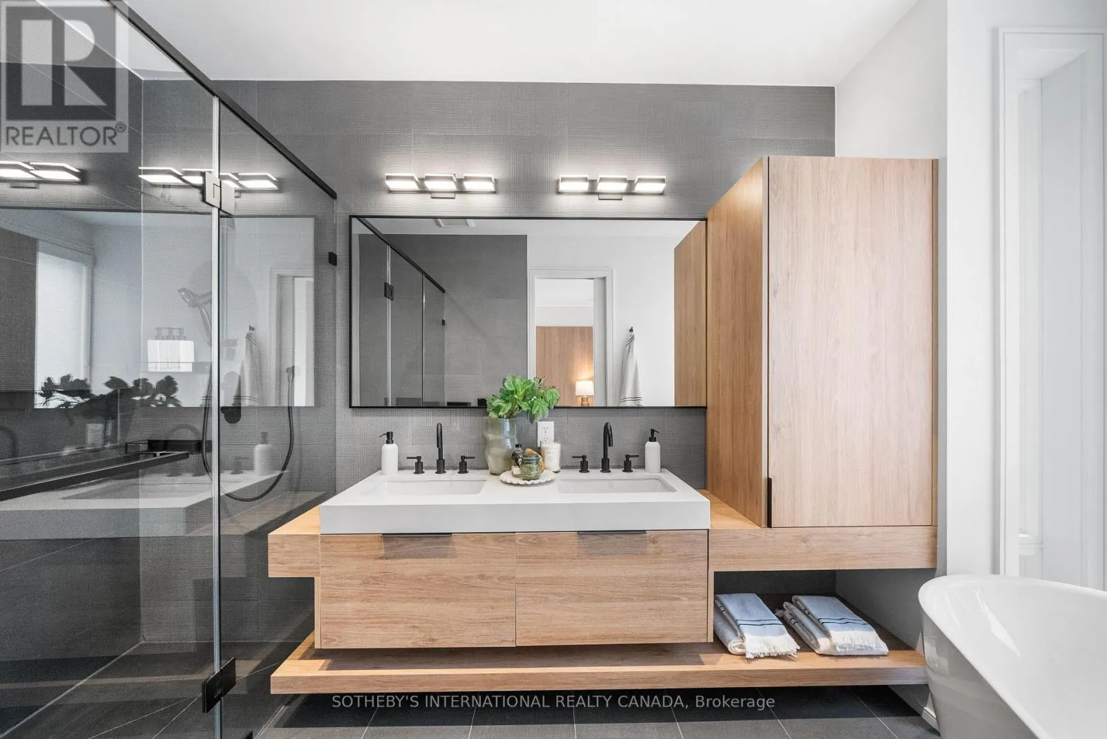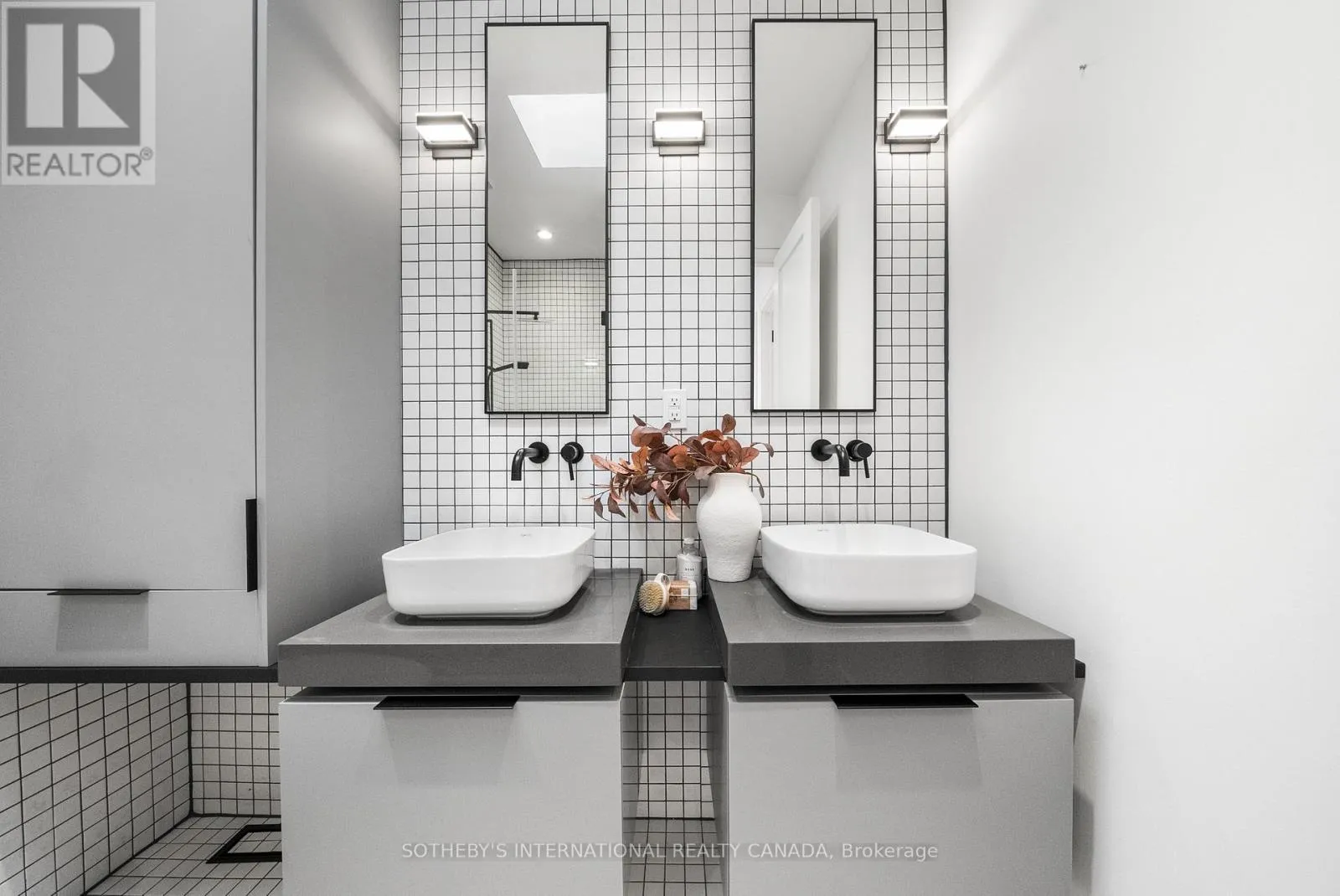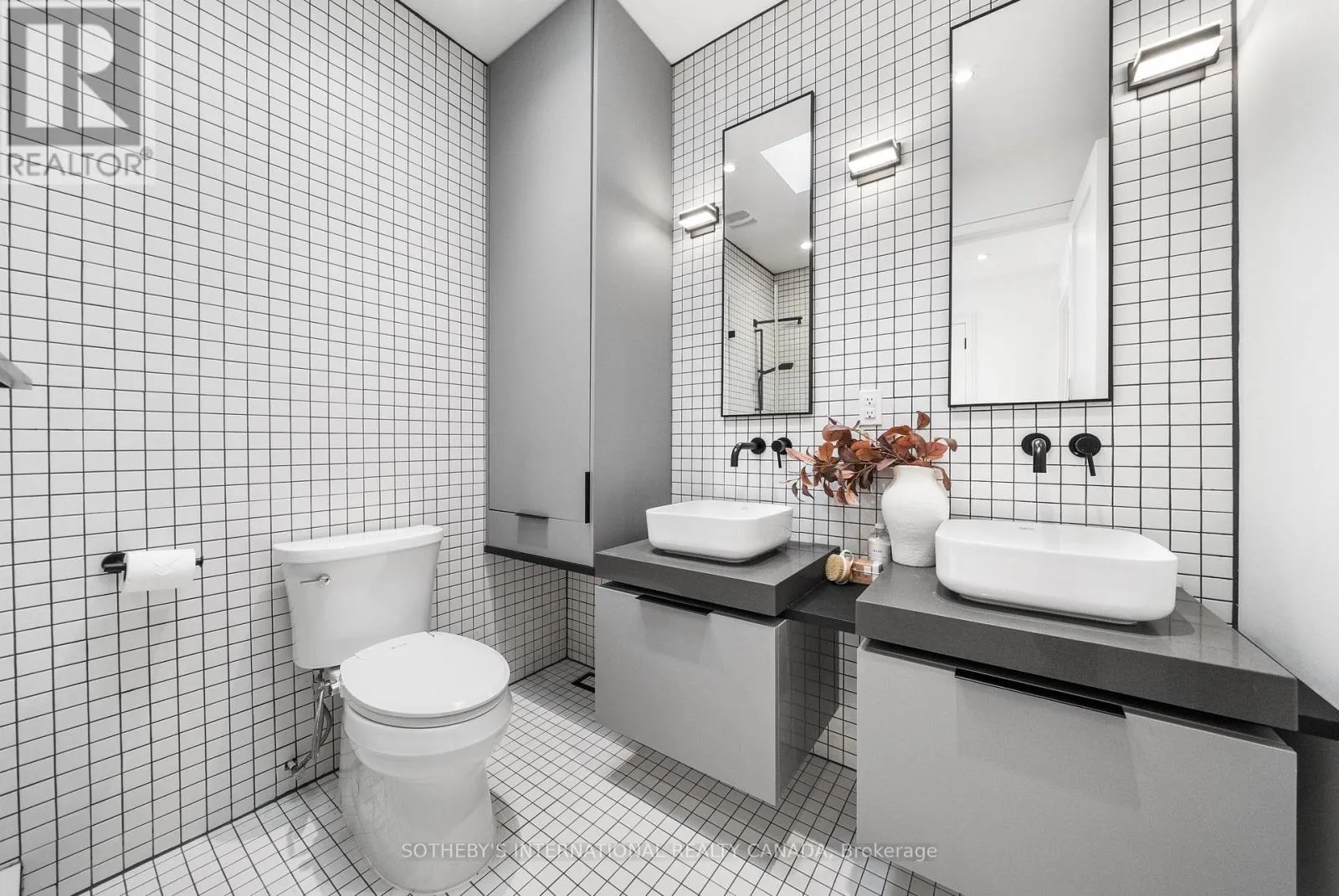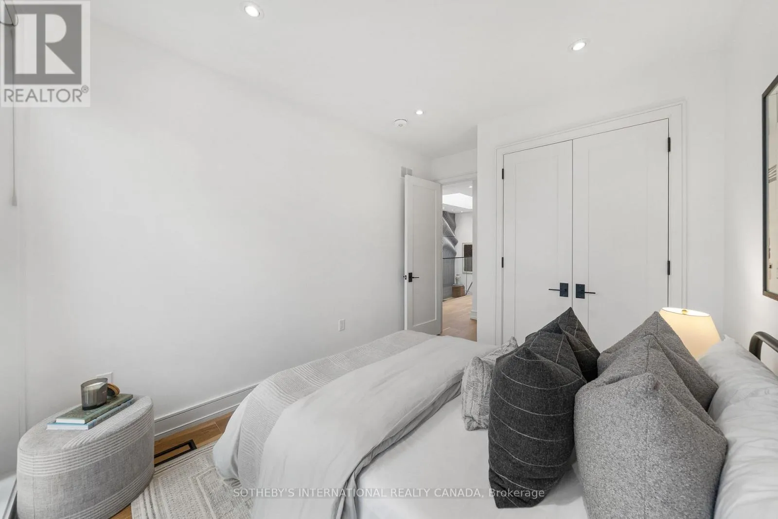 A gas fireplace adds warmth, while the custom kitchen combines quartz counters, integrated dining, and built-in cabinetry designed for everyday living. At the rear of the home, the family room features warm custom-built-ins and opens through a glass door to a lovely private garden with a beautiful garden shed. A sculptural staircase ascends beside a dramatic 27-foot feature wall crowned by a skylight, drawing natural light deep into the home. Upstairs, the primary suite offers a calm retreat with custom wall-to-wall built-in closets, floor-to-ceiling windows, and a spa-inspired ensuite with a walk-in shower and deep soaking tub. Three additional generously sized bedrooms and a well-appointed laundry room- illuminated by its own skylight- complete the second level. The lower level extends the living space with a bright recreation room featuring a wet bar, built-in storage, and a large glass door that opens directly to the backyard. A convenient side-door entry enhances functionality, and a private guest bedroom and full bath provide comfort and flexibility for visitors. A built-in garage and private drive offer parking for three vehicles. Every finish, fixture, and proportion reflects careful thought- creating a home that feels both refined and welcoming. (id:27476)