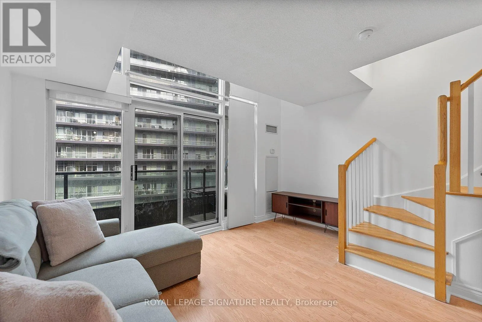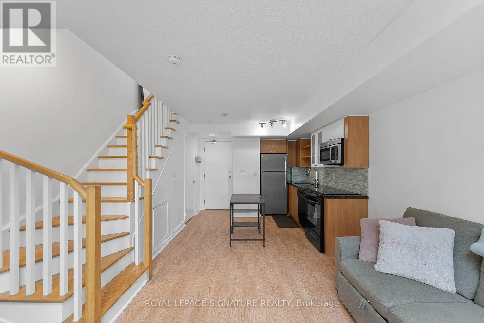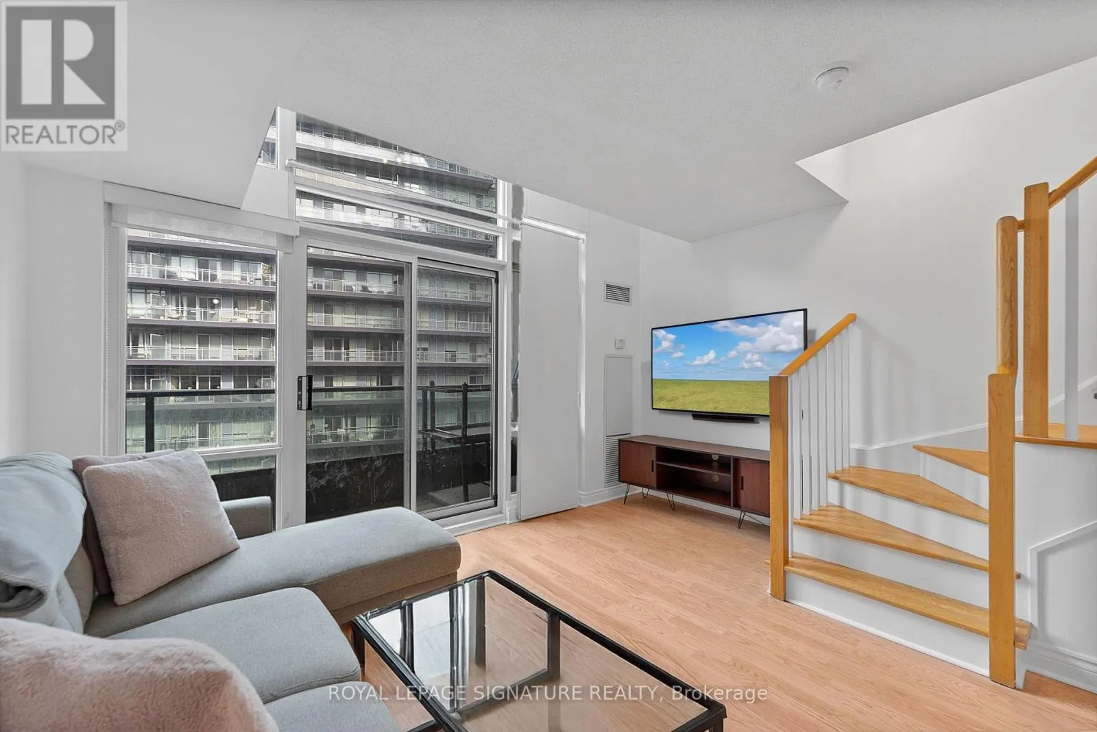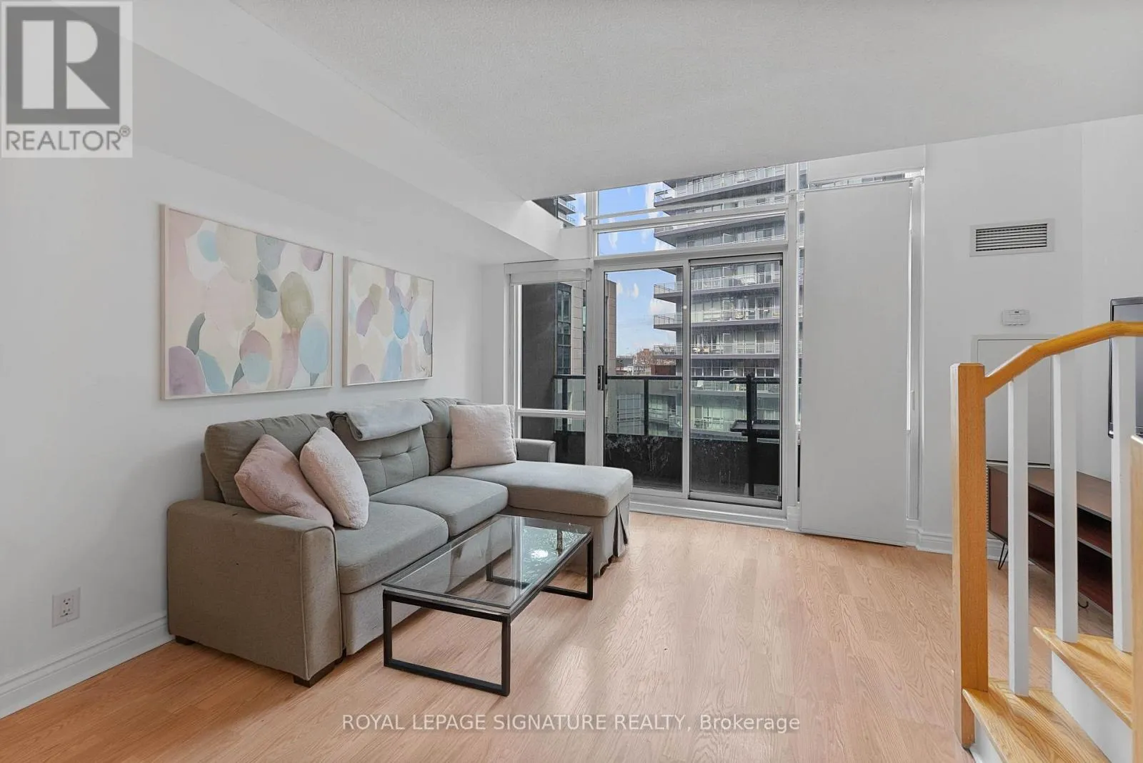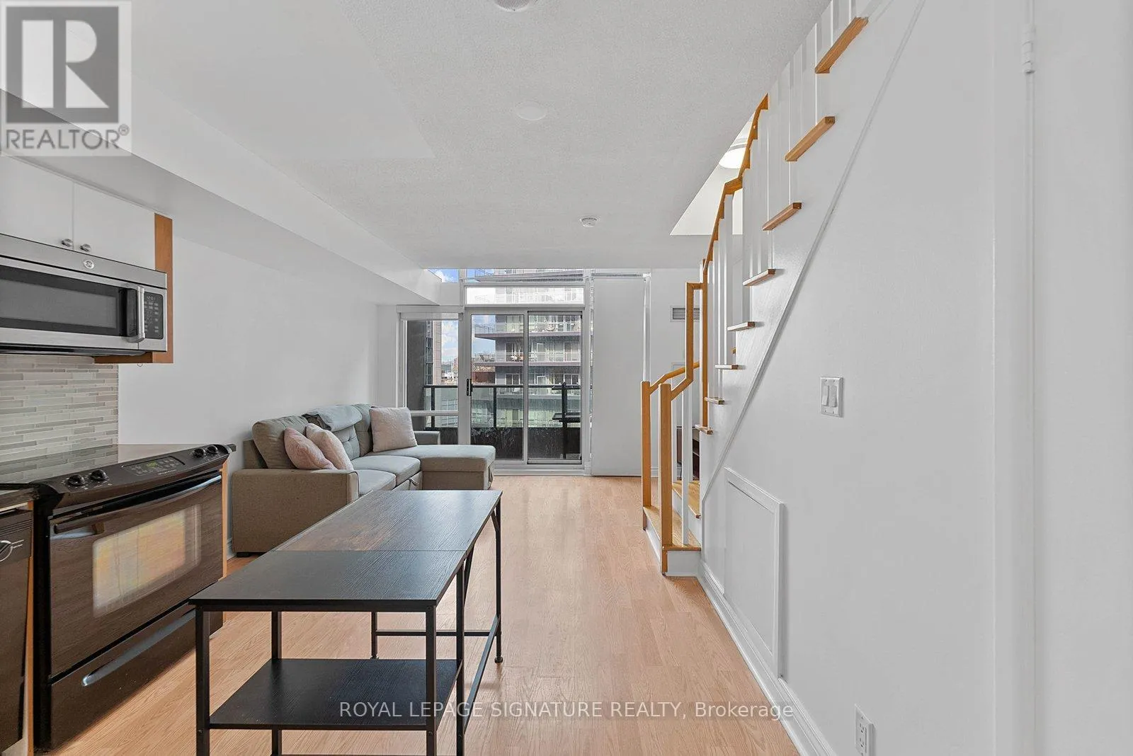 Bathurst And Lake Shore Turn-key and freshly painted, this bright two-storey suite offers a functional layout and exceptional natural light. The kitchen is generously sized and overlooking the living room, creating an open and connected main living space . The living room features a walk-out to the balcony and dramatic two-storey, floor-to-ceiling windows that fill the suite with natural light. A convenient 2-piece powder room completes the main level.