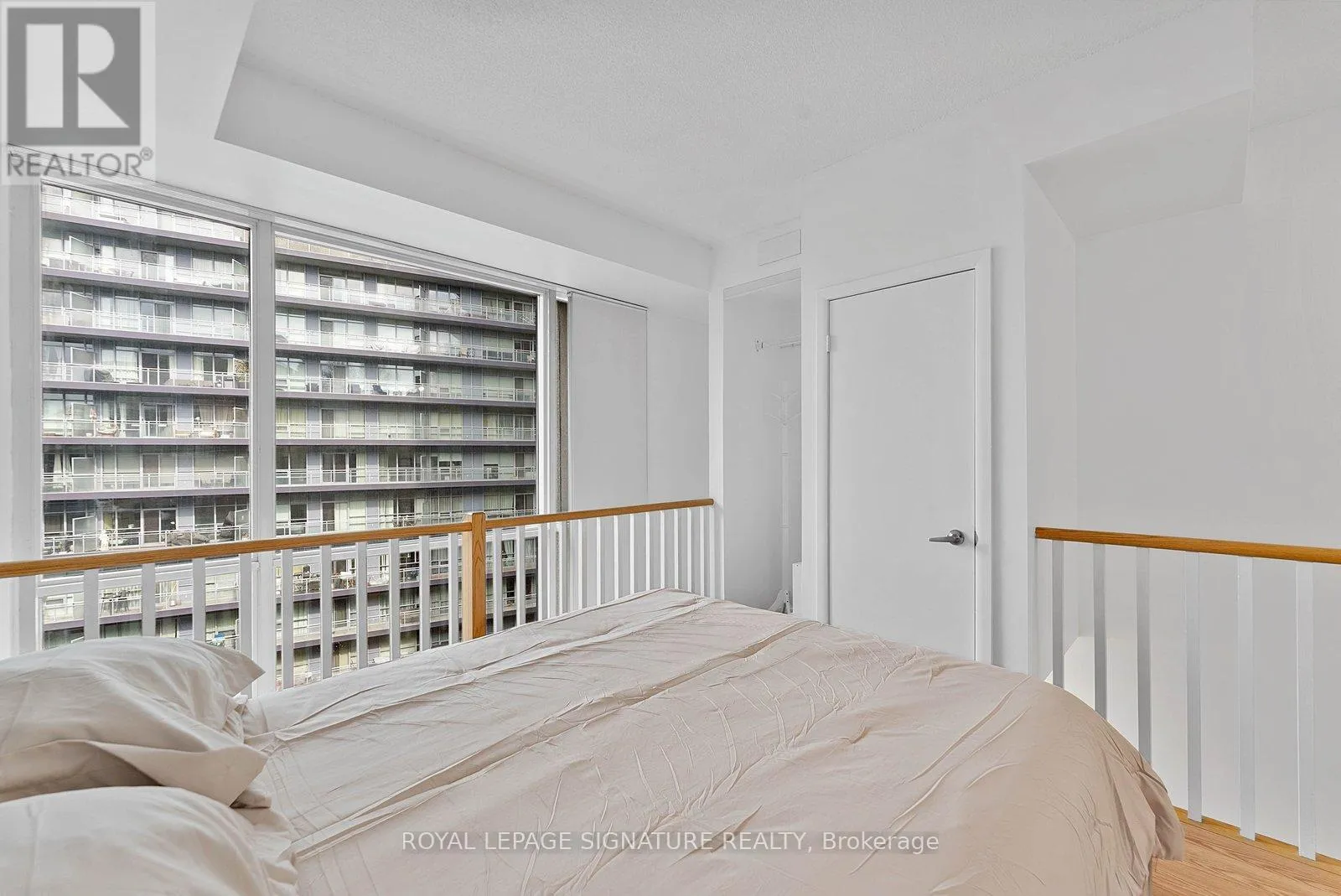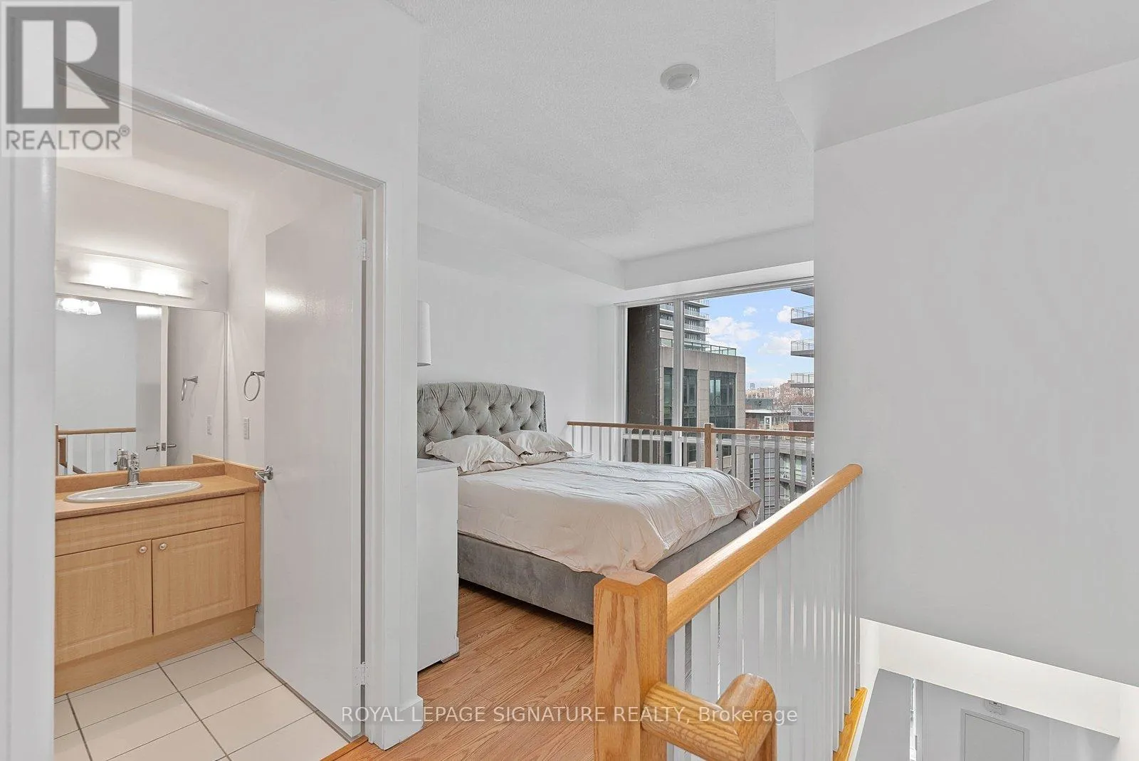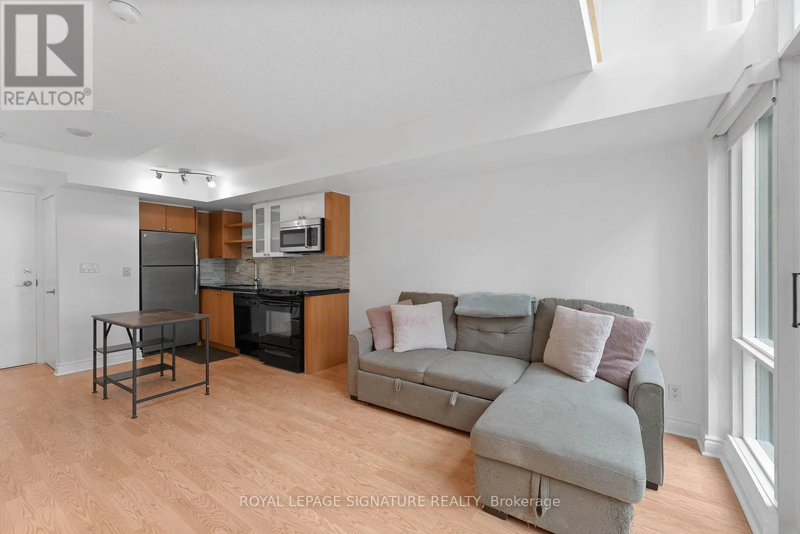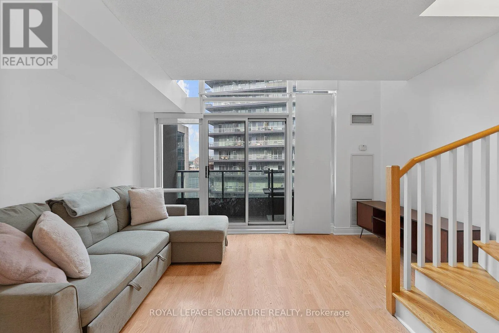 Bathurst And Lake Shore Turn-key and freshly painted, this bright two-storey suite offers a functional layout and exceptional natural light. The kitchen is generously sized and overlooking the living room, creating an open and connected main living space . The living room features a walk-out to the balcony and dramatic two-storey, floor-to-ceiling windows that fill the suite with natural light. A convenient 2-piece powder room completes the main level.