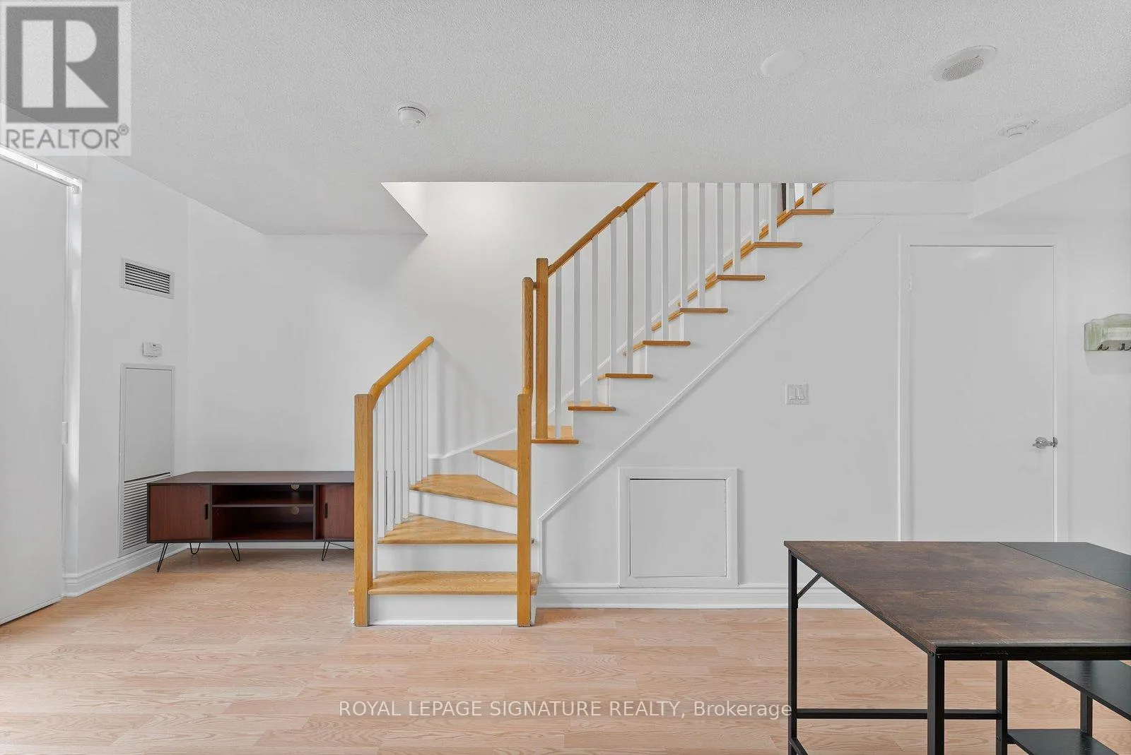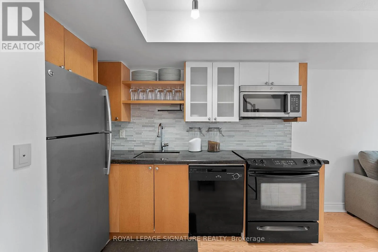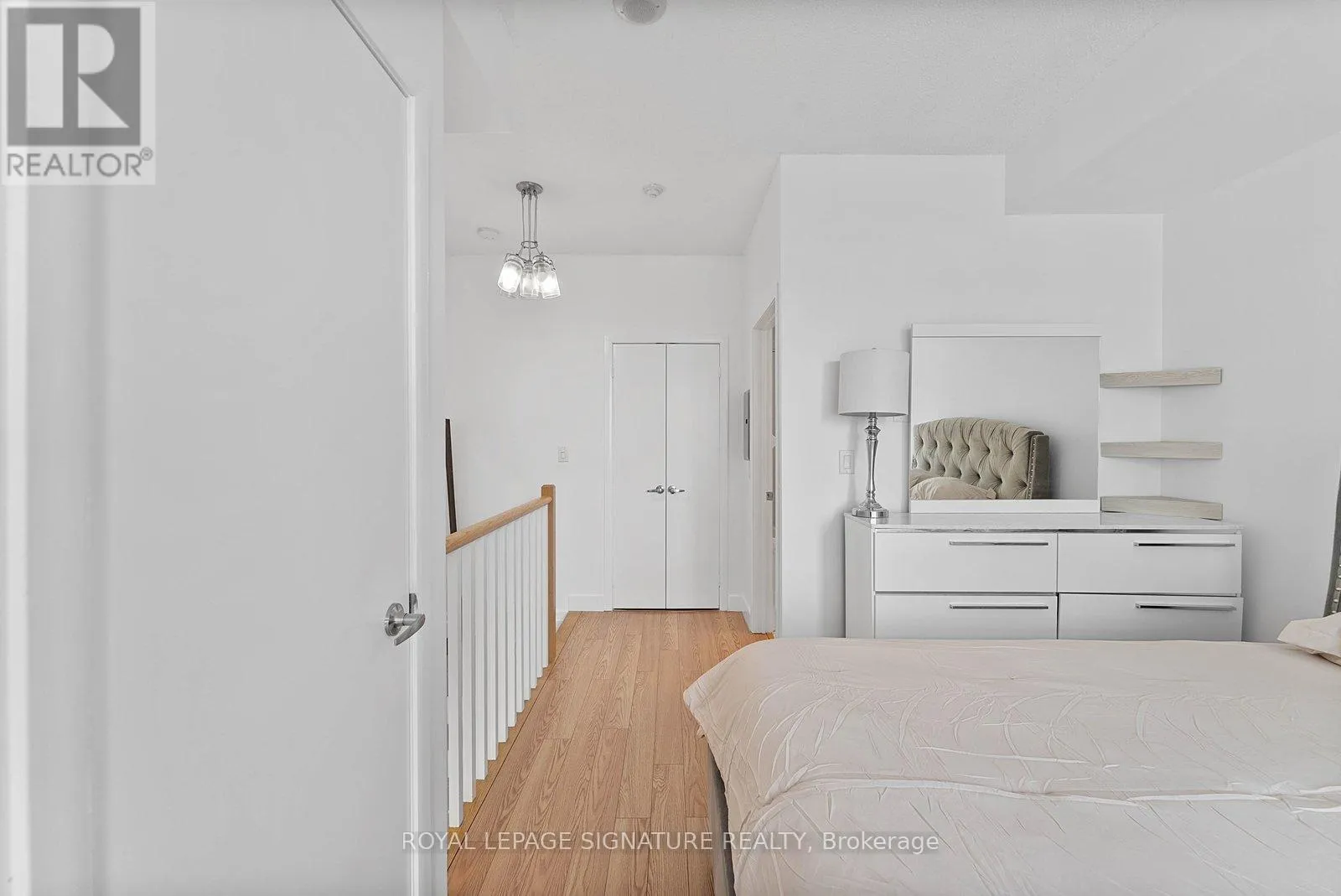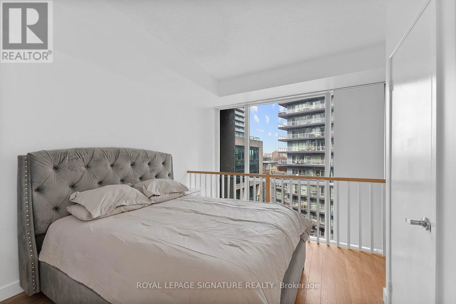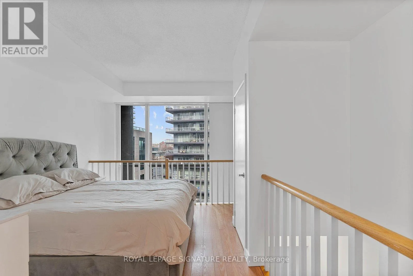 Bathurst And Lake Shore Turn-key and freshly painted, this bright two-storey suite offers a functional layout and exceptional natural light. The kitchen is generously sized and overlooking the living room, creating an open and connected main living space . The living room features a walk-out to the balcony and dramatic two-storey, floor-to-ceiling windows that fill the suite with natural light. A convenient 2-piece powder room completes the main level.
