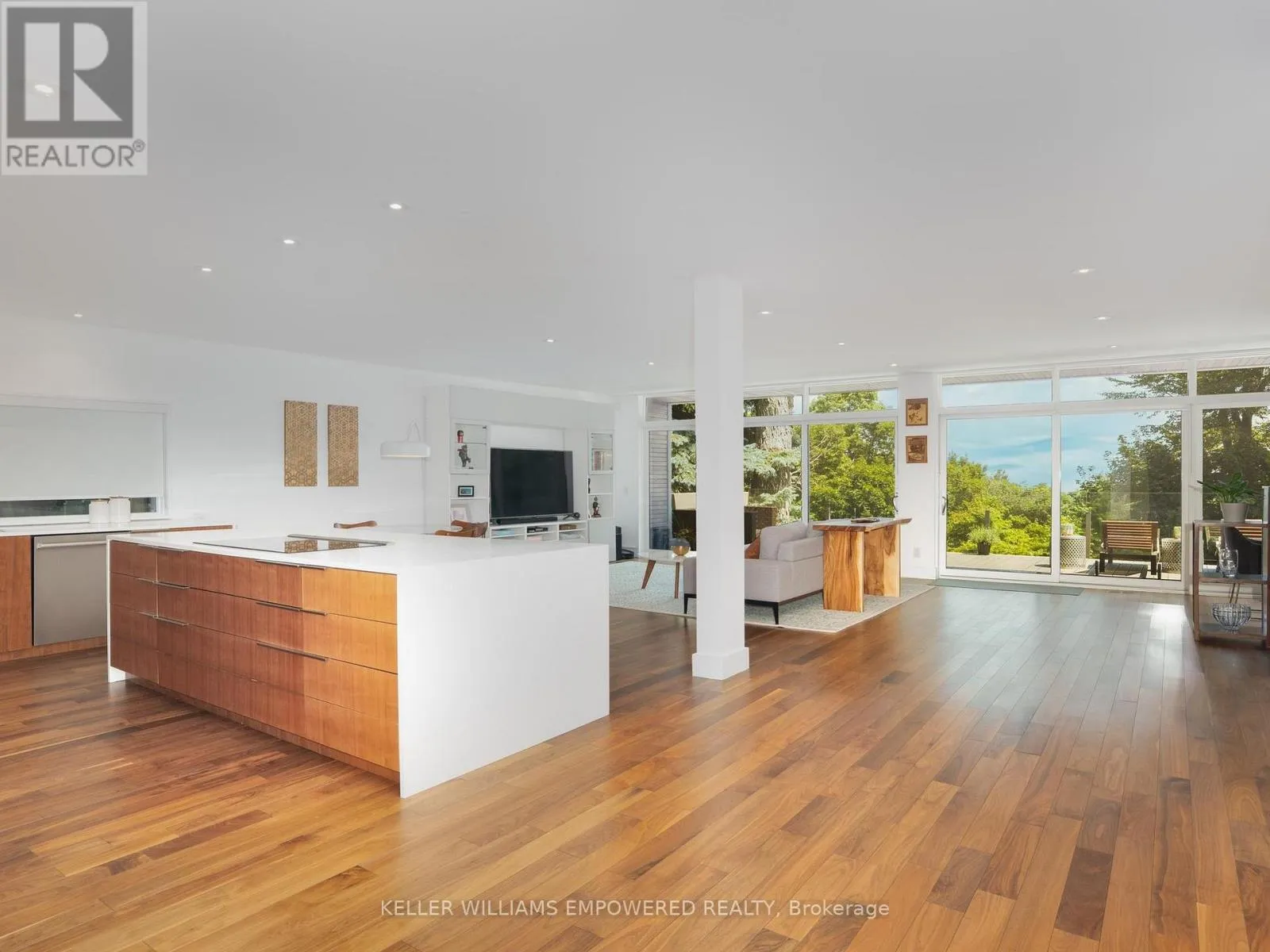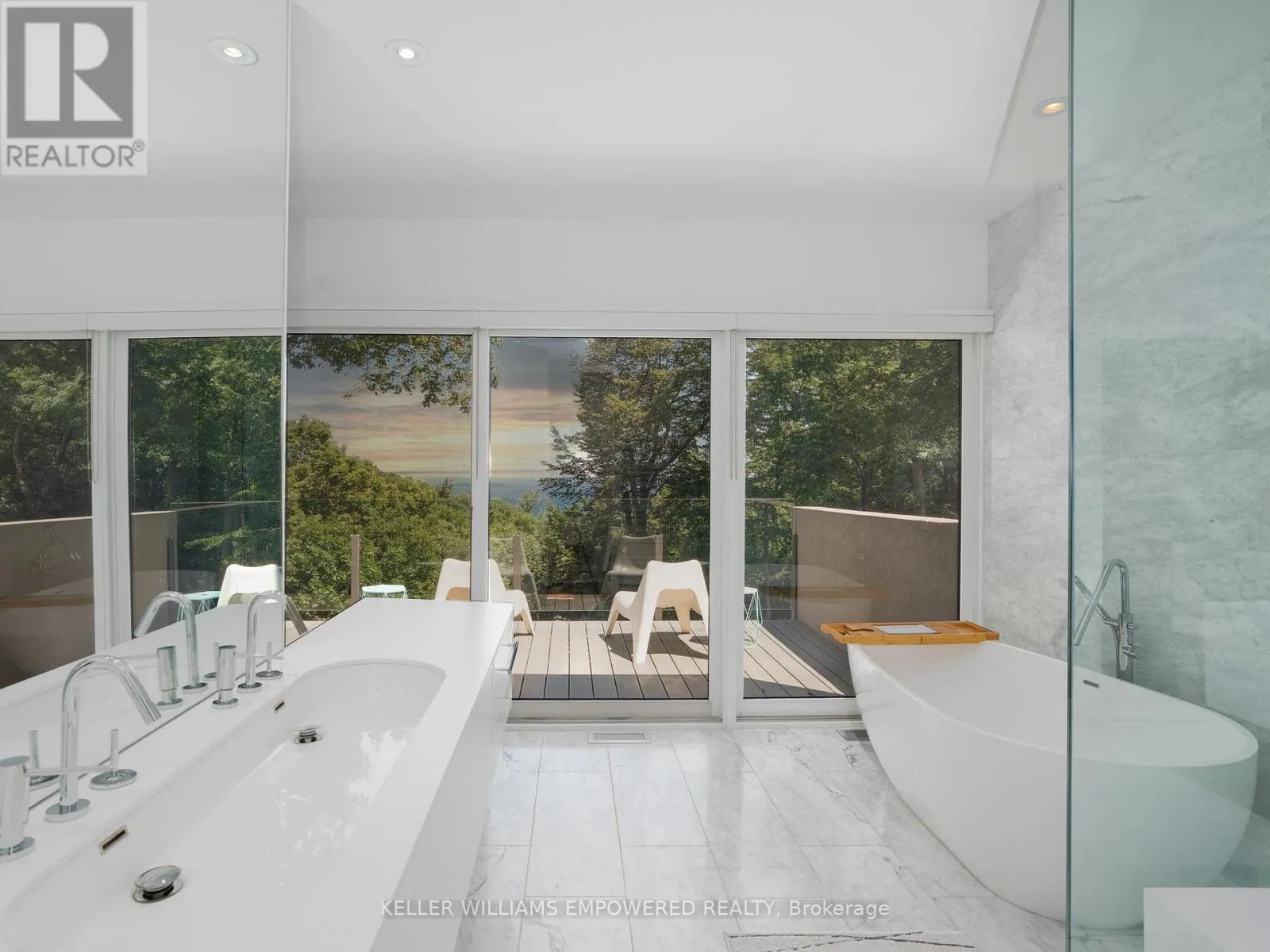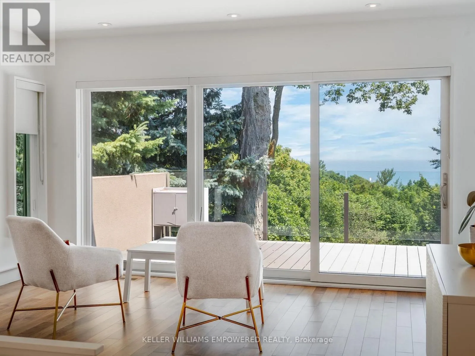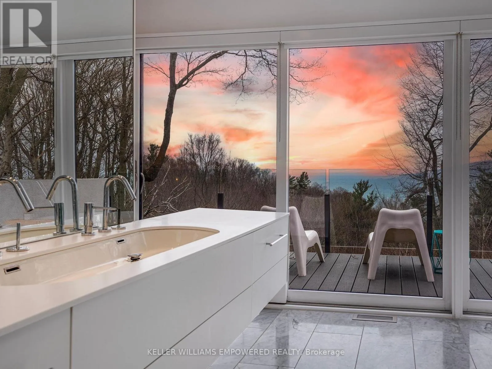 The main level is an entertainers dream, offering a seamless flow between the spacious living, dining, and family rooms, all adorned with pot lights and rich Walnut flooring. The chef-inspired kitchen is the heart of the home, boasting a dramatic waterfall island with Stone countertops, seating for four, and custom pull-out organizers. This space opens directly to multiple outdoor entertaining decks, perfect for hosting or relaxing while enjoying panoramic views. Ascend the striking open-riser Walnut staircase, framed with glass railings and stainless steel handrails, to find a luxurious primary retreat. The serene primary suite offers a private sanctuary, complete with its own balcony, window wall with lake views, a custom dressing room with skylight and extensive cabinetry, and a spa-like ensuite featuring heated floors and serene conservation views. The fully finished walk-out lower level adds even more space to unwind, with a large recreation room featuring heated floors and direct access to the beautifully landscaped rear grounds. Enjoy quiet evenings around the firepit or take advantage of the convenient access to the upper decks, seamlessly connecting indoor and outdoor living. This exceptional property offers the rare combination of modern luxury, privacy, and spectacular natural surroundings perfect for those who love to entertain or simply soak in the beauty of the outdoors. Video and audio may be on during viewings. (id:27476)