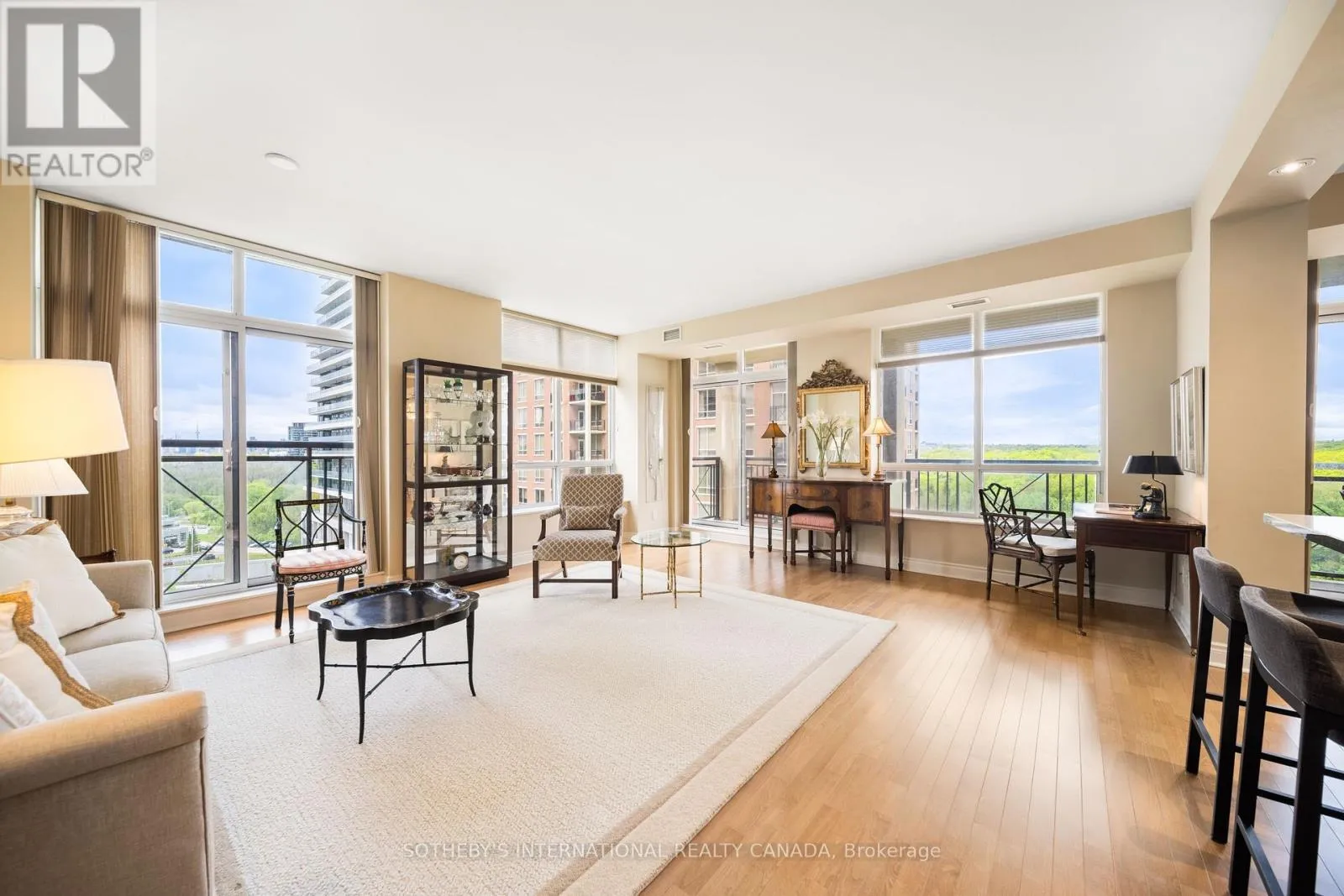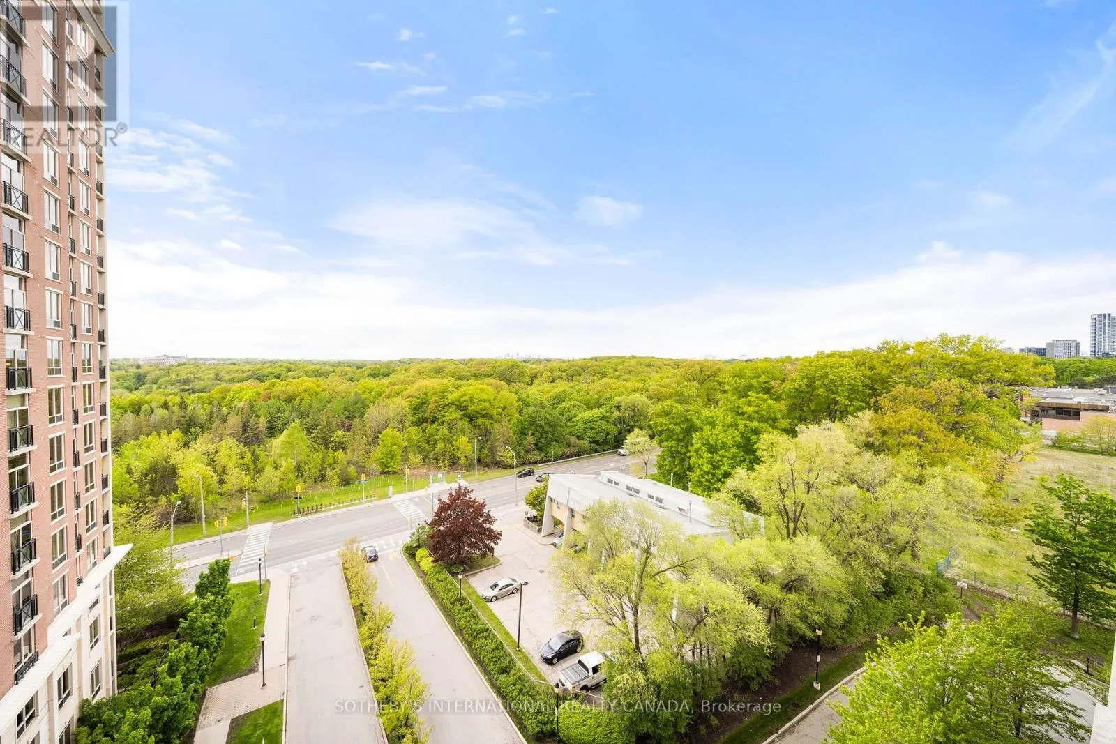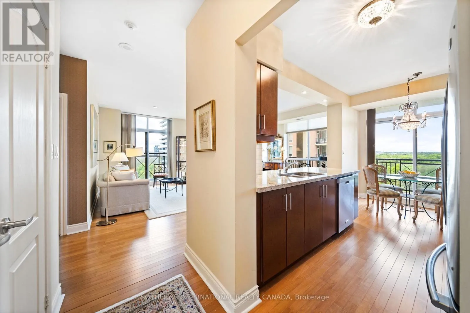 Eglinton & Leslie Fall in love with this outstanding light-filled Southwest corner suite w/serene views of Sunnybrook Park. Upon entering, you notice the soaring 9 ceilings, premium laminate flooring that looks & feels like hardwood & stunning park views. The highly desirable splitlayout is open concept & provides an airy feel. The beautiful & open kitchen is rarely offered in the complex & features an eat-in island, an abundance of stylish cabinetry & breakfast area.