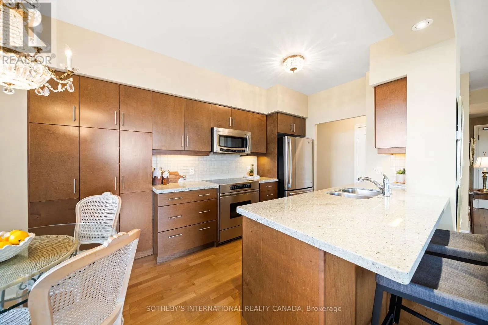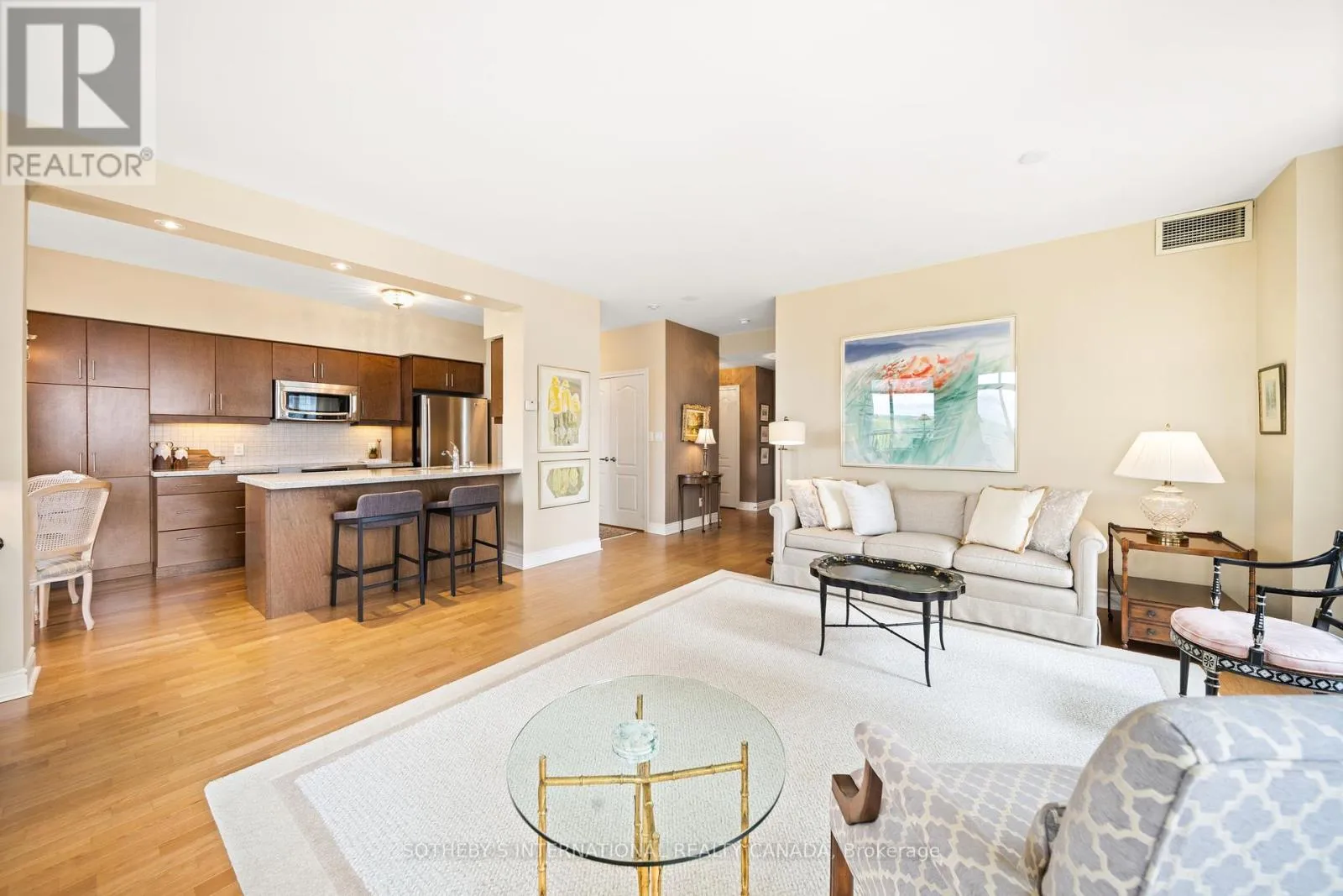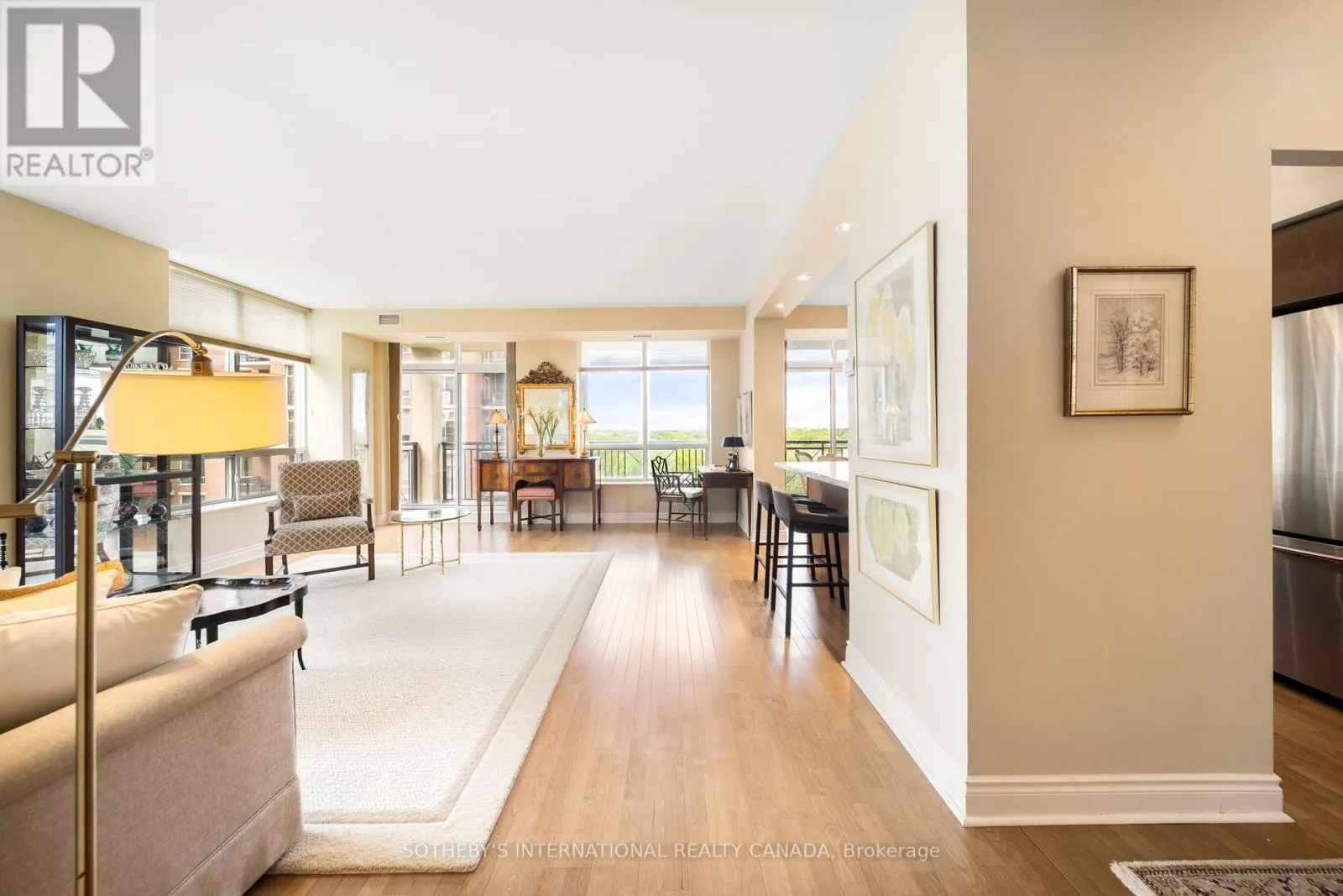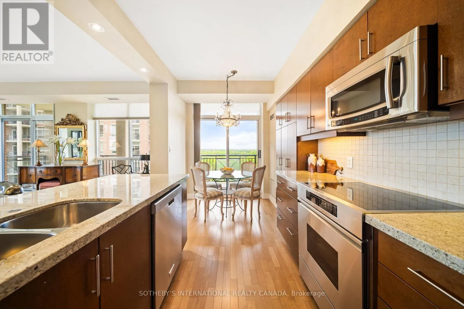 Eglinton & Leslie Fall in love with this outstanding light-filled Southwest corner suite w/serene views of Sunnybrook Park. Upon entering, you notice the soaring 9 ceilings, premium laminate flooring that looks & feels like hardwood & stunning park views. The highly desirable splitlayout is open concept & provides an airy feel. The beautiful & open kitchen is rarely offered in the complex & features an eat-in island, an abundance of stylish cabinetry & breakfast area.