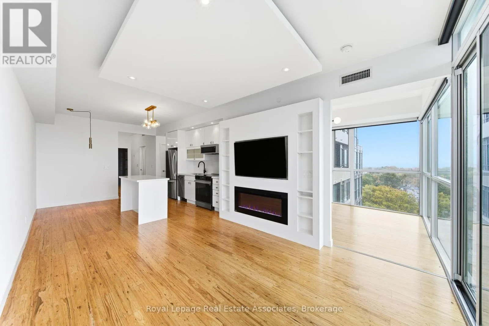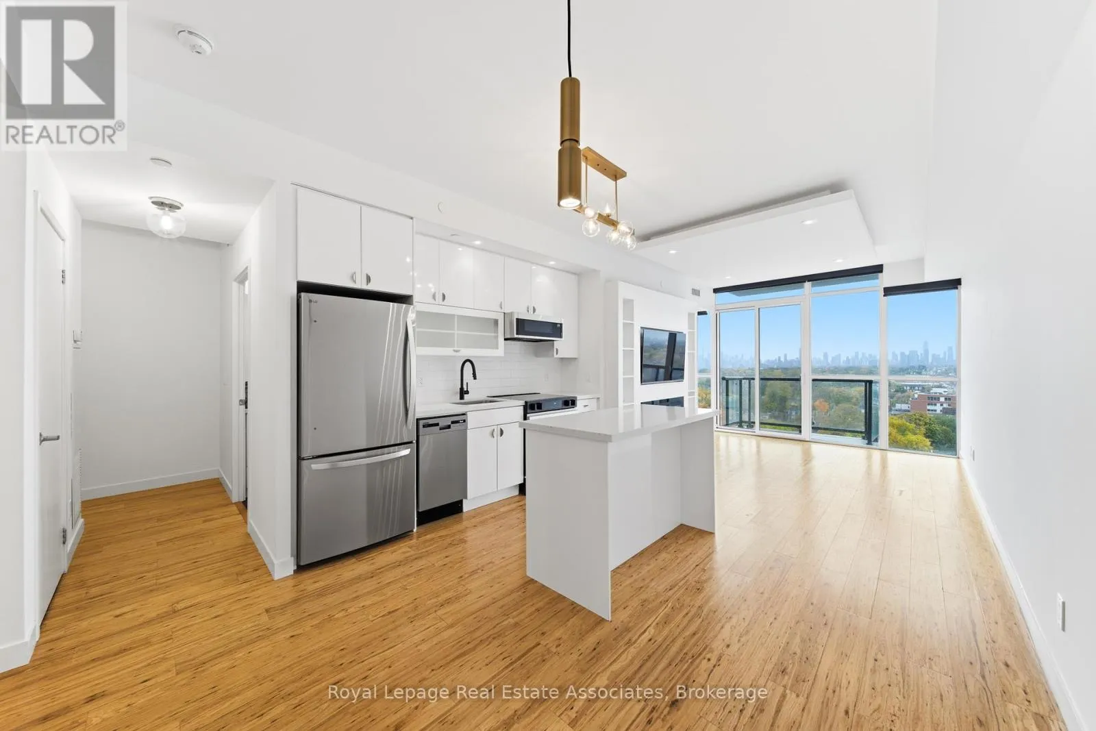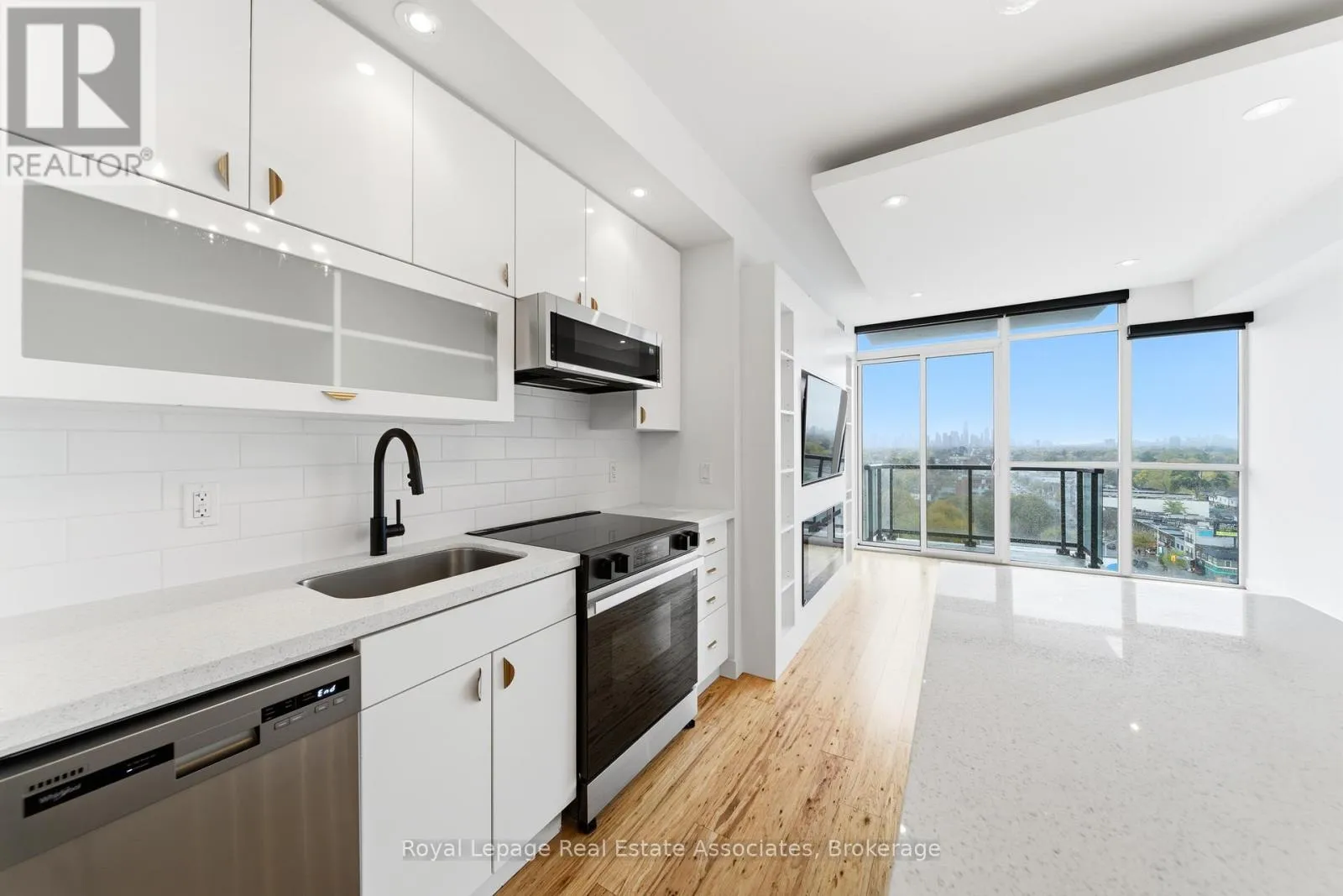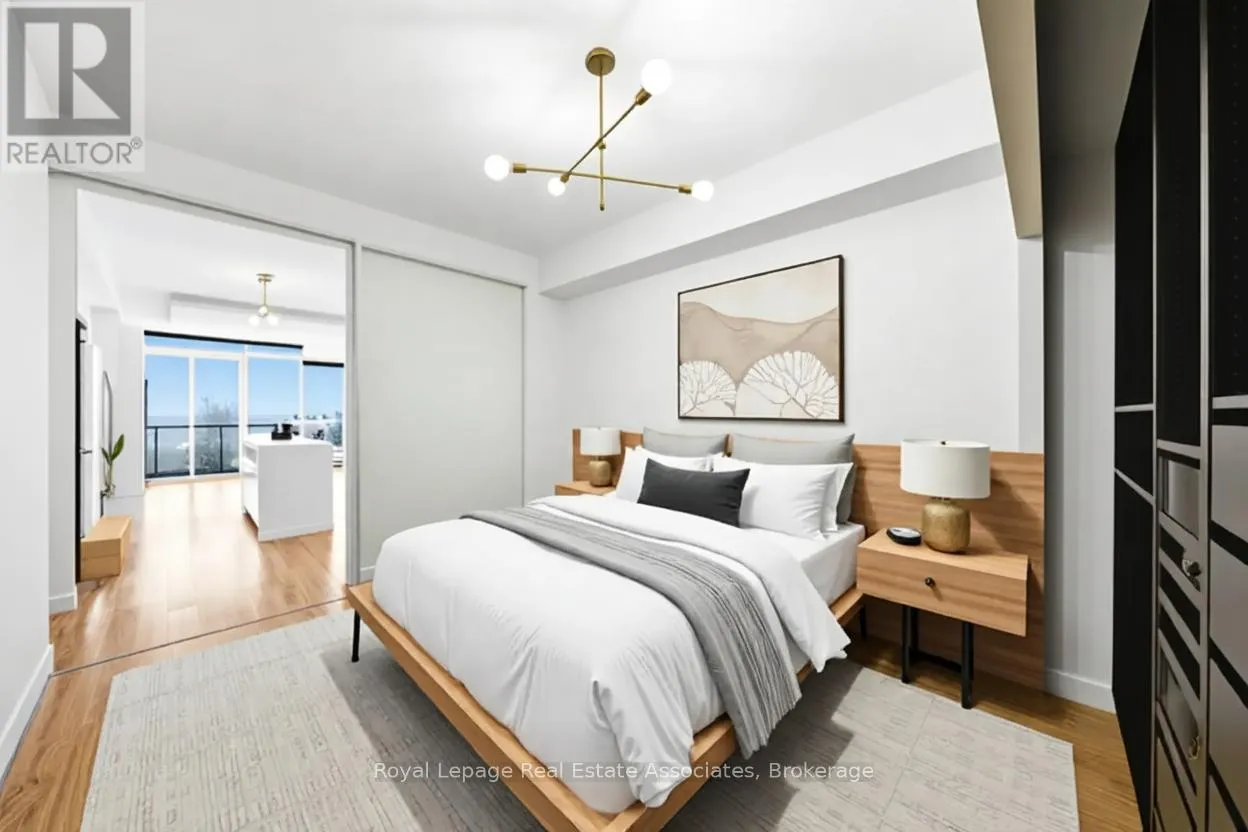 Thousands have been invested in premium upgrades and refined craftsmanship. Features include an abundance of natural light with floor to ceiling windows, custom closet organizing systems, a built-in entertainment unit with shelving, and an integrated fireplace, 9-foot ceilings, a striking drop ceiling with recessed lighting, a kitchen island and large balcony with sweeping views you'll never tire of. The designer kitchen is finished with brand-new stainless-steel appliances and quartz countertops. The primary suite includes a luxurious four-piece ensuite. Both bedrooms showcase double mirrored closets, tailored window treatments, and sophisticated custom lighting. A rare offering that blends exceptional finishes, breathtaking 360 views, and an upscale lifestyle. Steps to Woodbine Subway Station & TTC access. Enjoy being surrounded by quaint cafes, shops, restaurants and Greek Town. Walking distance to various grocery stores, neighbourhood amenities, Lynn Park, The Beaches, and so much more. (id:27476)