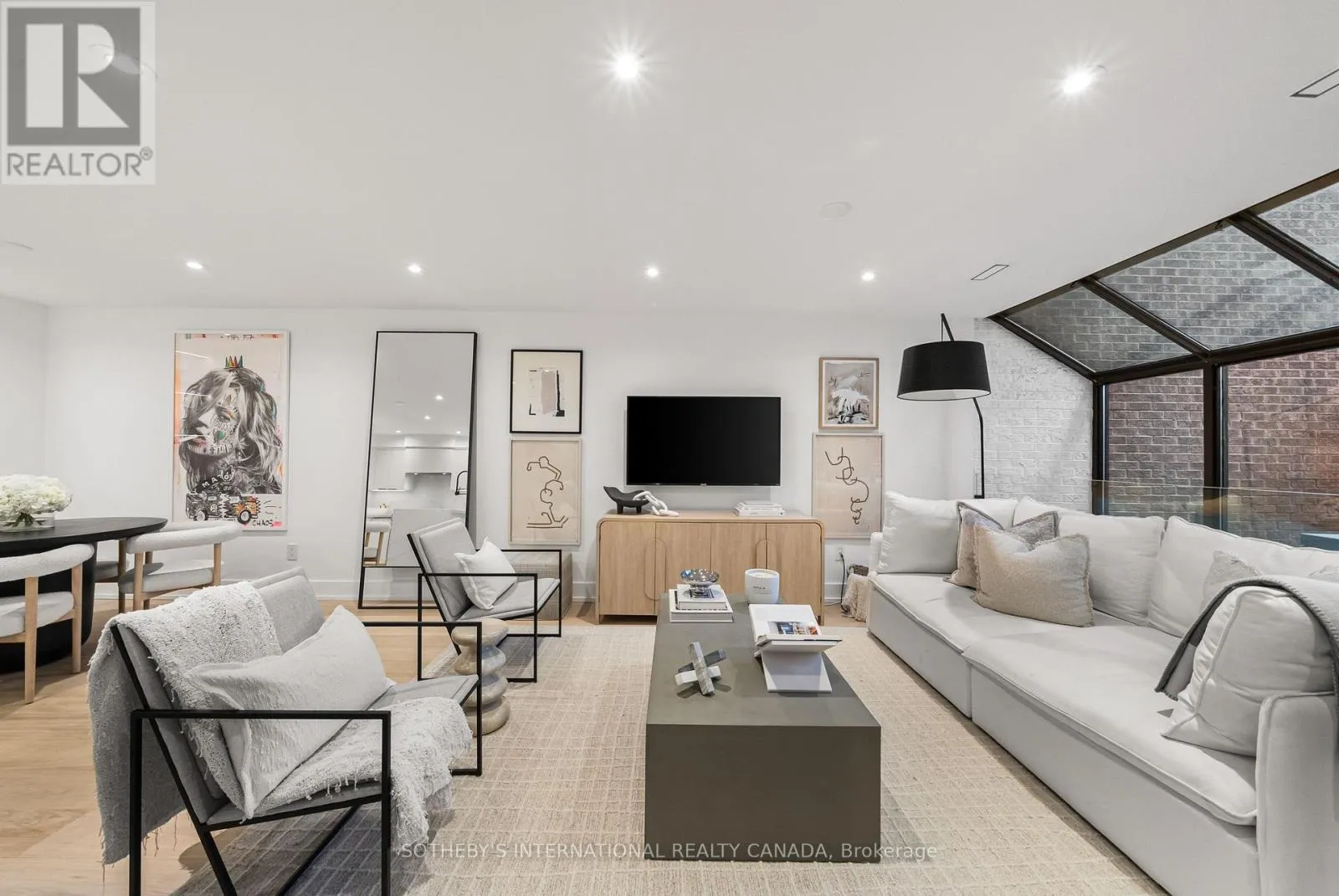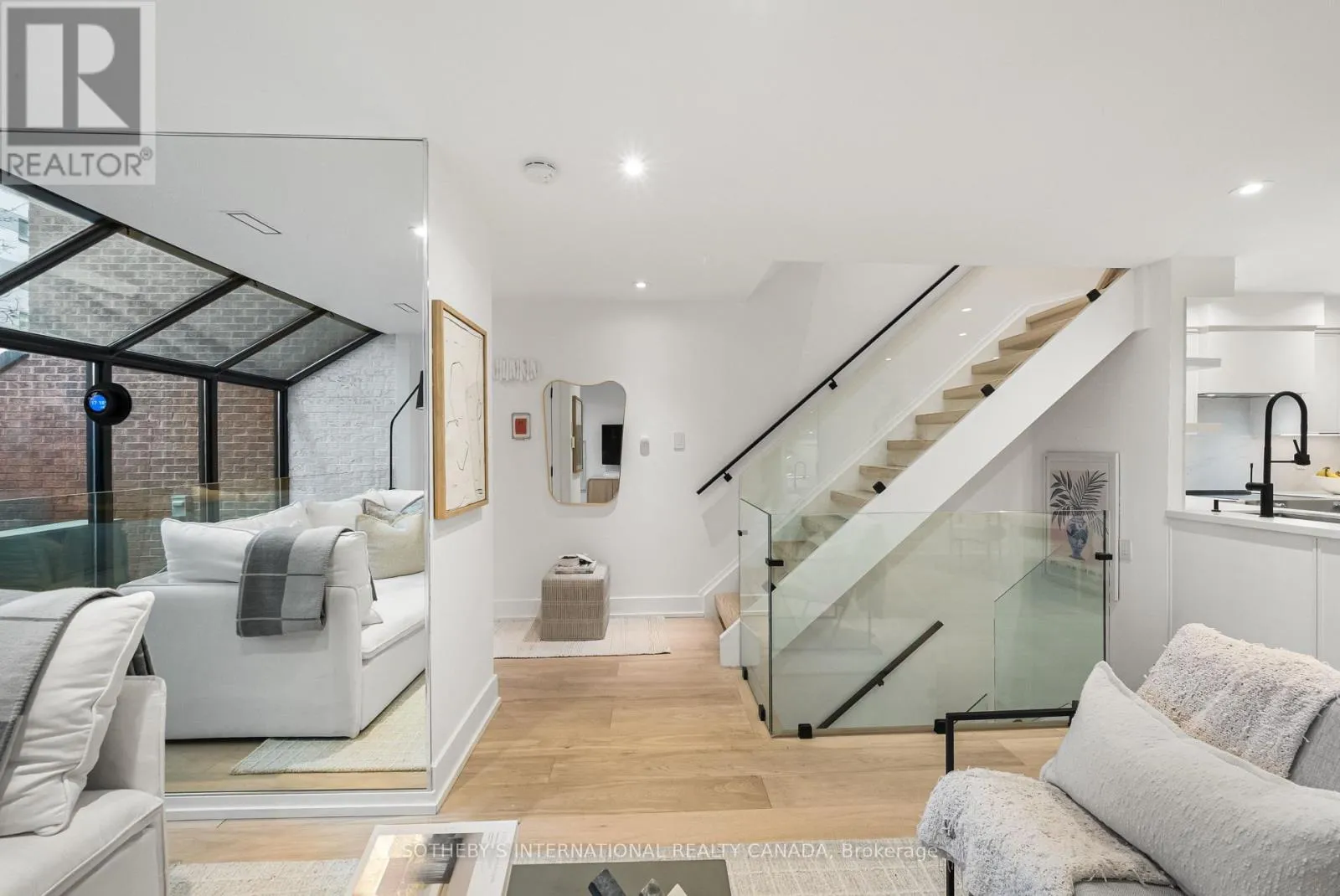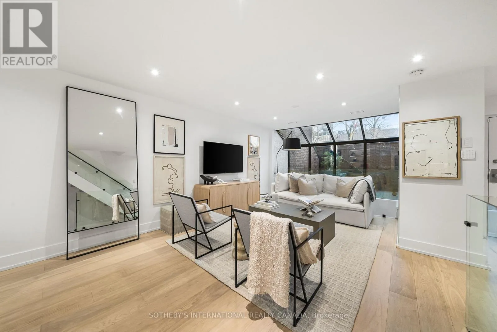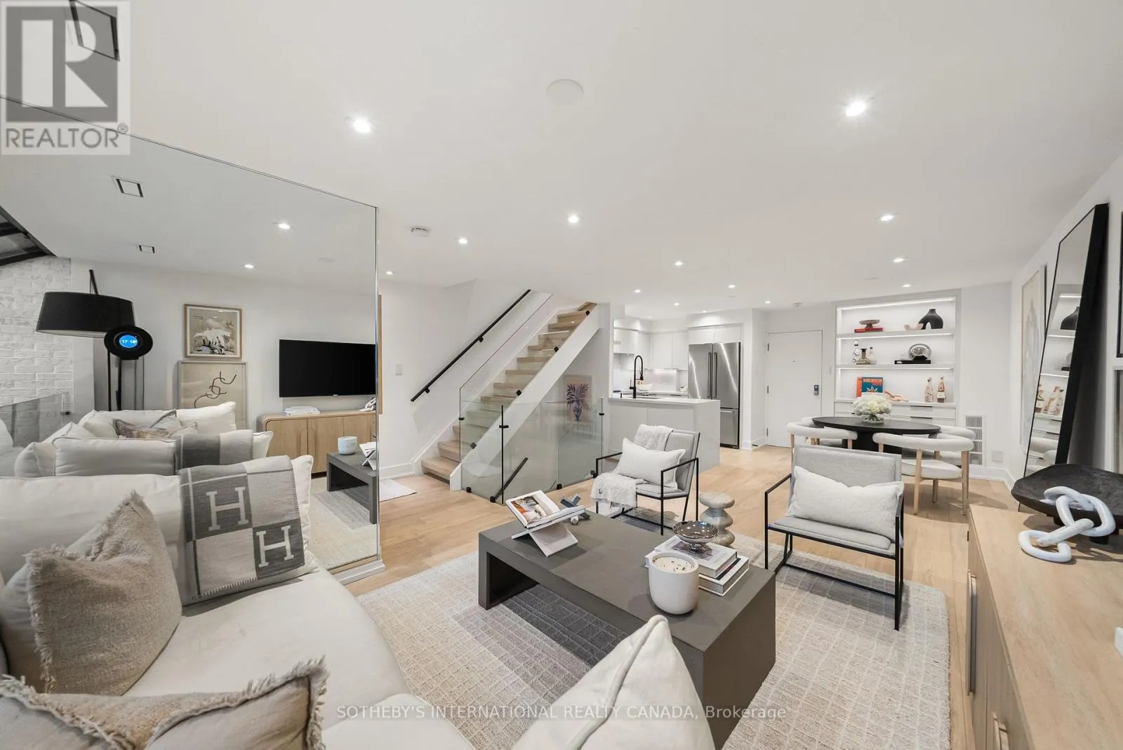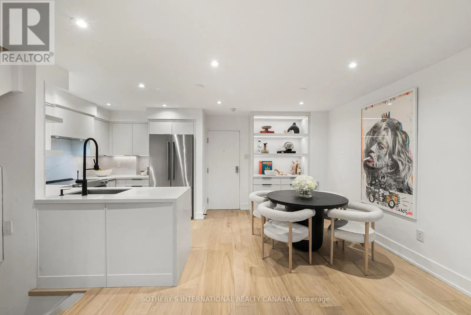 Inside, the home unfolds with intention & flow. The main level has been reimagined into a refined open-concept space where natural light pours through floor-to-ceiling windows, drawing your eye to the terrace & blurring the line between indoors & out. The living area feels expansive yet intimate, while the dining space is anchored by custom built-in shelving with integrated lighting. The kitchen is both striking & functional, featuring sleek cabinetry, clean lines, & a waterfall island. A thoughtful architectural detail sets this home apart: the main floor is open to below, allowing natural light to cascade into the lower level & transforming what is often an overlooked space into one of the home's most versatile & inviting areas. A spacious recreation room & flexible area offer potential for a home gym or additional bedroom, complemented by a 3-piece bath, laundry, & ample storage. The primary bedroom is expansive, overlooking the terrace below, with a large walk-in closet & a beautifully panelled feature wall that adds texture & quiet sophistication through classic picture-frame moulding. The 5-piece bathroom offers a spa-like retreat with refined finishes & dual rain shower heads. A bright second bedroom includes custom wall-to-wall closets. Enhancing the living experience, residents enjoy access to a serene outdoor pool, a recently renovated recreation room, separate women's & men's saunas, & an elegant party room. Complete with underground parking & a locker, this is a rare offering in one of Toronto's most coveted neighbourhoods. (id:27476)