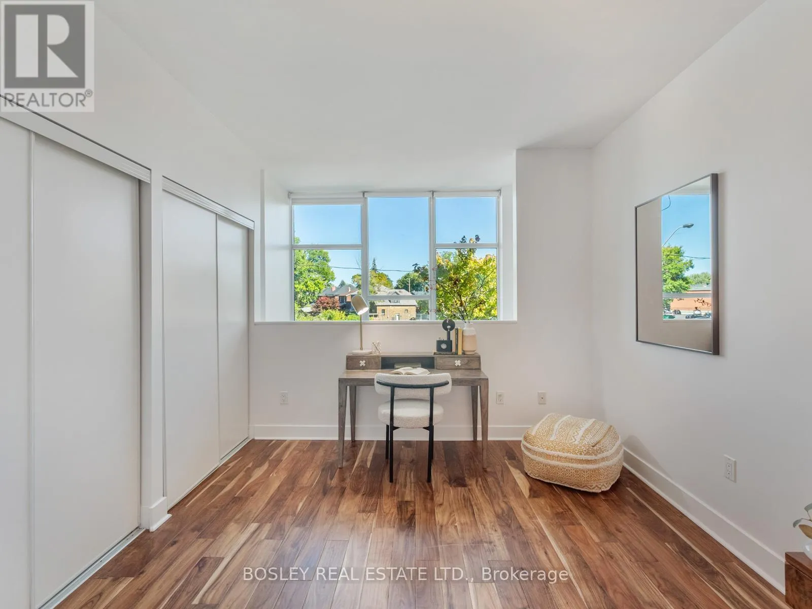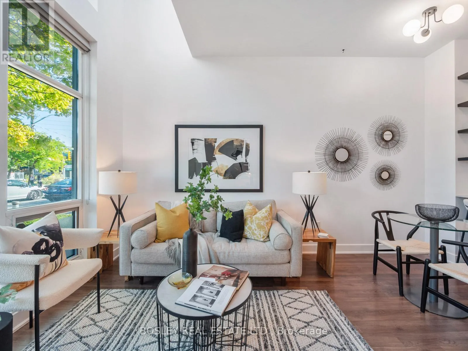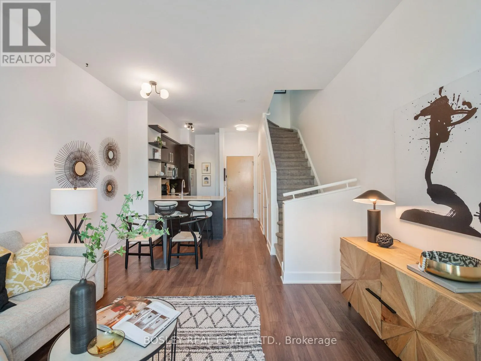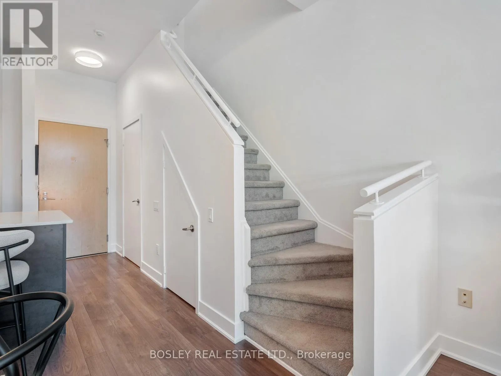Broadview & Mortimer Townhouse-style living meets condo convenience in this spacious 1 bedroom + den, 2 bathroom end unit at 1048 Broadview Ave. With nearly 800 sq ft, soaring 20' ceilings, and dramatic two-storey windows, the space feels bright and airy. The main level offers an open-concept living/dining area, kitchen with breakfast bar, convenient powder room, and rare dual entrances with direct street access or through the building.