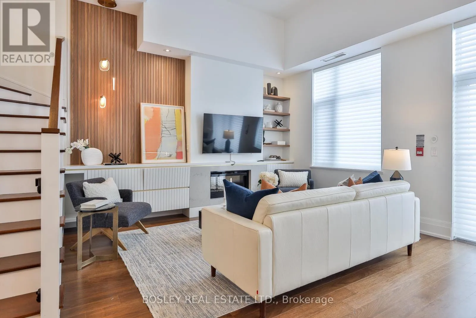 A show-stopping, wall-to-wall custom entertainment unit anchors the living room, complete with bespoke cabinetry, pot lights, decorative wood paneling, and a contemporary fireplace with mantle & wall-mounted TV with statement light fixture. The dining area sits perfectly between the living room and terrace walk-out, making it ideal for dinners by the fireplace as well as enjoying abundant natural light while at breakfast. The modern chef's kitchen is outfitted with top-of-the-line appliances, including a paneled fridge, dishwasher, and paneled pantry offering functionality while maintaining symmetry. The main floor also includes a large den/office with a double-door closet, which can easily be converted to a third bedroom by adding a wall & glazed French door for privacy. Don't miss the powder rm on the main floor. The upper level enjoys an oversized family room with a 2nd wall-mounted TV (all tvs included) for family movie nights. The principal bedroom features a walk-out to a second outdoor space, his & hers closets and a spa-like ensuite with a glassed-in shower, soaker tub, and double sinks. The 4 PC bath serves the 2 bdrm and family rm. This fabulous offering includes parking and locker. Note this is a pet-friendly building complete with a pet-spa and no size restrictions for your fur babies. A rare opportunity to own a refined townhouse with exceptional design and superior quality finishes (refer to attached Features & Upgrades) in the heart of Leaside! In the top-tier Rolph Rd ES, Bessboroug Dr MS & Leaside High School district. (id:27476)